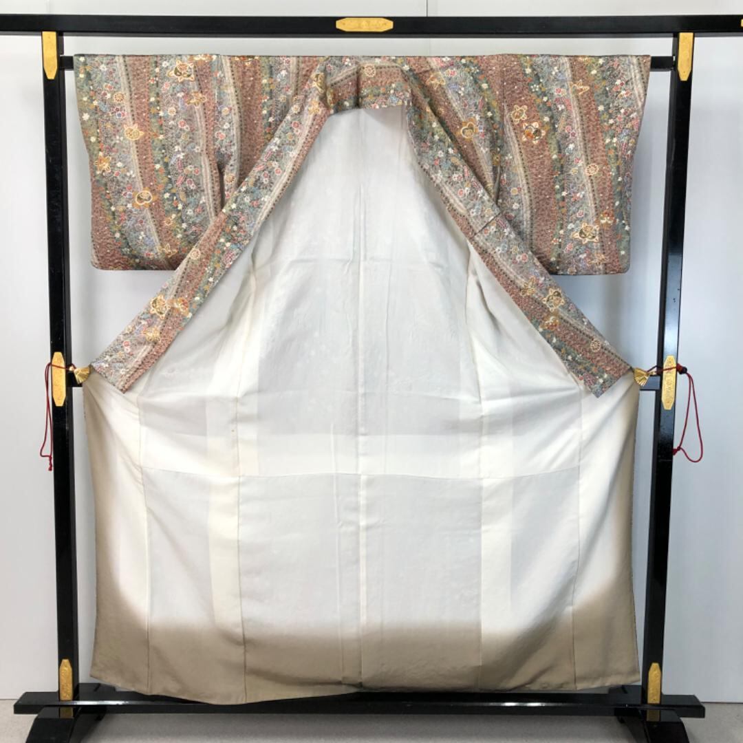 小紋 斜め柄の多様な花模様 茶鼠色 金彩 K-5058 着物 きもの kimono 和服 和装 中古 リサイクル着物 【送料無料】