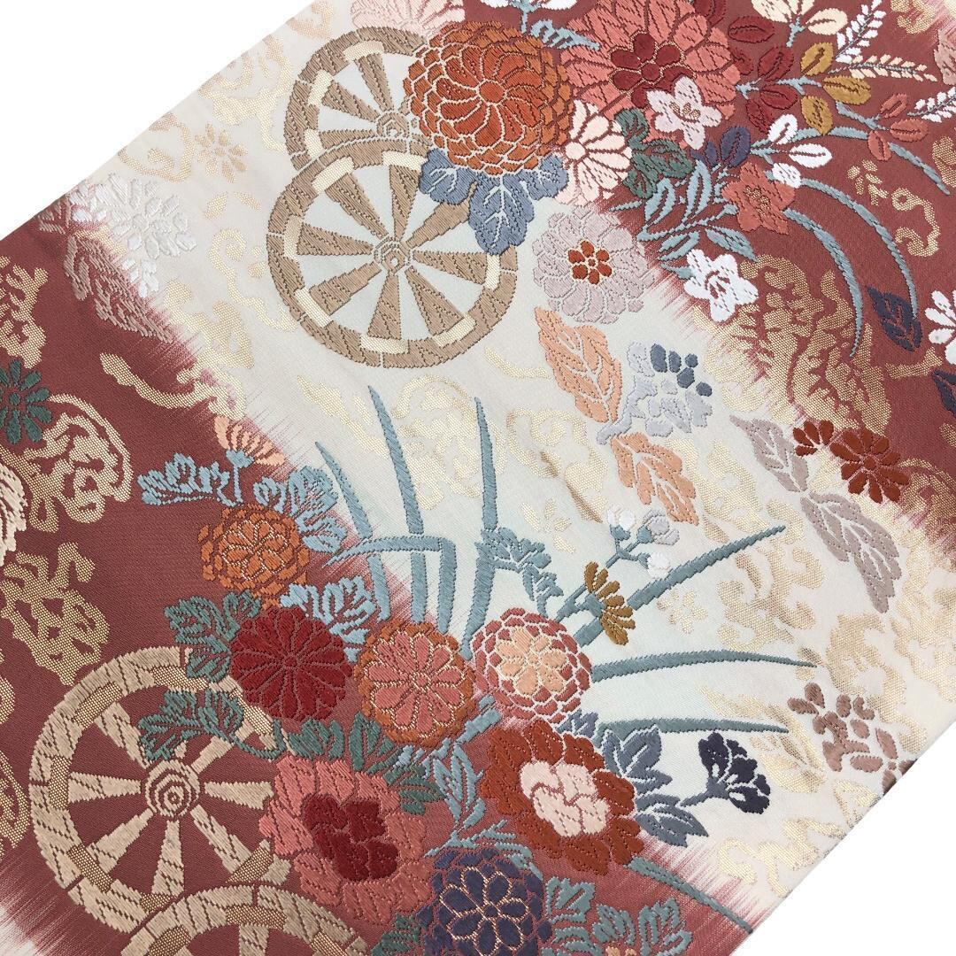 乳白色ベースお色味の横縞模様、唐織の花車の華やかな柄裄がデザインされた素敵なお品でございます。
