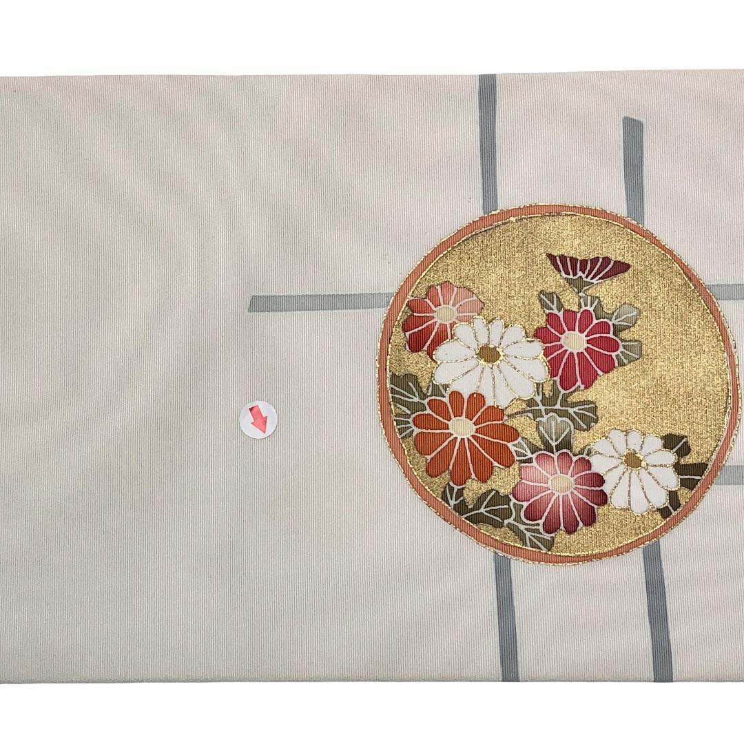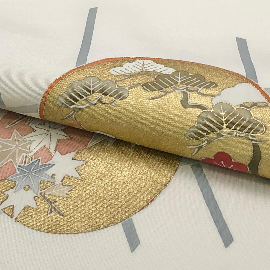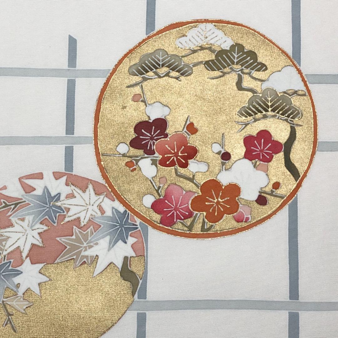 生成色の上品なお色味、丸に花模様、松などの柄裄がデザインされた素敵なお品でございます。