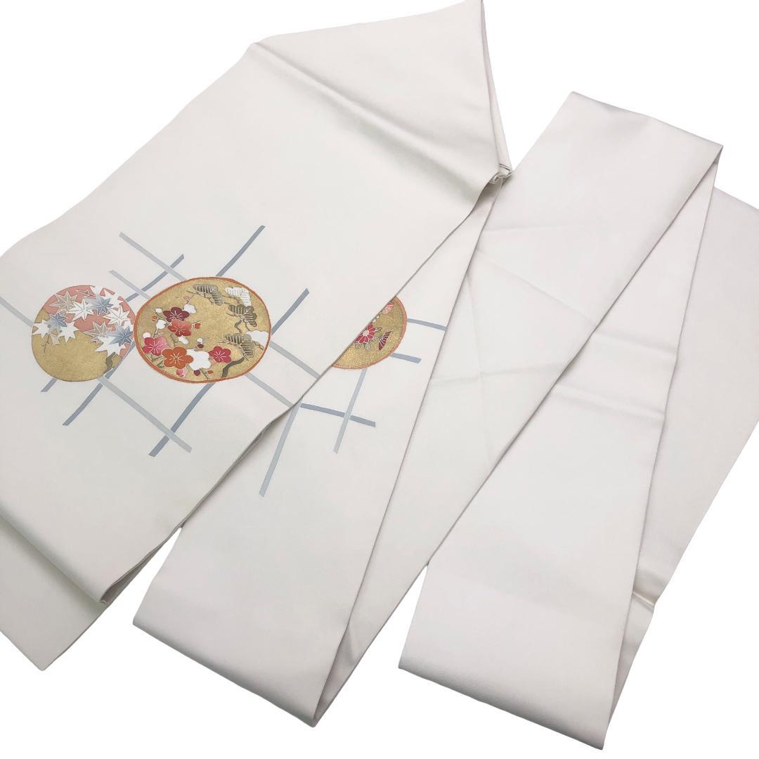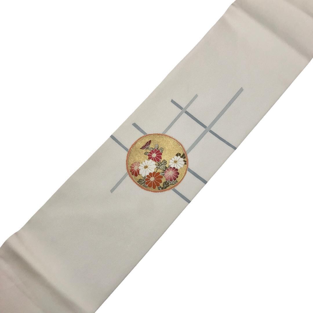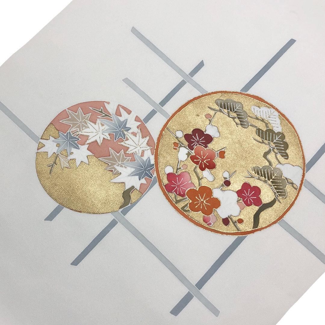 生成色の上品なお色味、丸に花模様、松などの柄裄がデザインされた素敵なお品でございます。