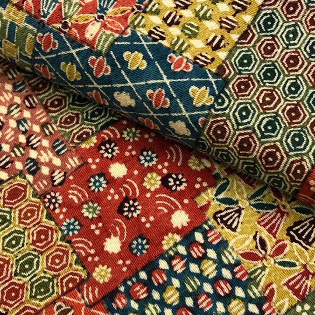 猩々茶色ベースのお色味の縮緬地に多様な柄裄の型染がデザインされた素敵なお品でございます。