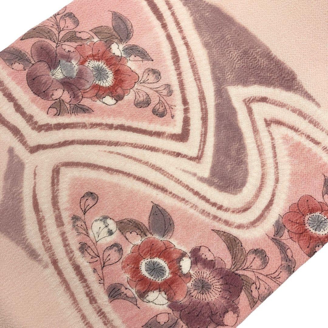 薄珊瑚色のお色味の縮緬地に絞り、辻が花模様の柄裄がデザインされた雰囲気の良い素敵なお品でございます。
