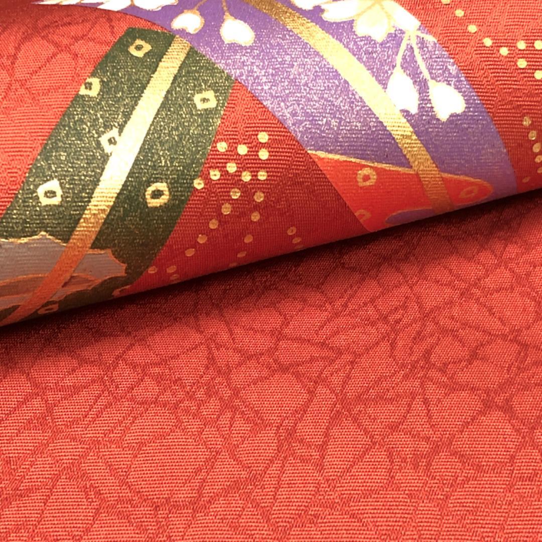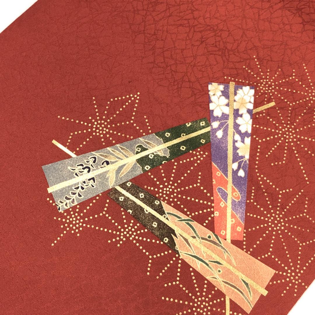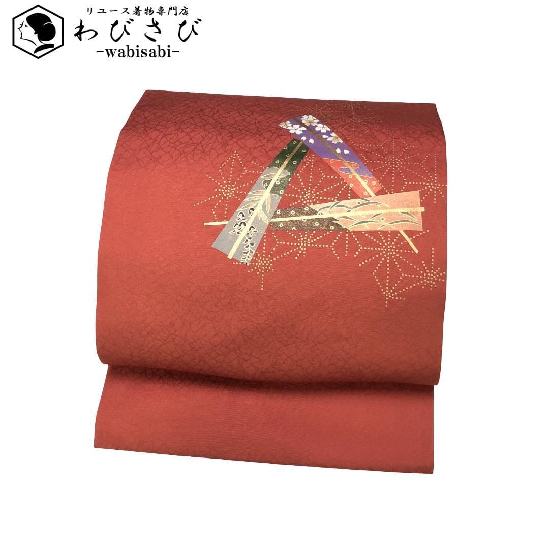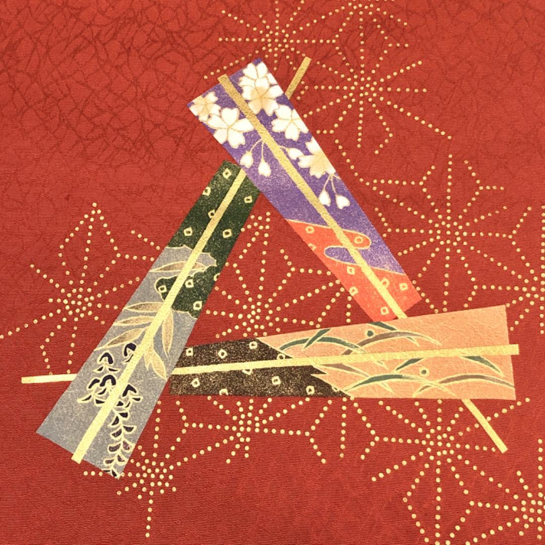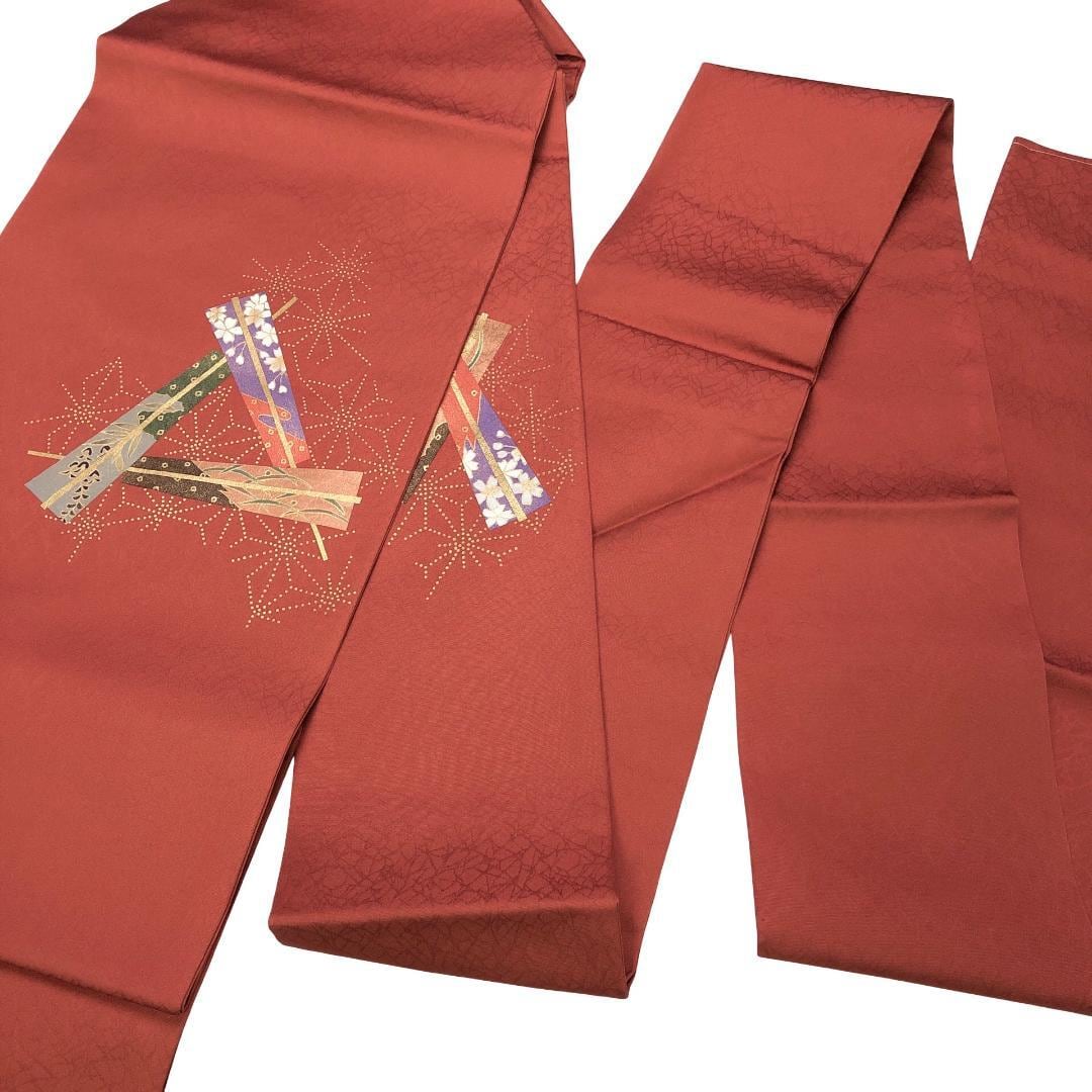 紅柿色のお色味に扇子に花模様、麻の葉の柄行がデザインされた素敵なお品でございます。