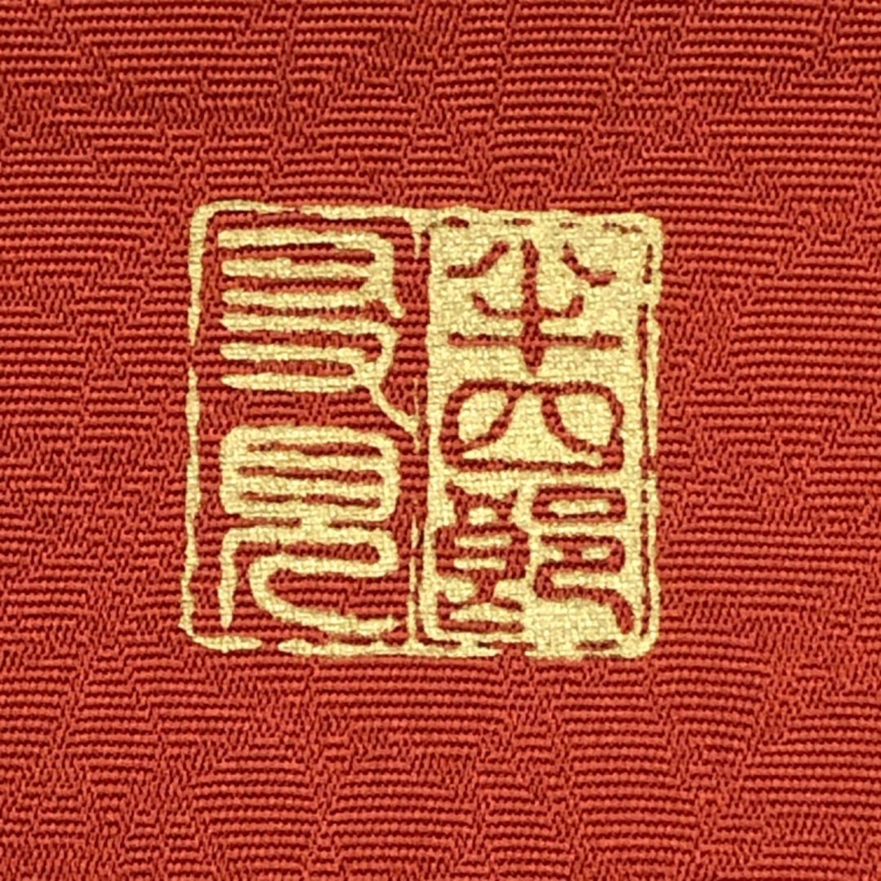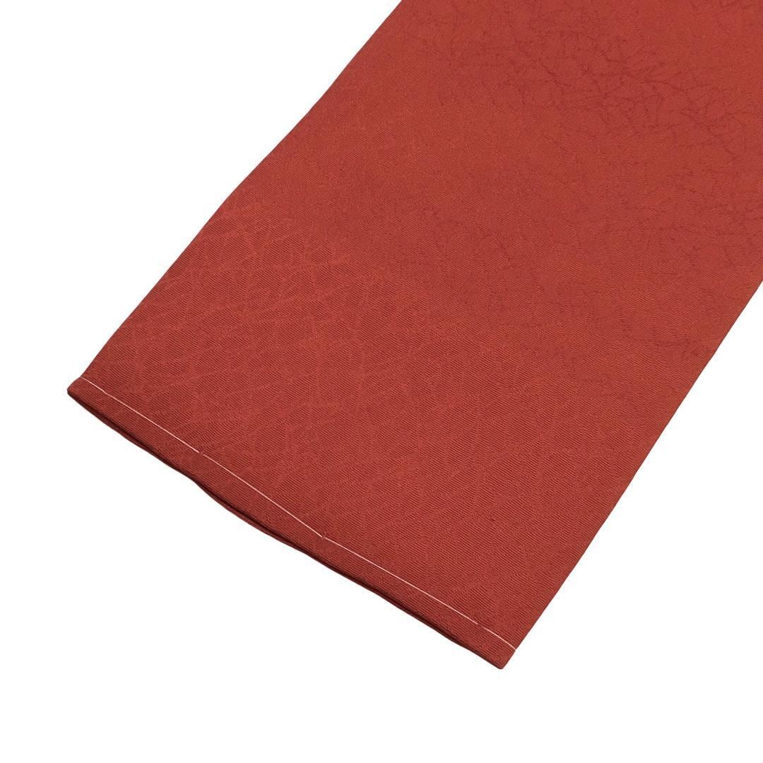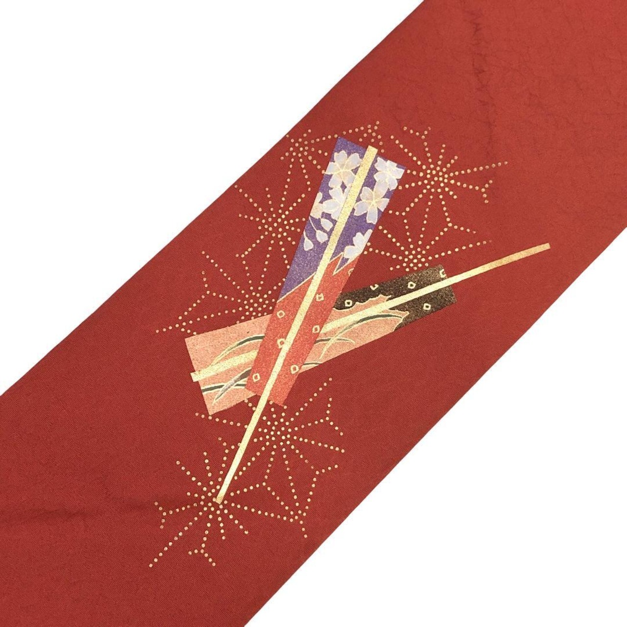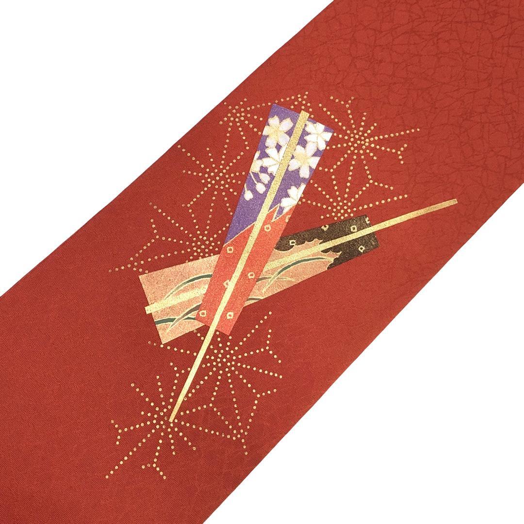 紅柿色のお色味に扇子に花模様、麻の葉の柄行がデザインされた素敵なお品でございます。