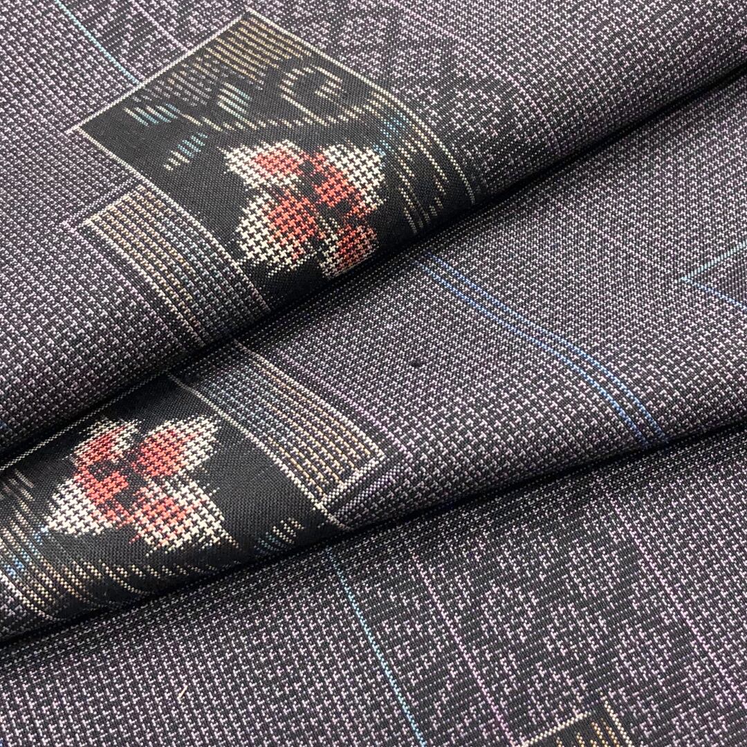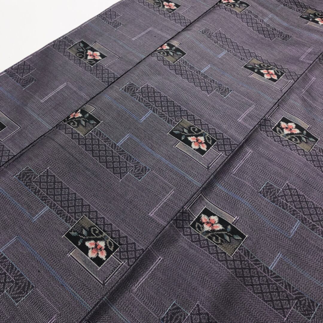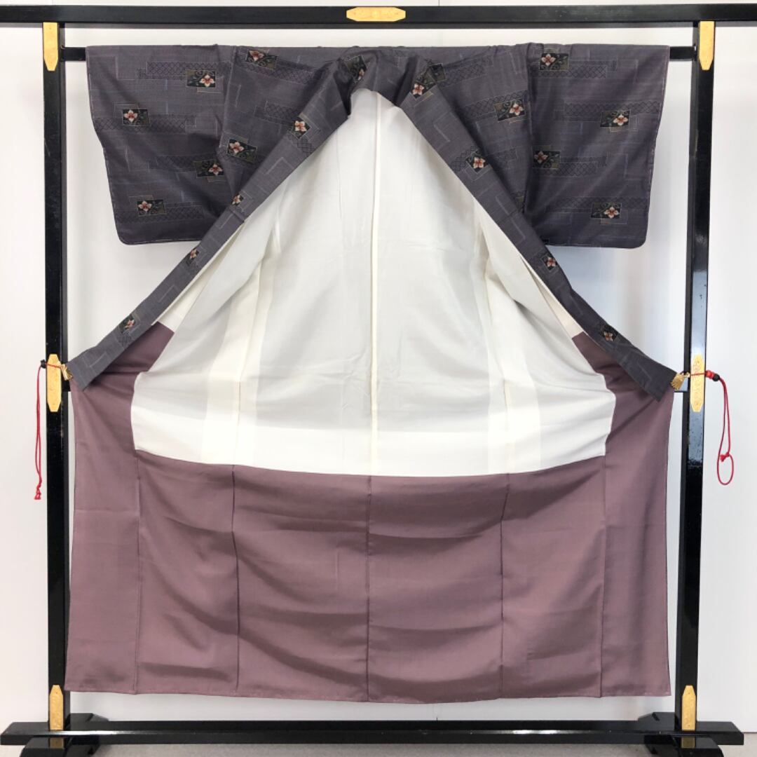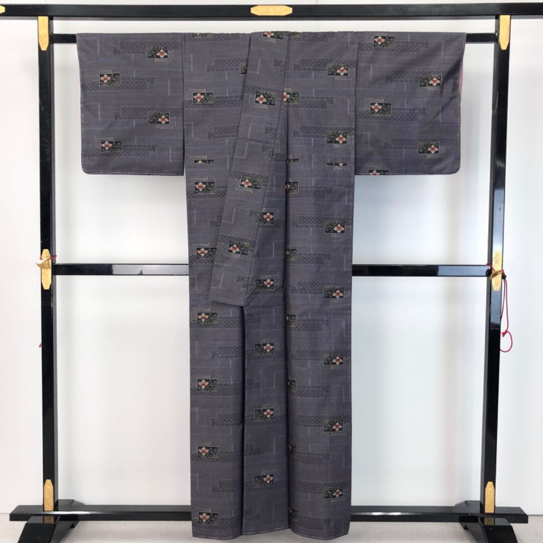 相思鼠色のお色味に四角に花模様の柄裄がデザインされた素敵なお品でございます。