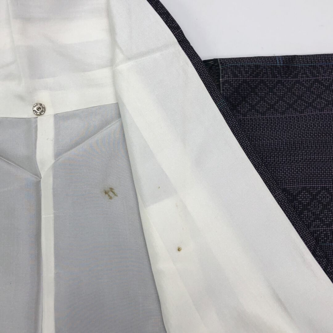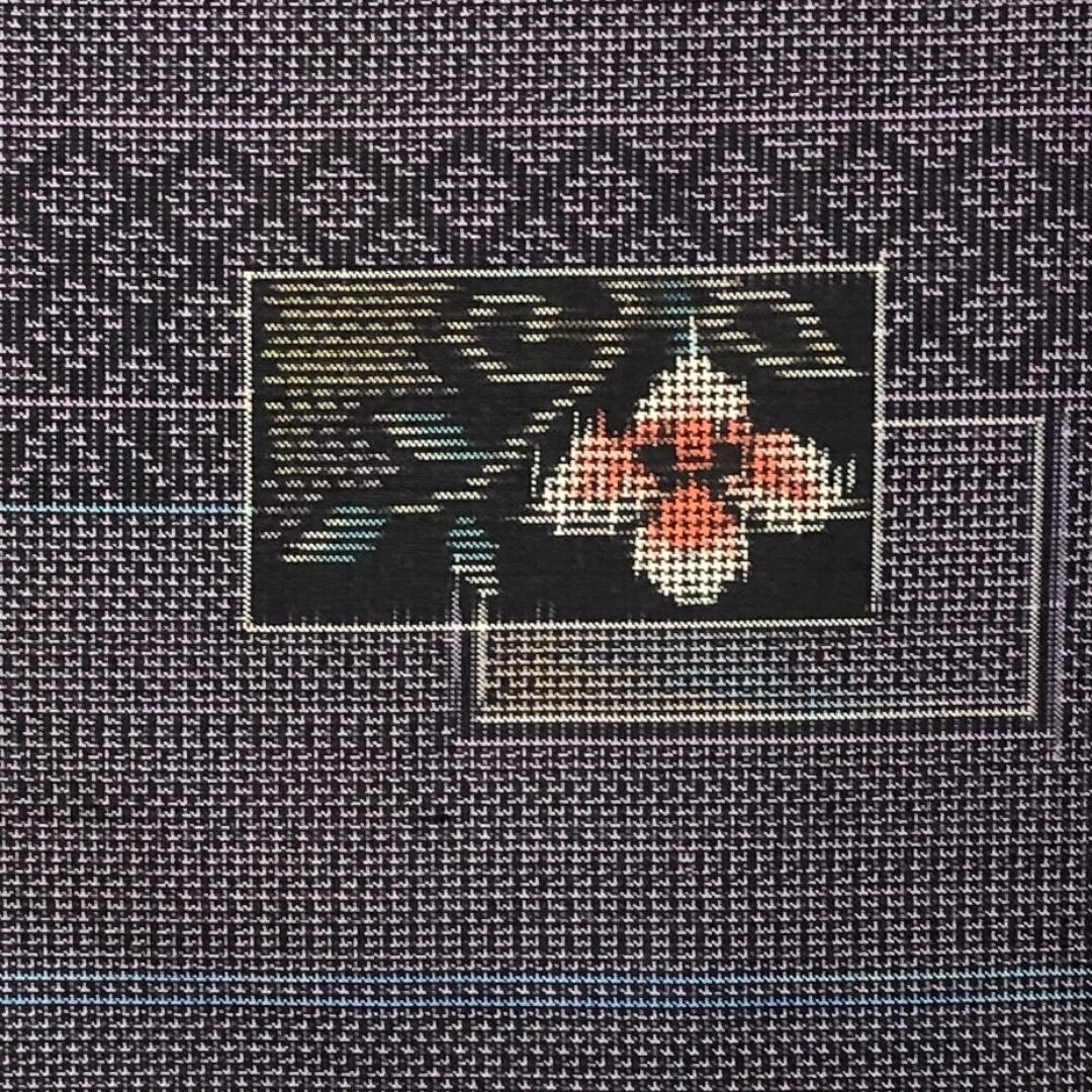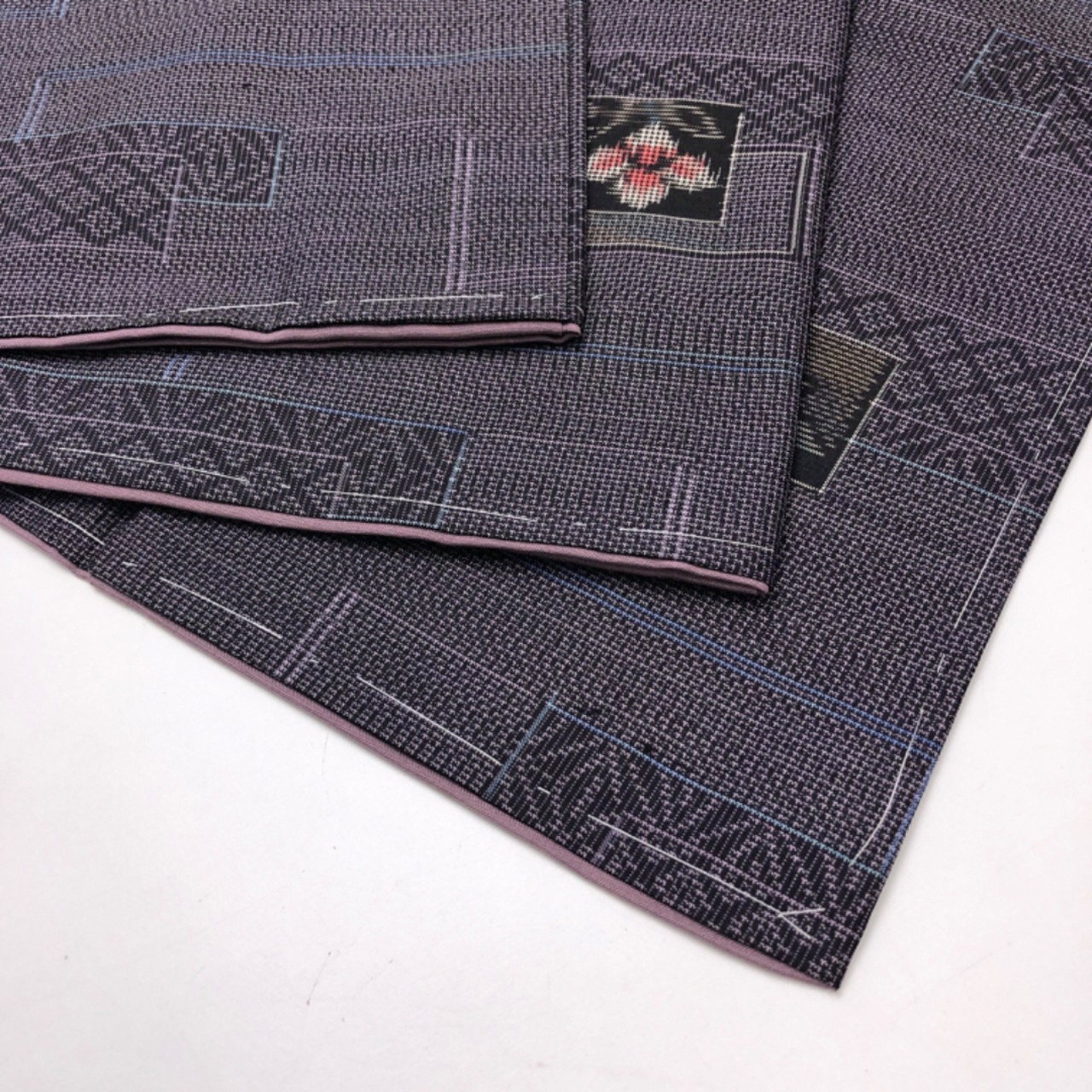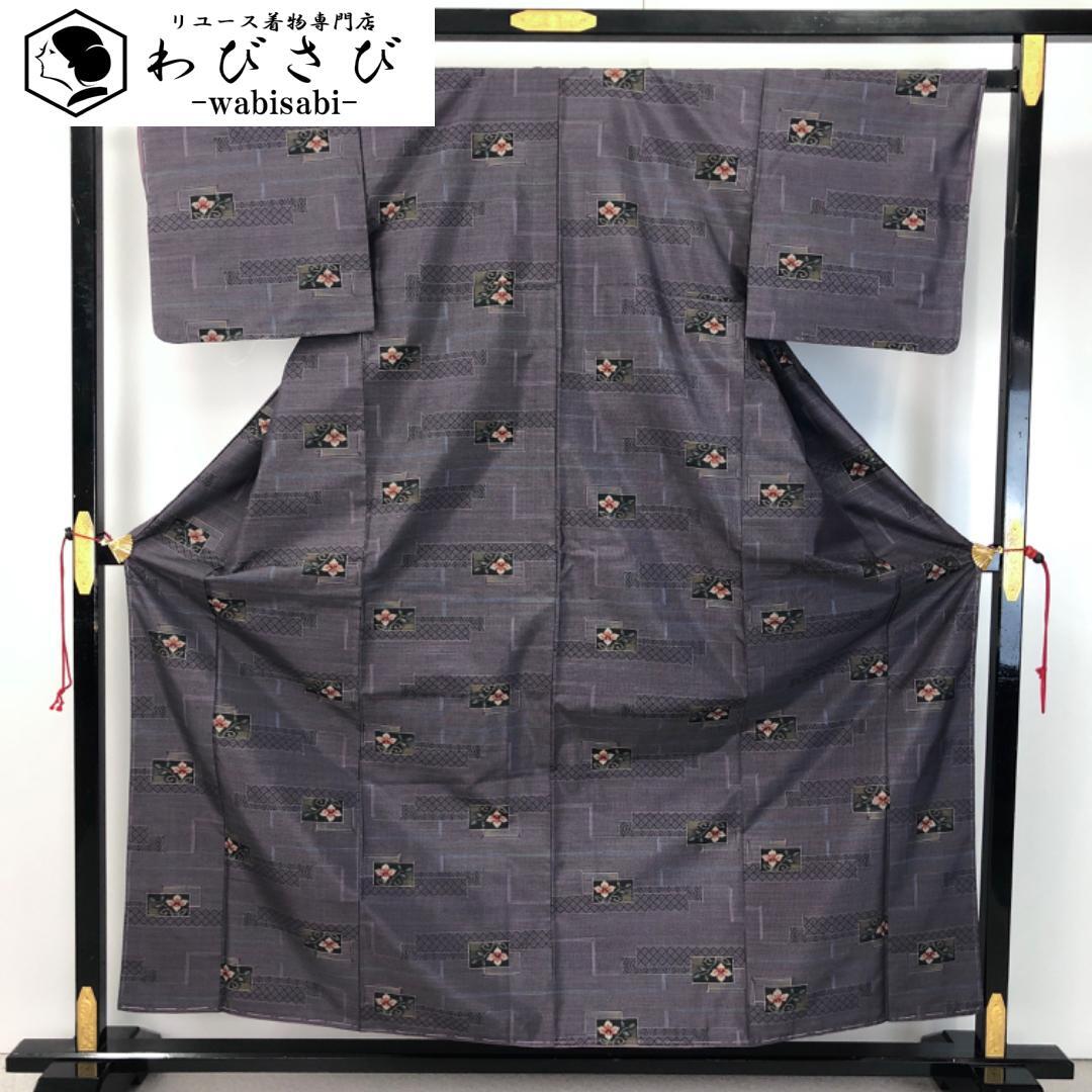 相思鼠色のお色味に四角に花模様の柄裄がデザインされた素敵なお品でございます。