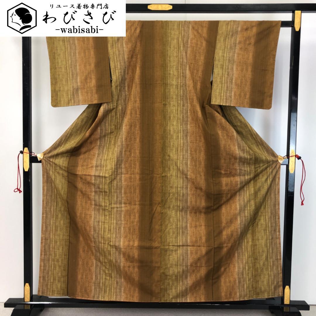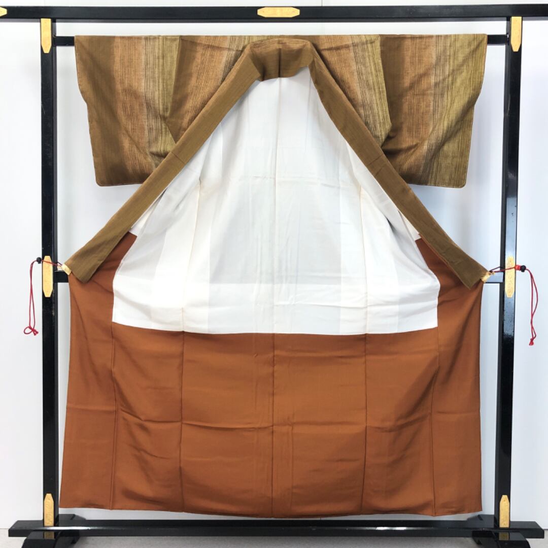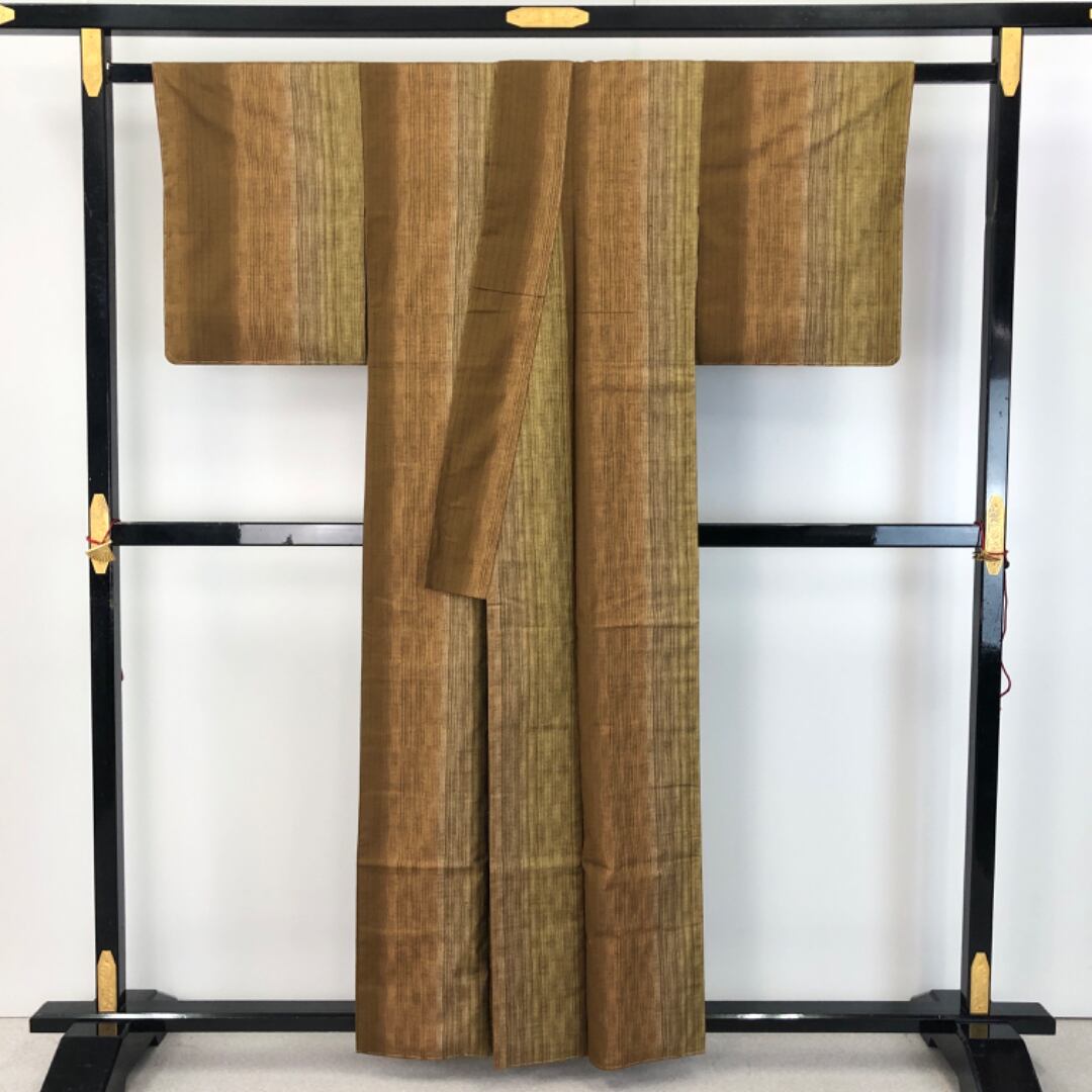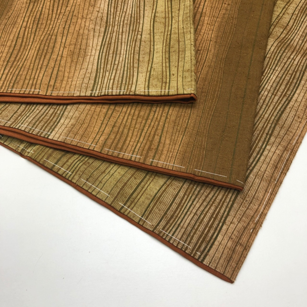 壁土色ベースの雰囲気の良いお色味に縦縞模様の柄裄がデザインされた素敵なお品でございます。