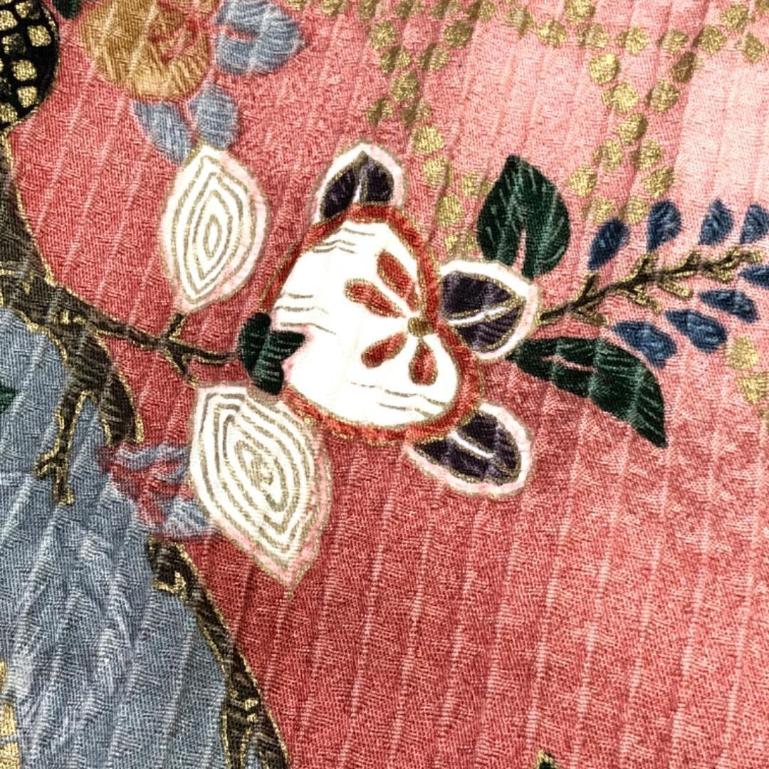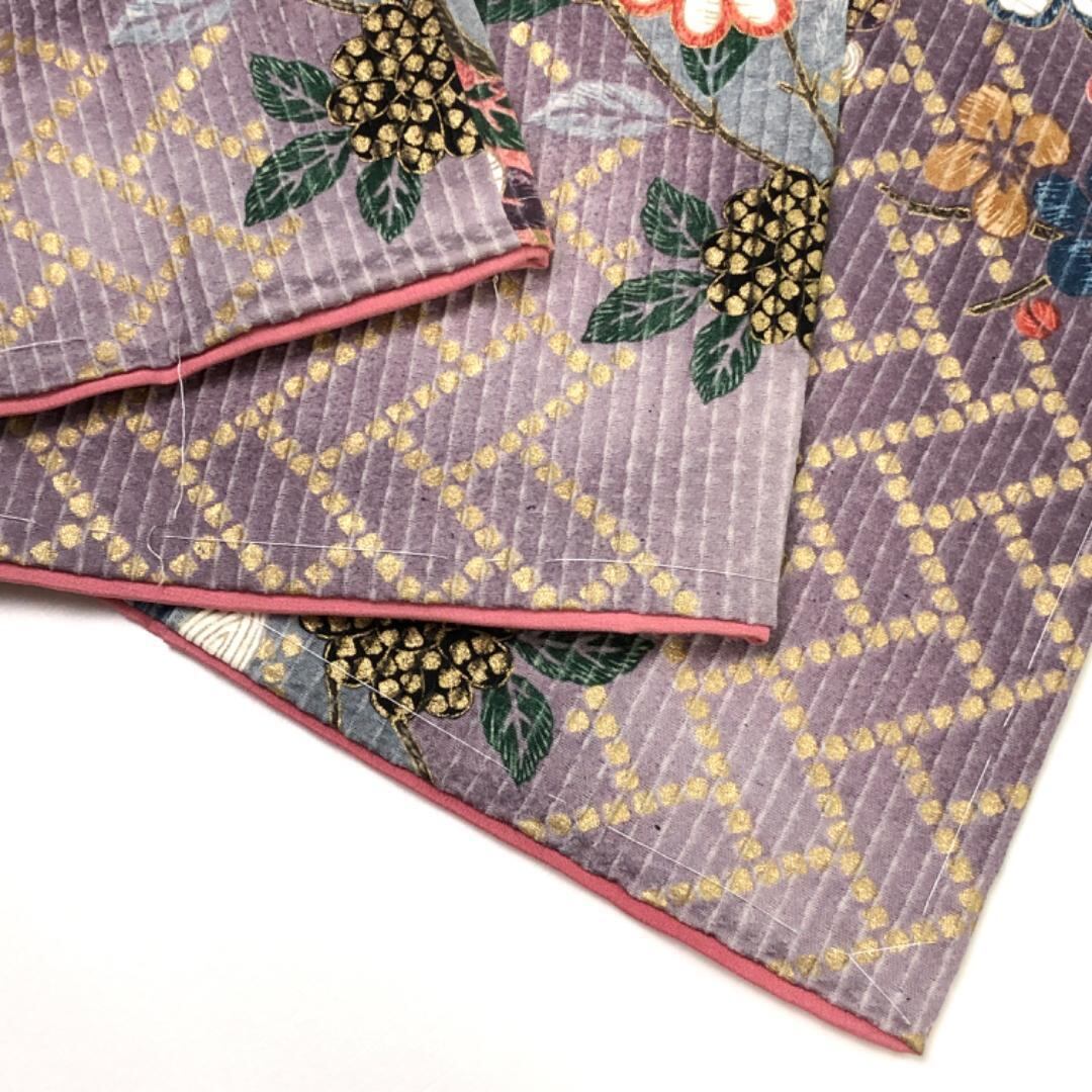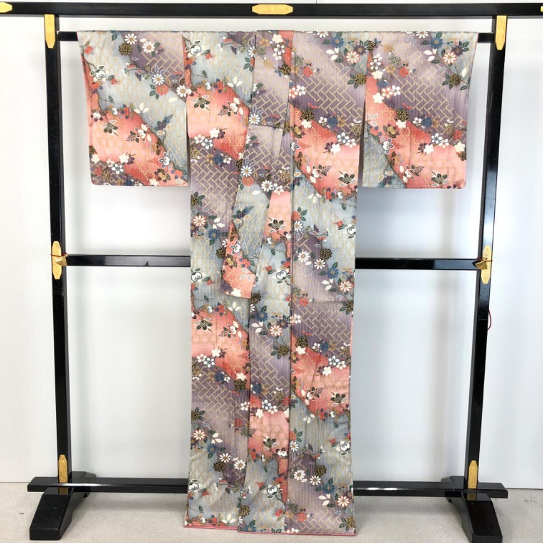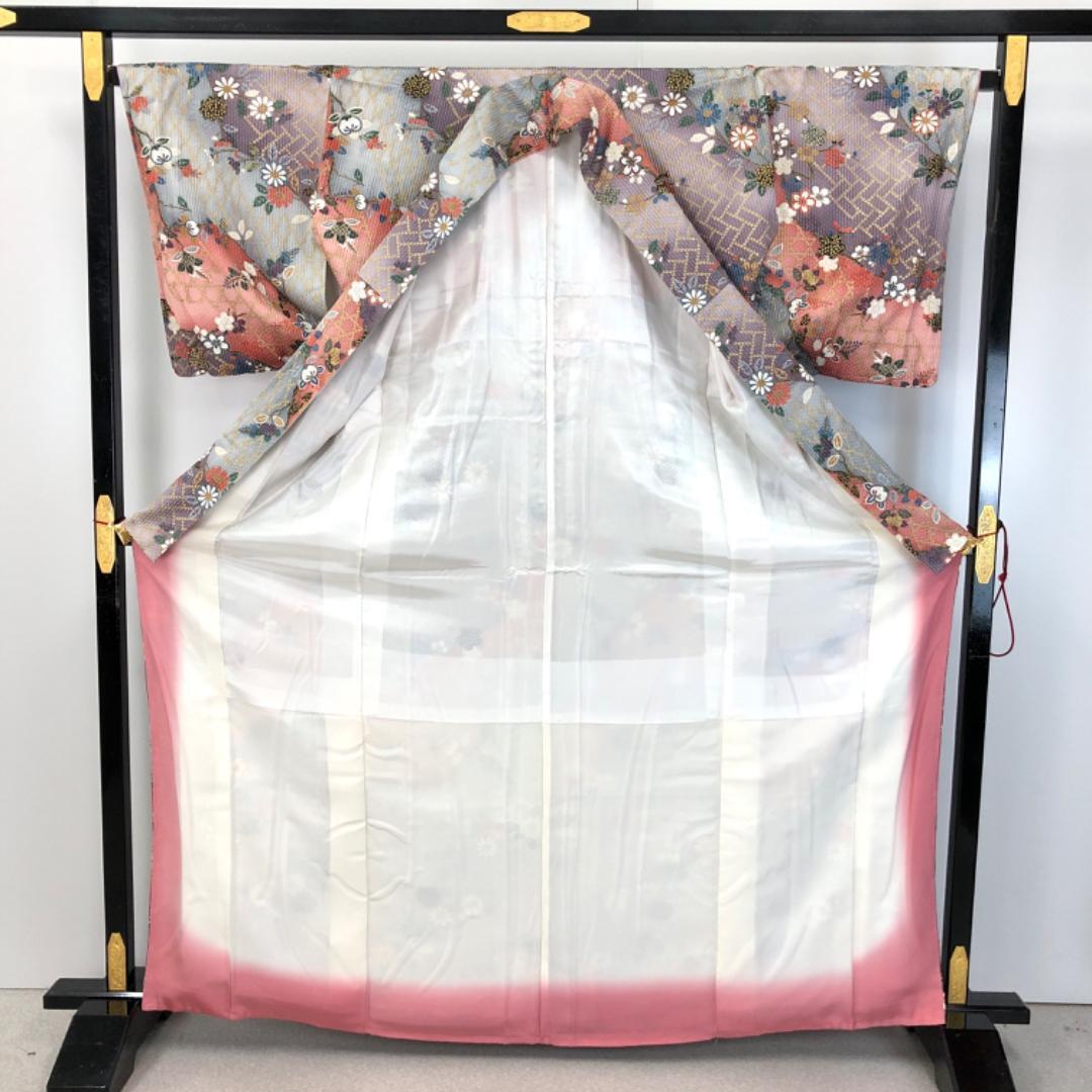 似藤色ベースのお色味に金彩が使われた斜めの花模様がデザインされた素敵な柄裄のお品でございます。