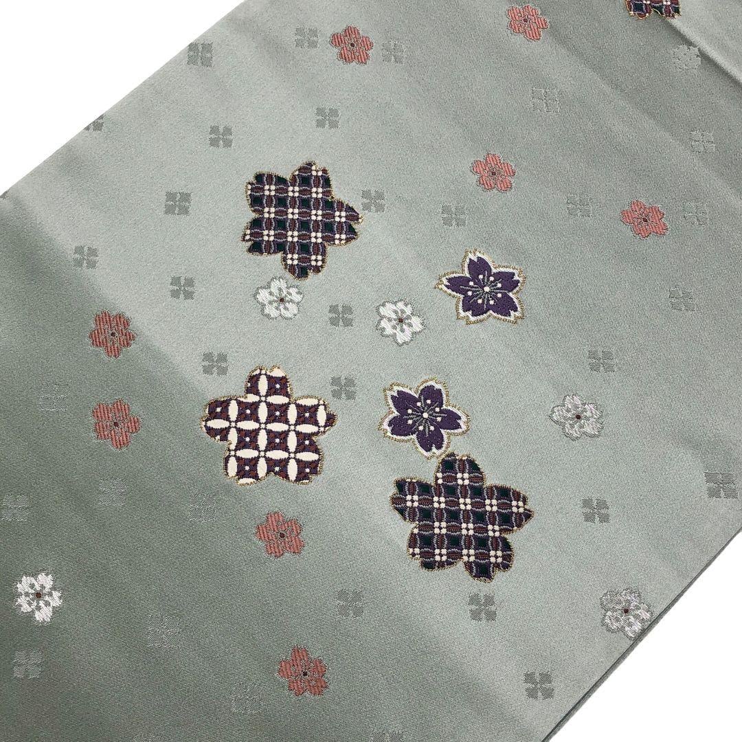 袋帯 桜の花模様 青磁色 金糸 O-5364 着物 きもの kimono 和服 和装 中古 リサイクル着物 【送料無料】