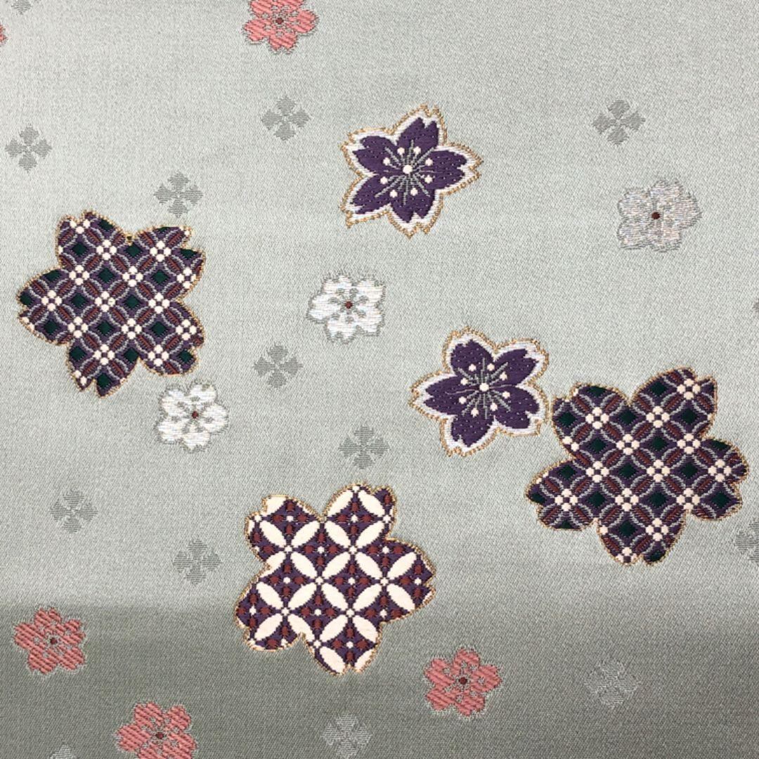 青磁色のお色味に桜の花模様の柄裄がデザインされた素敵なお品でございます。