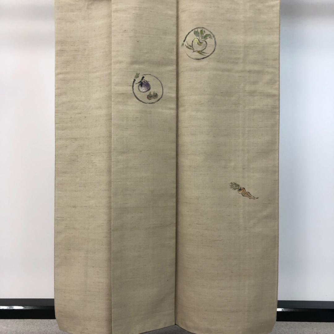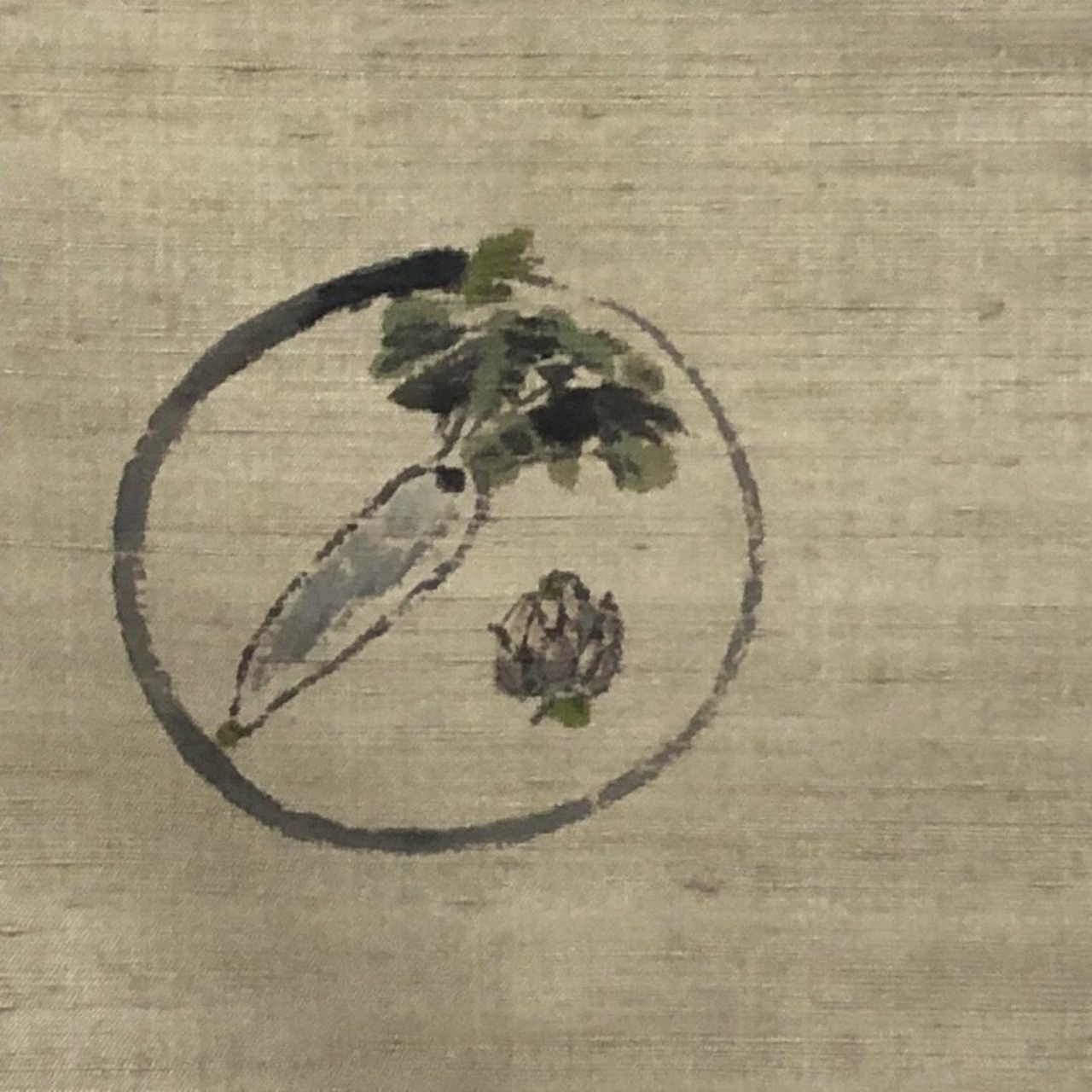 蝋色のお色味に手描きの野菜柄がデザインされた素敵なお品でございます。