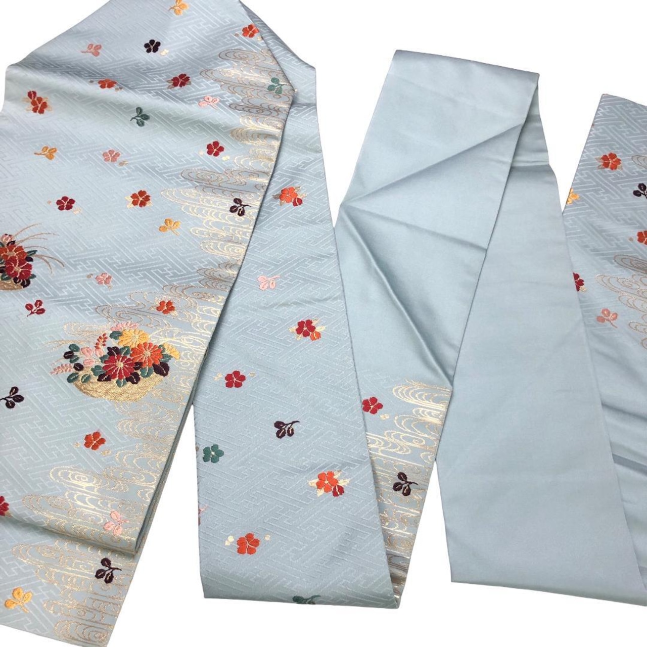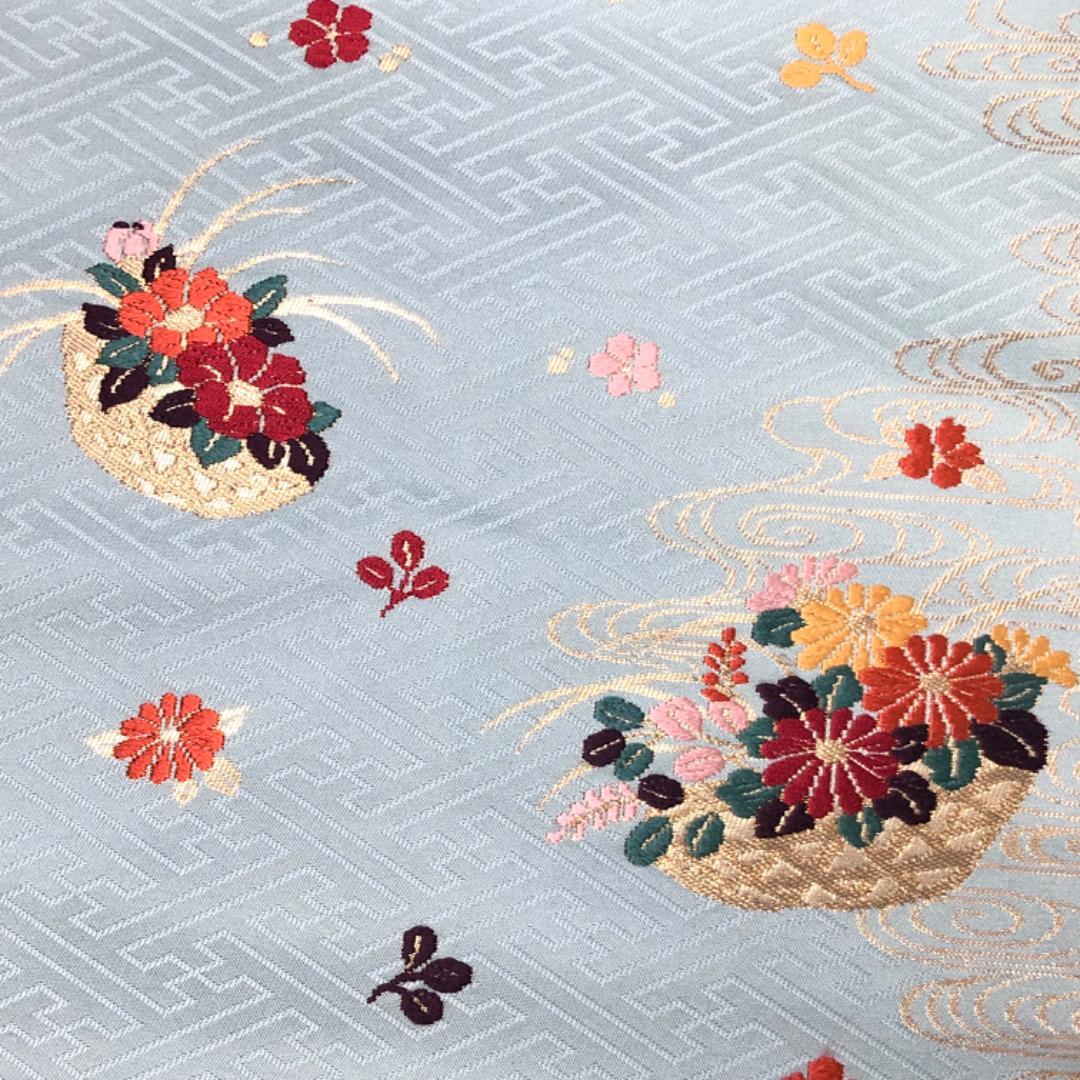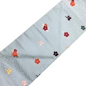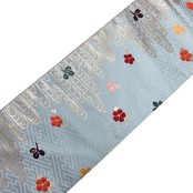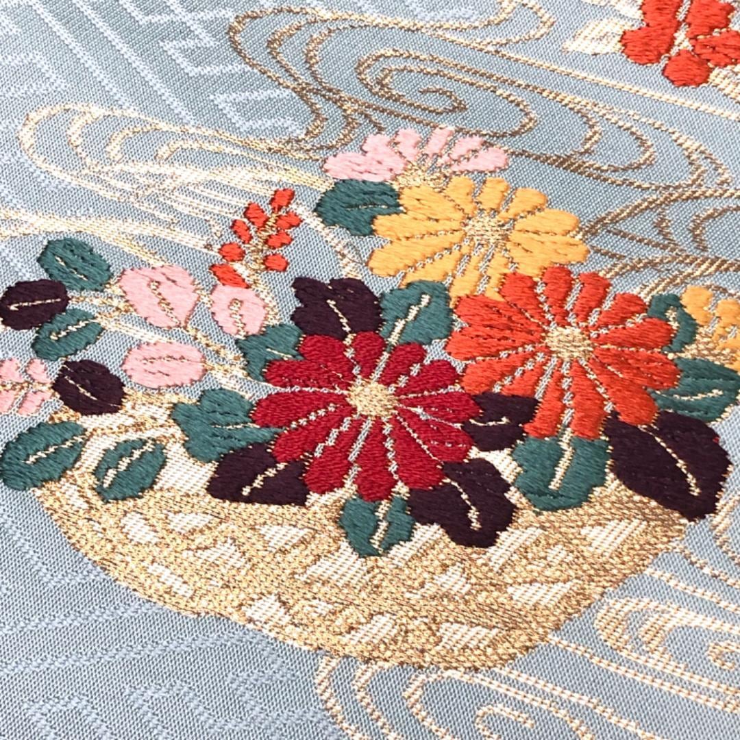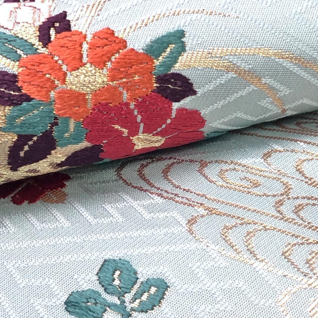 淡水色の上品なお色味に小花模様、葉模様、流水などの柄行がデザインされた素敵なお品でございます。