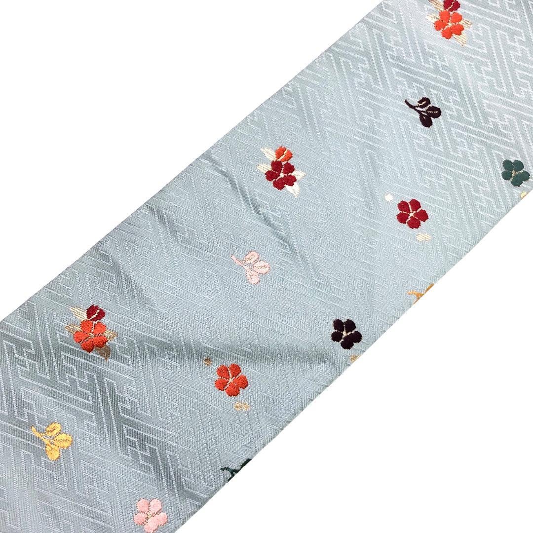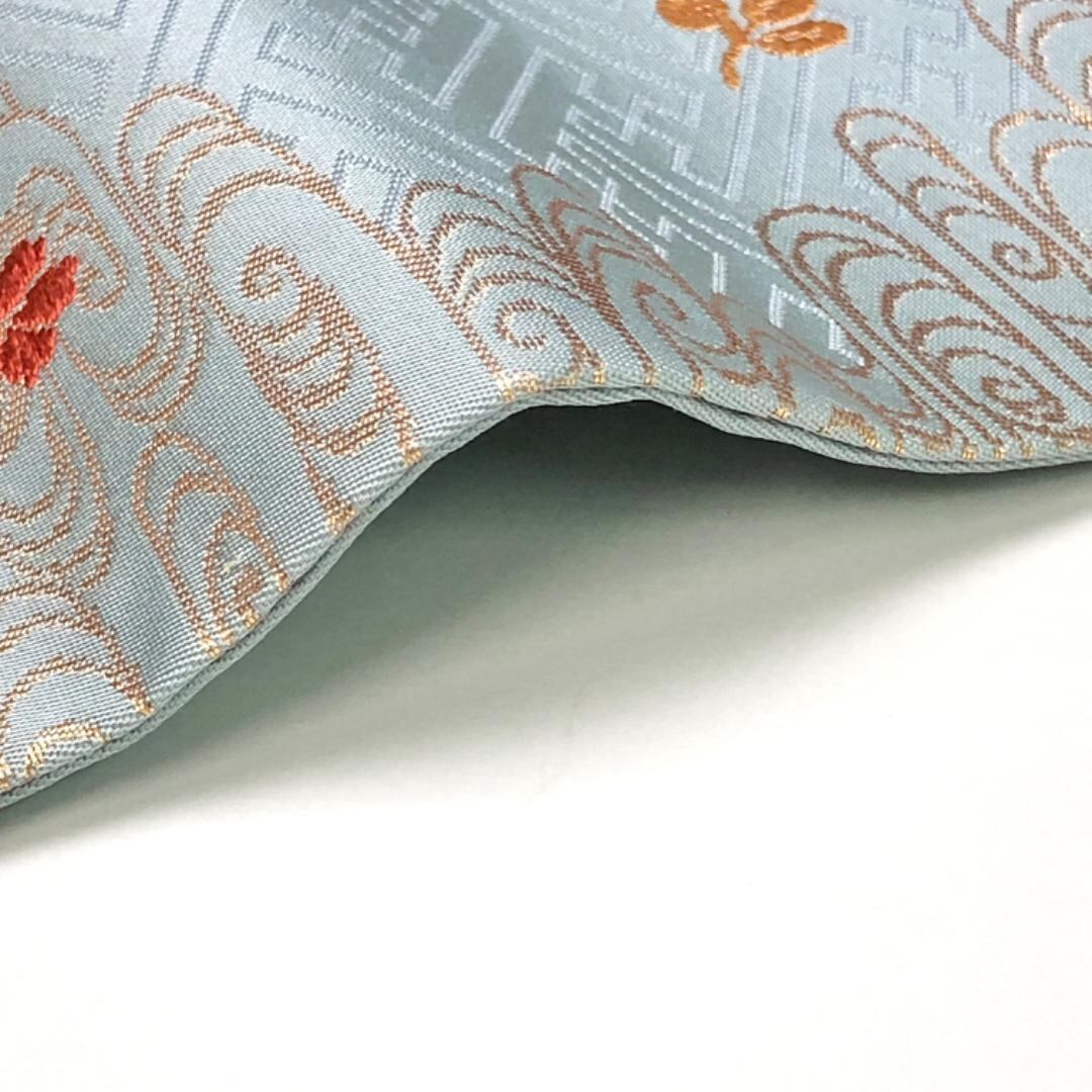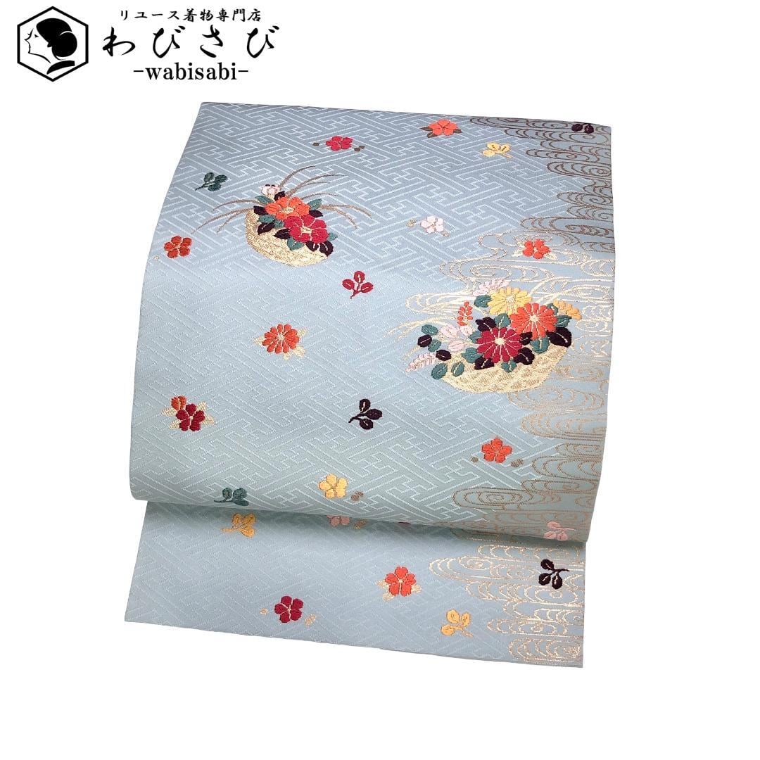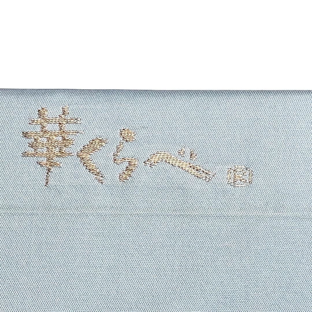 淡水色の上品なお色味に小花模様、葉模様、流水などの柄行がデザインされた素敵なお品でございます。