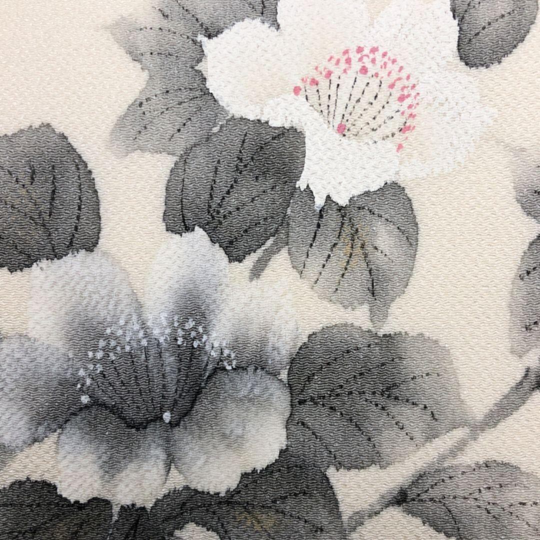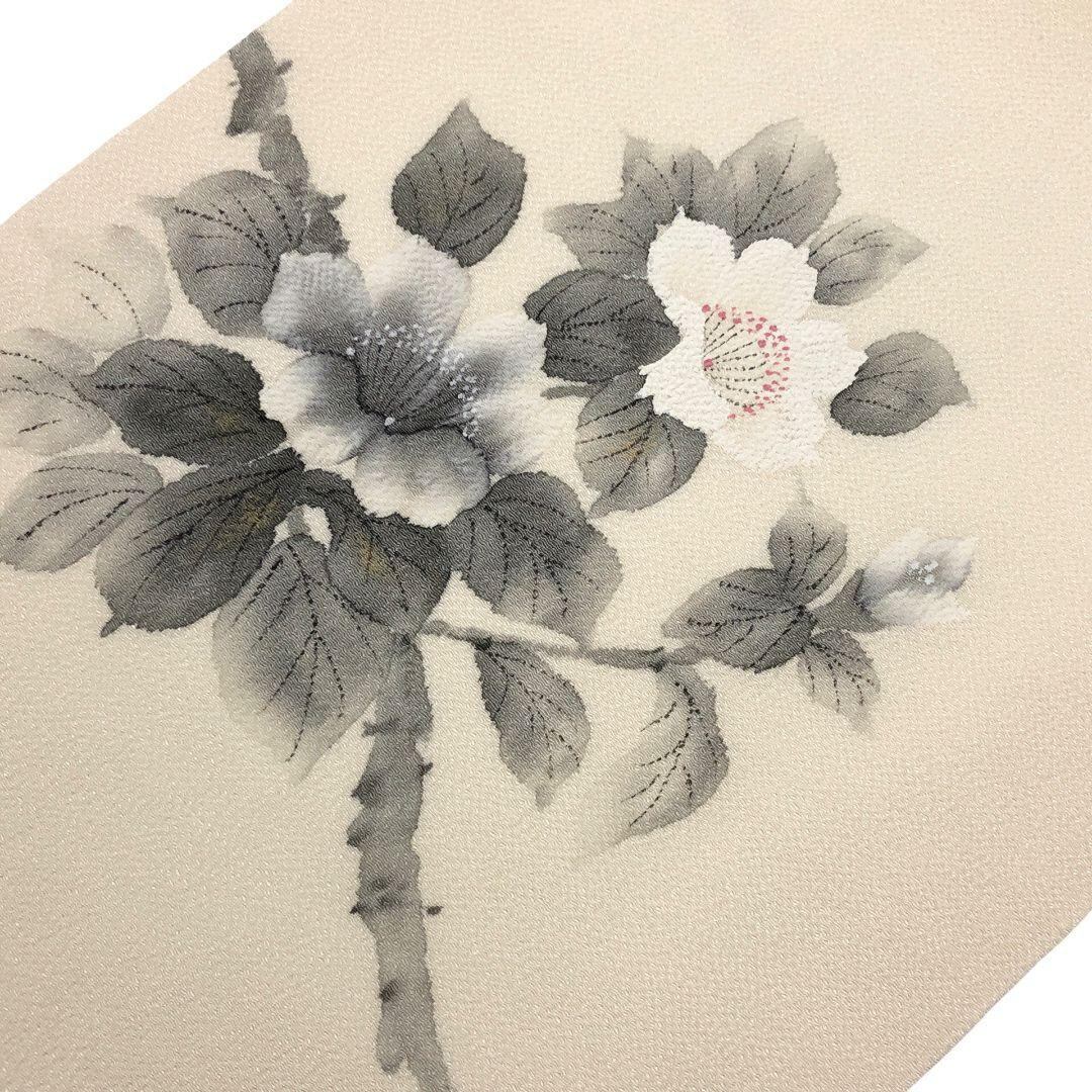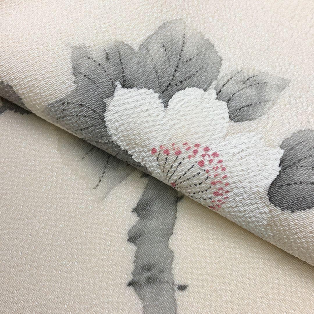 乳白色の上品なお色味の縮緬に手描きの花模様がデザインされた雰囲気の良い素敵なお品でございます。