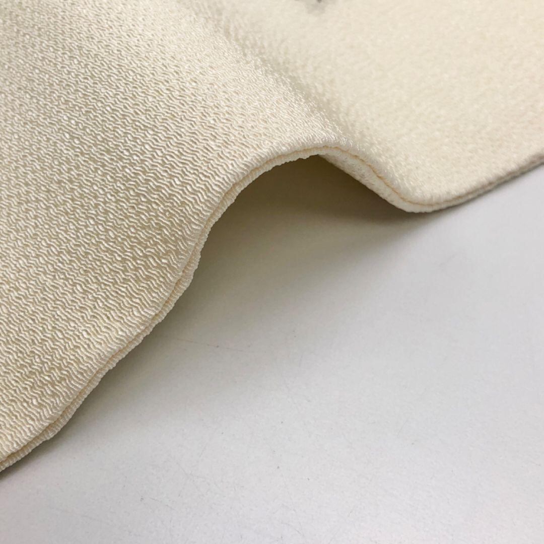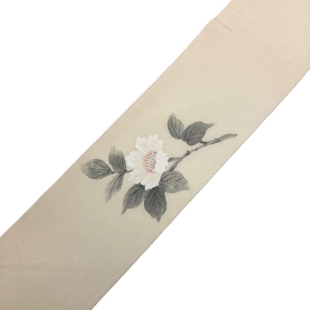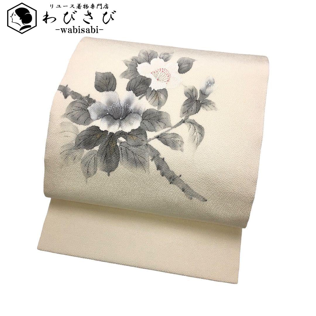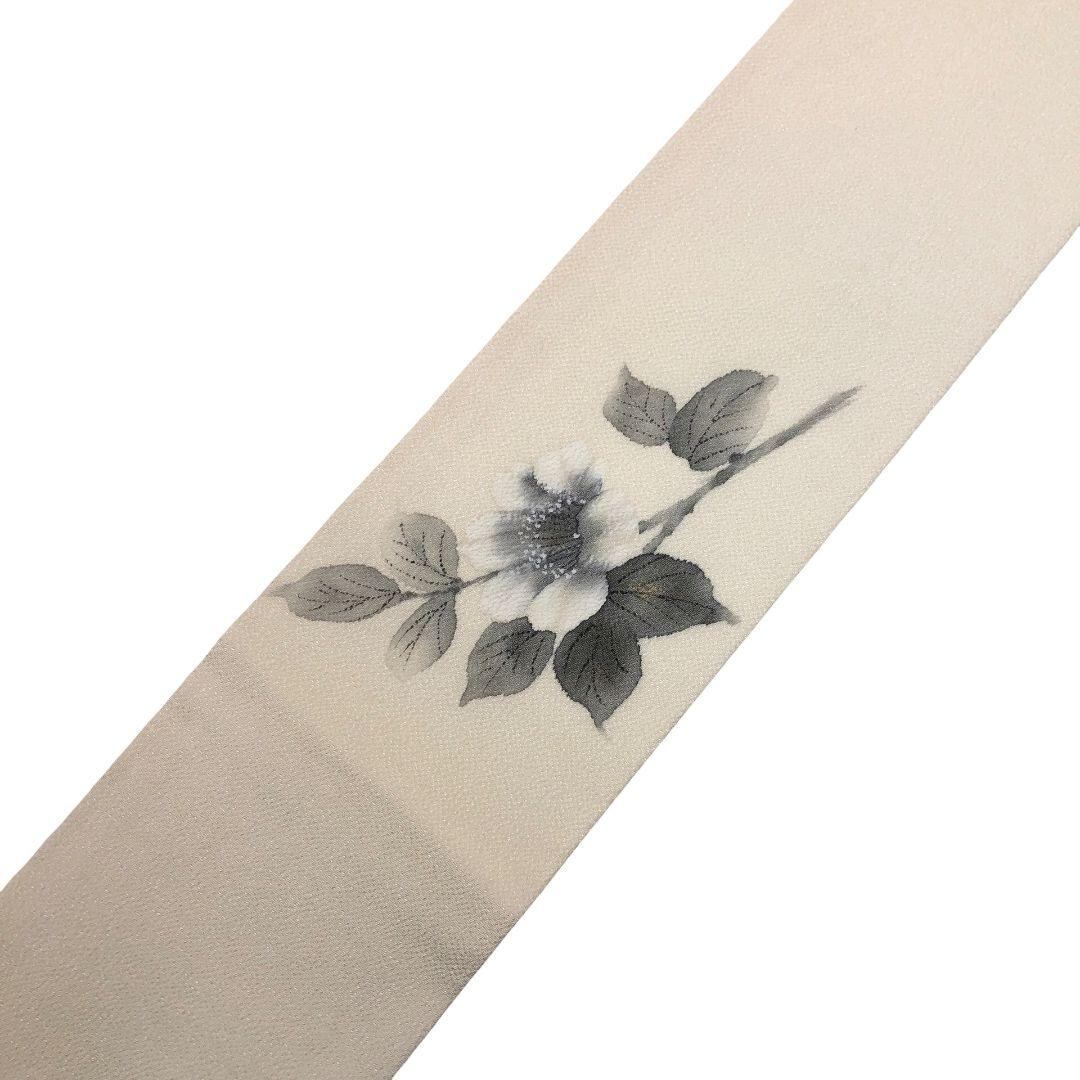 乳白色の上品なお色味の縮緬に手描きの花模様がデザインされた雰囲気の良い素敵なお品でございます。