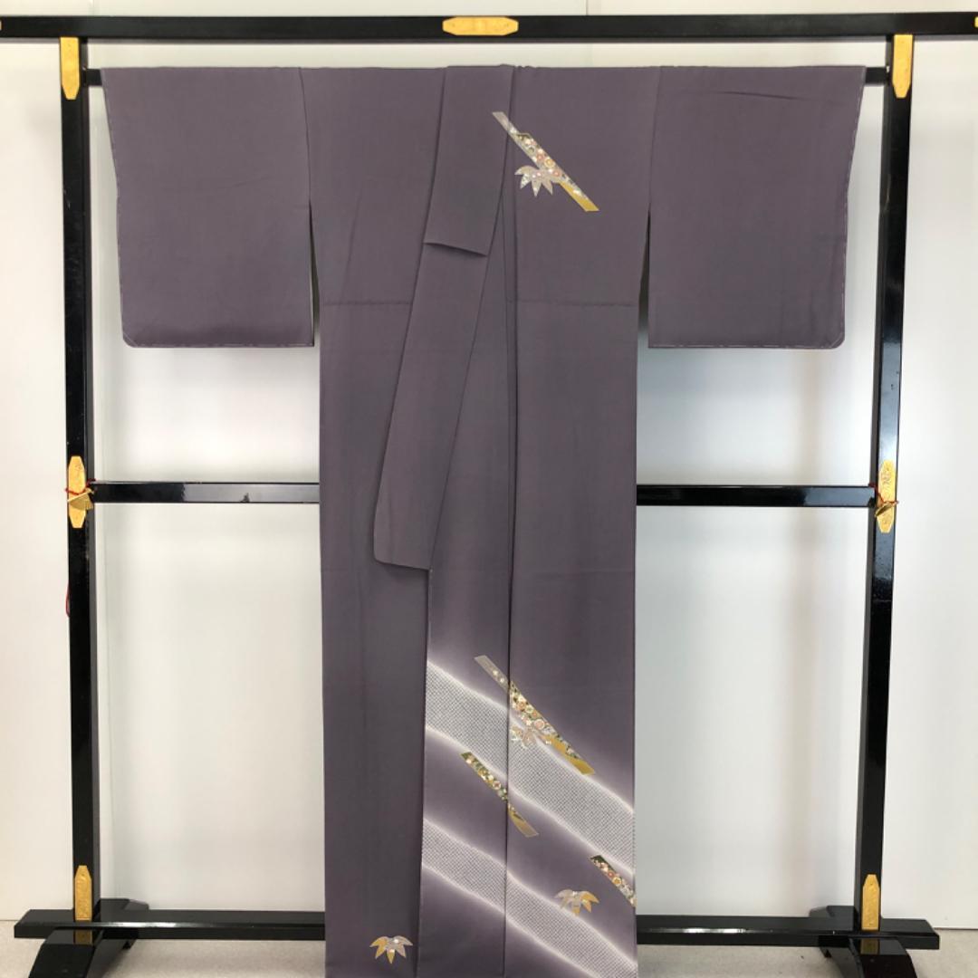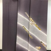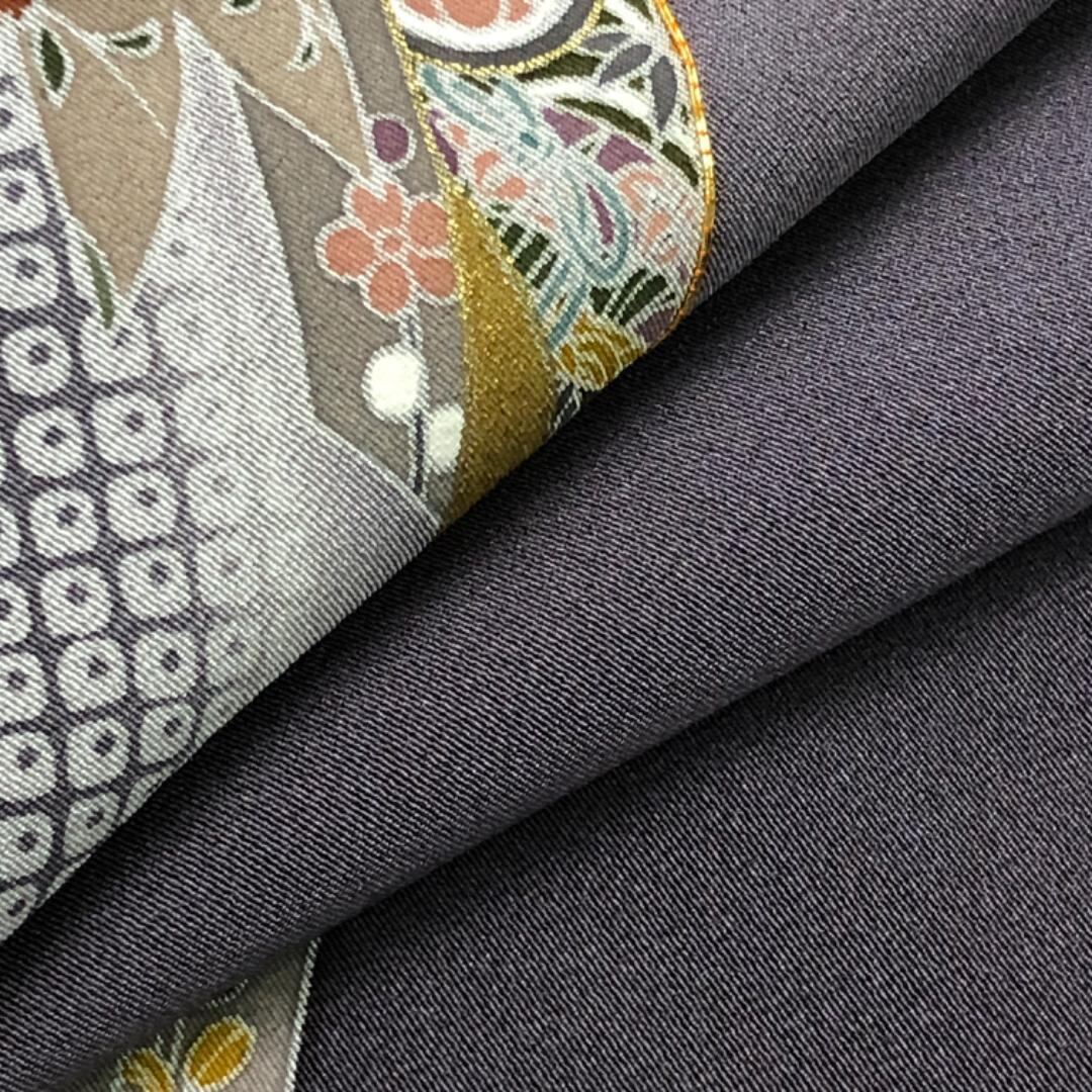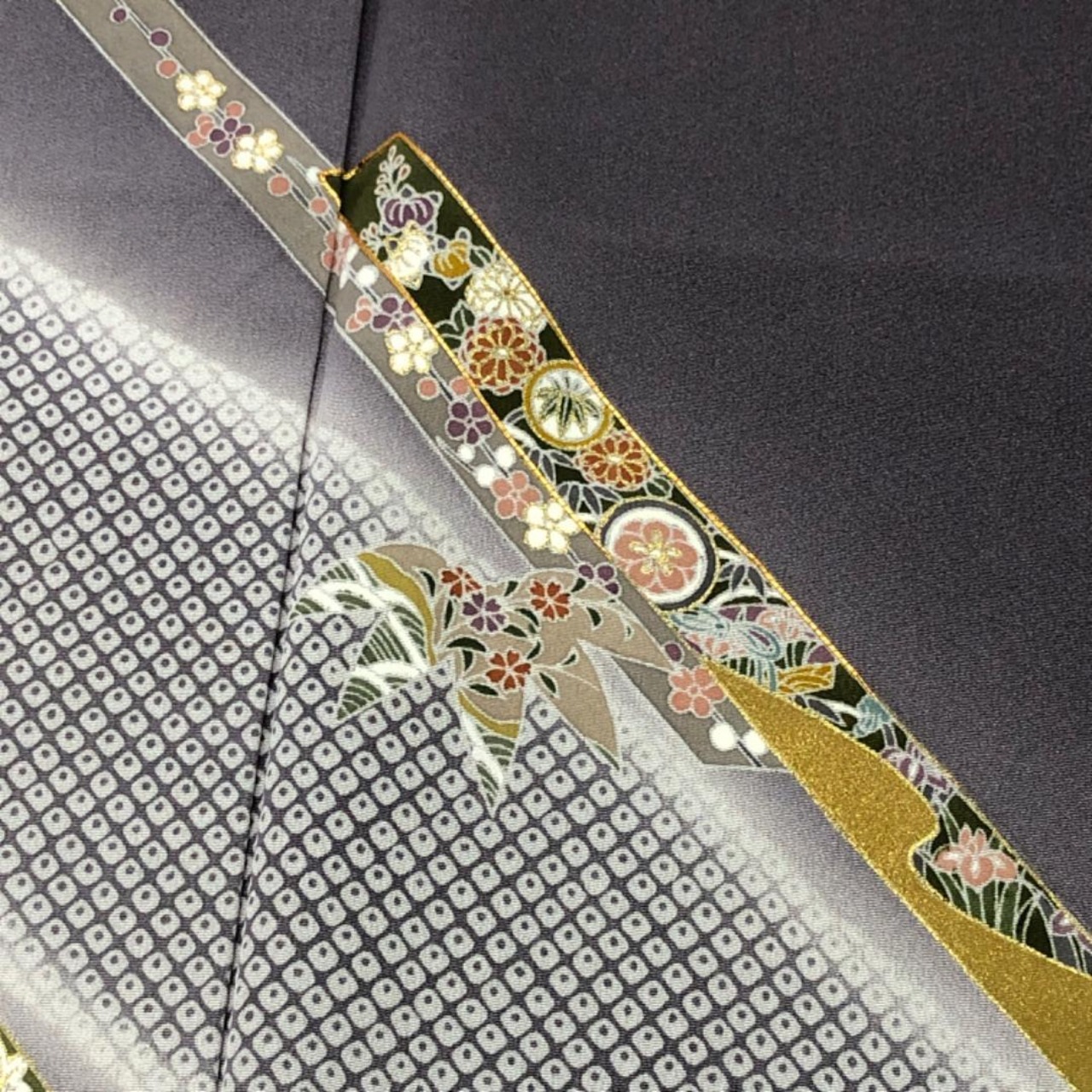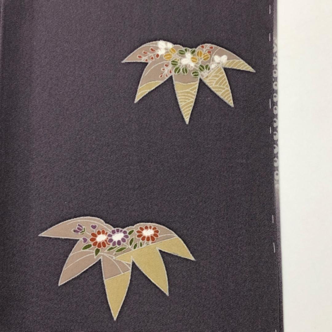 深滅紫色のお色味に花模様、笹の葉、鹿子模様などの柄裄がデザインされた素敵なお品でございます。