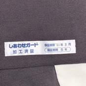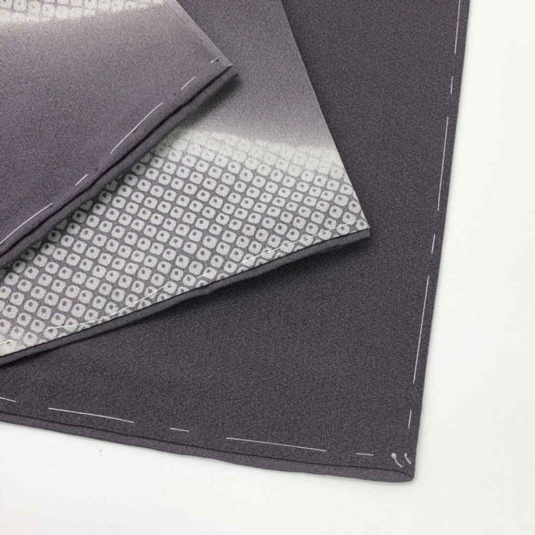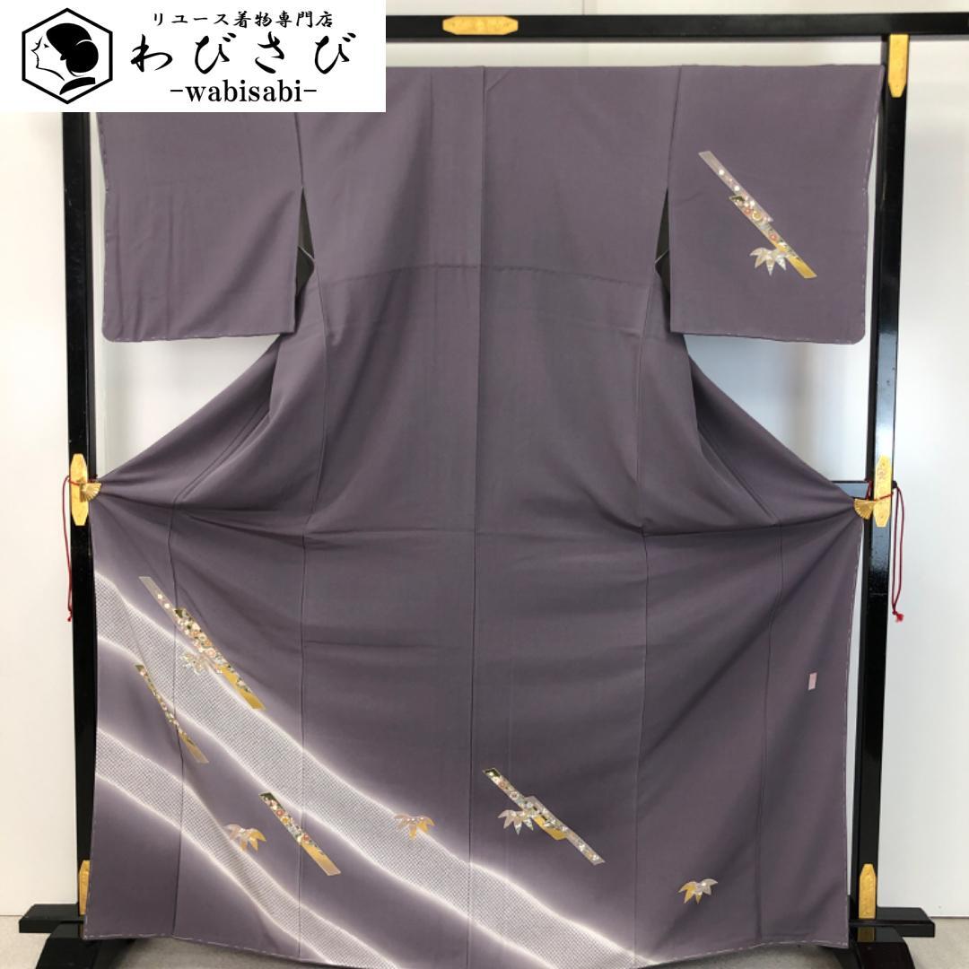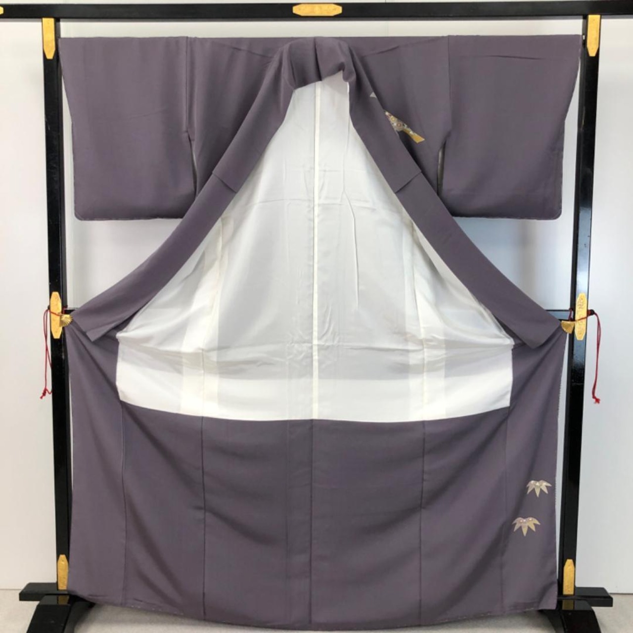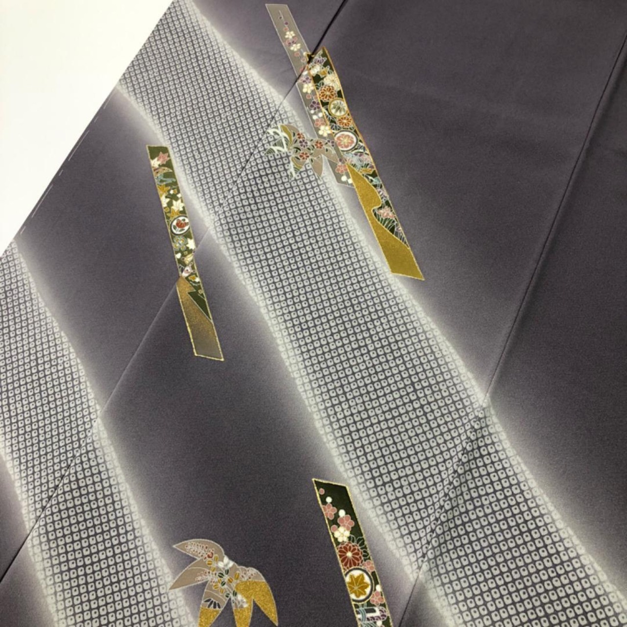 深滅紫色のお色味に花模様、笹の葉、鹿子模様などの柄裄がデザインされた素敵なお品でございます。