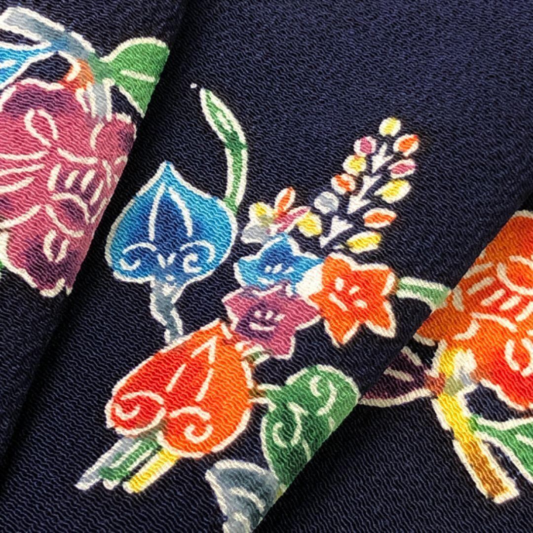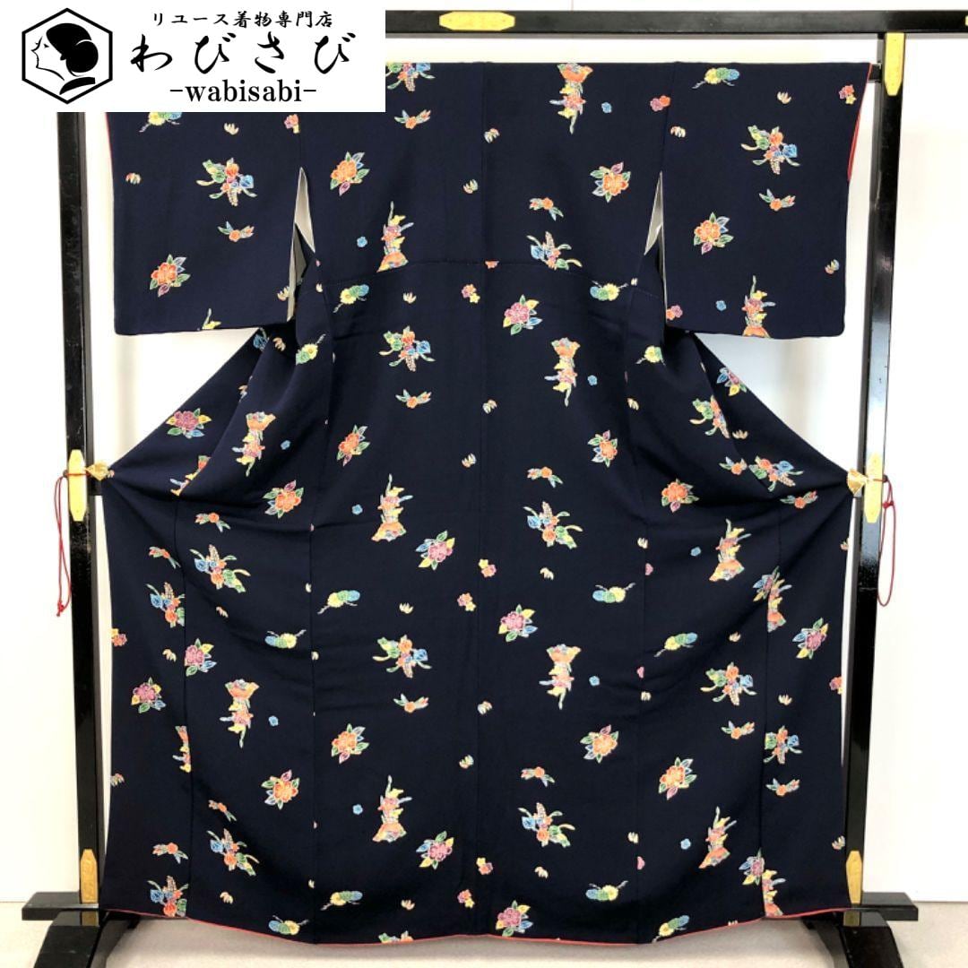 小紋 型染 花模様 縮緬 青褐色 トールサイズ K-5149 着物 きもの kimono 和服 和装 中古 リサイクル着物 【送料無料】