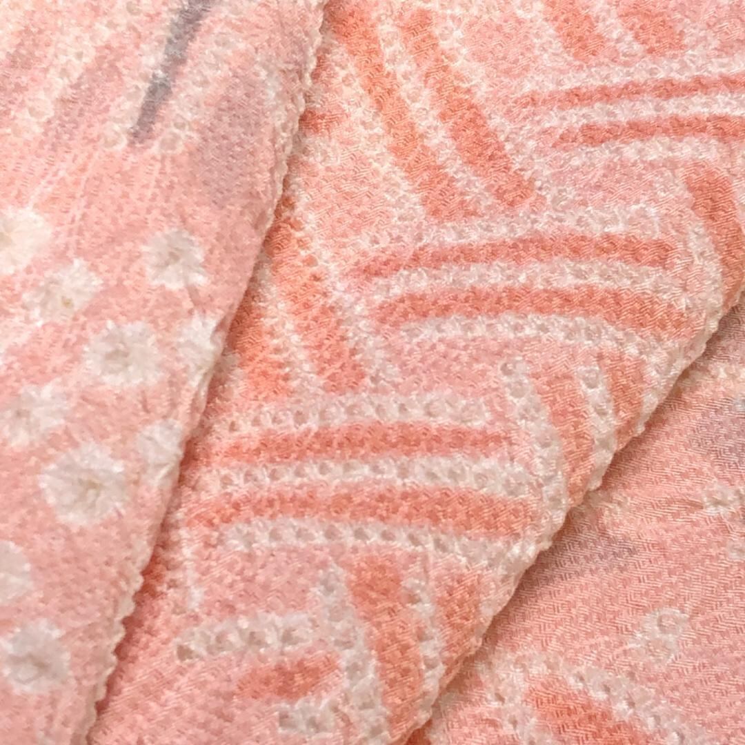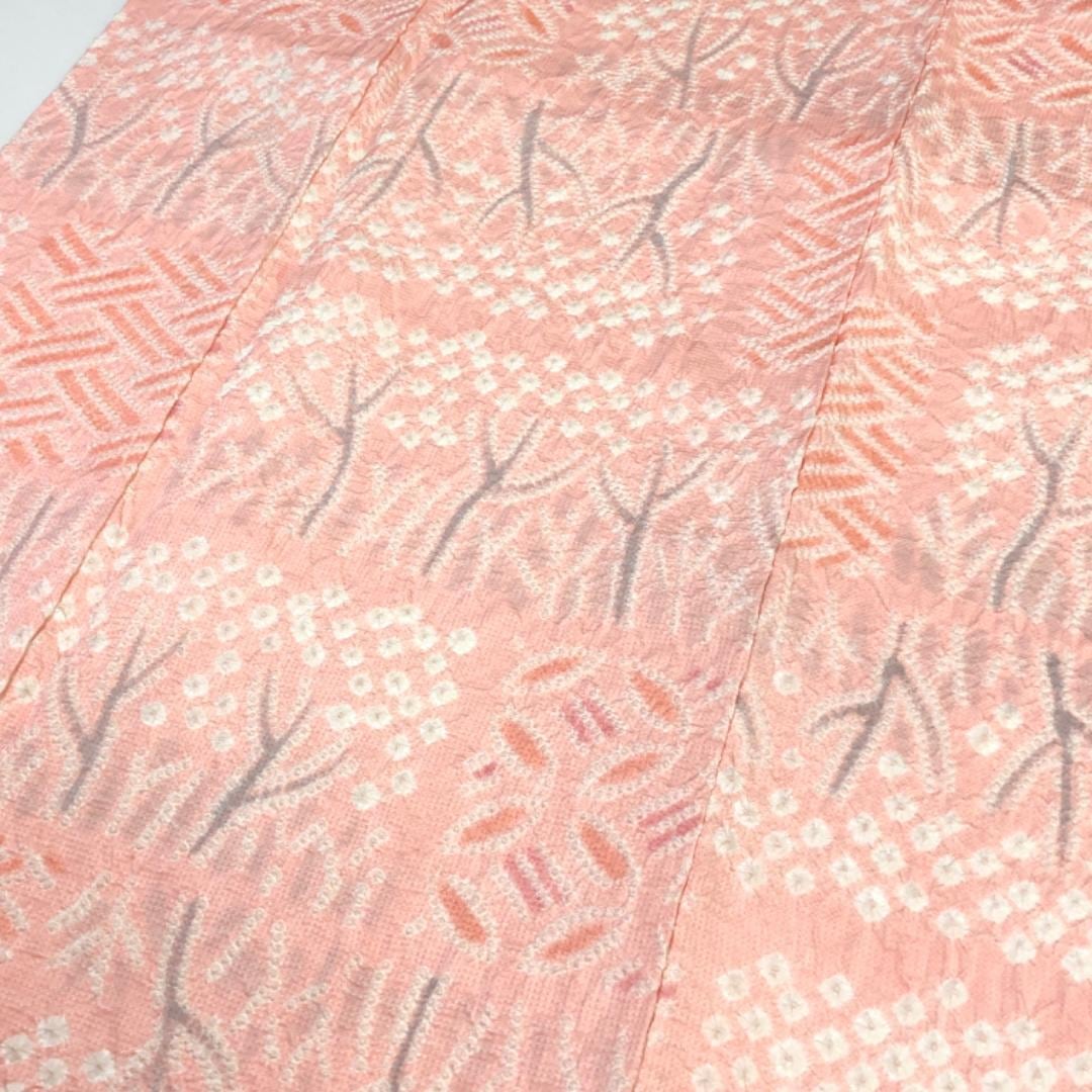 曙色の優しいお色味に絞り柄の桜の木、七宝柄、青海波などの柄行がデザインされた雰囲気の良い素敵なお品でございます。