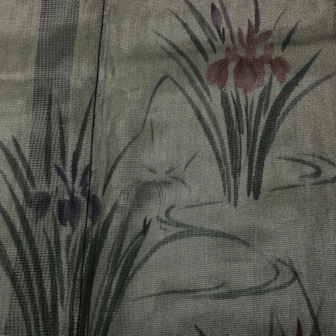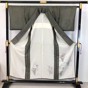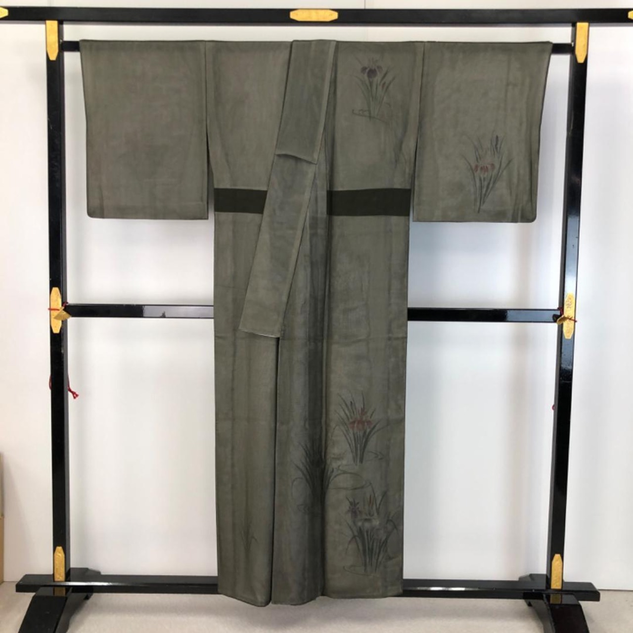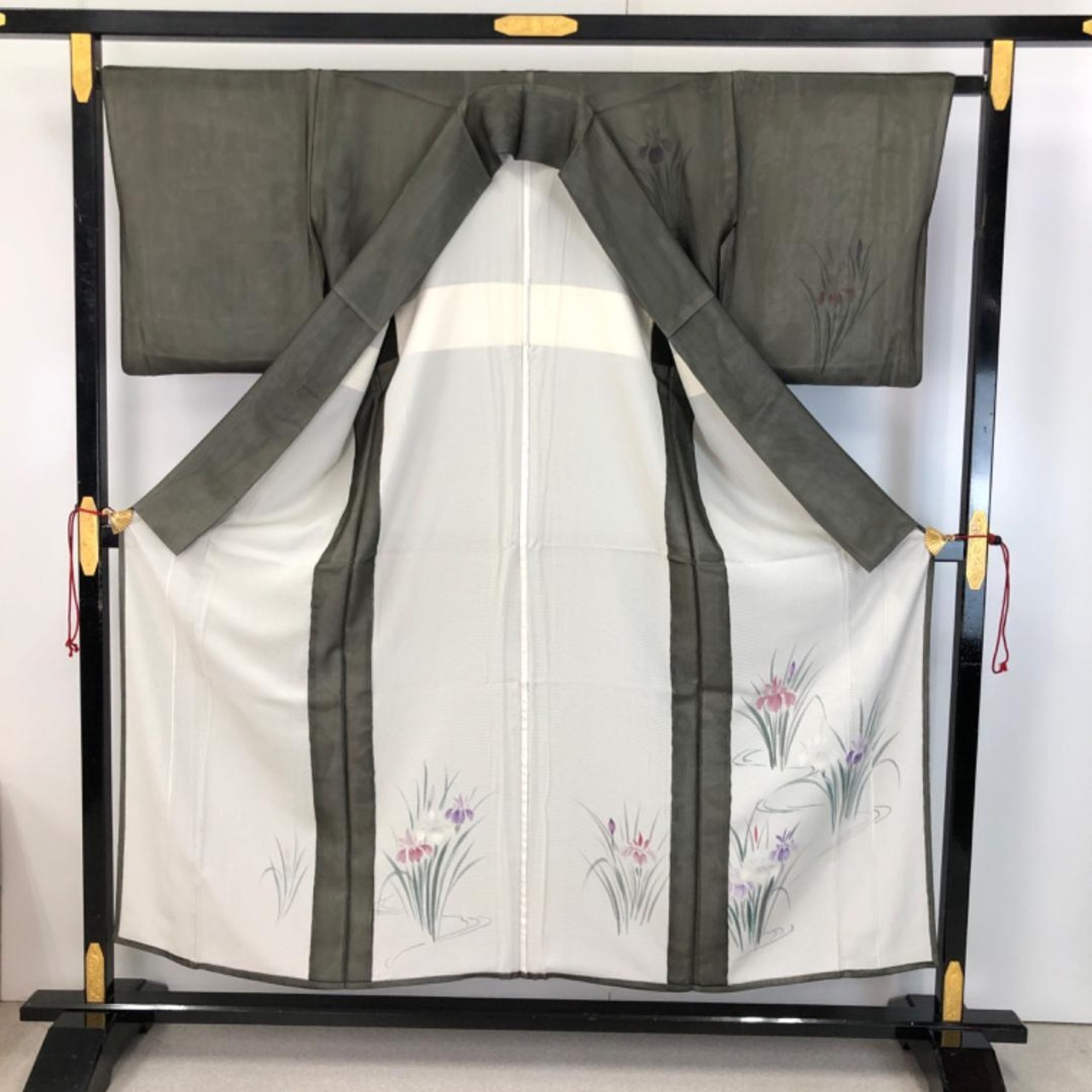 黒橡色のお色味から透けて浮かび上がる流水に菖蒲の柄裄がデザインされた雰囲気の良い素敵なお品でございます。