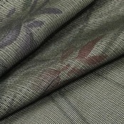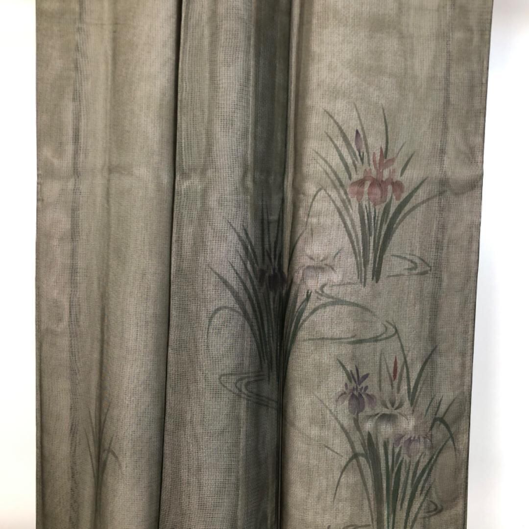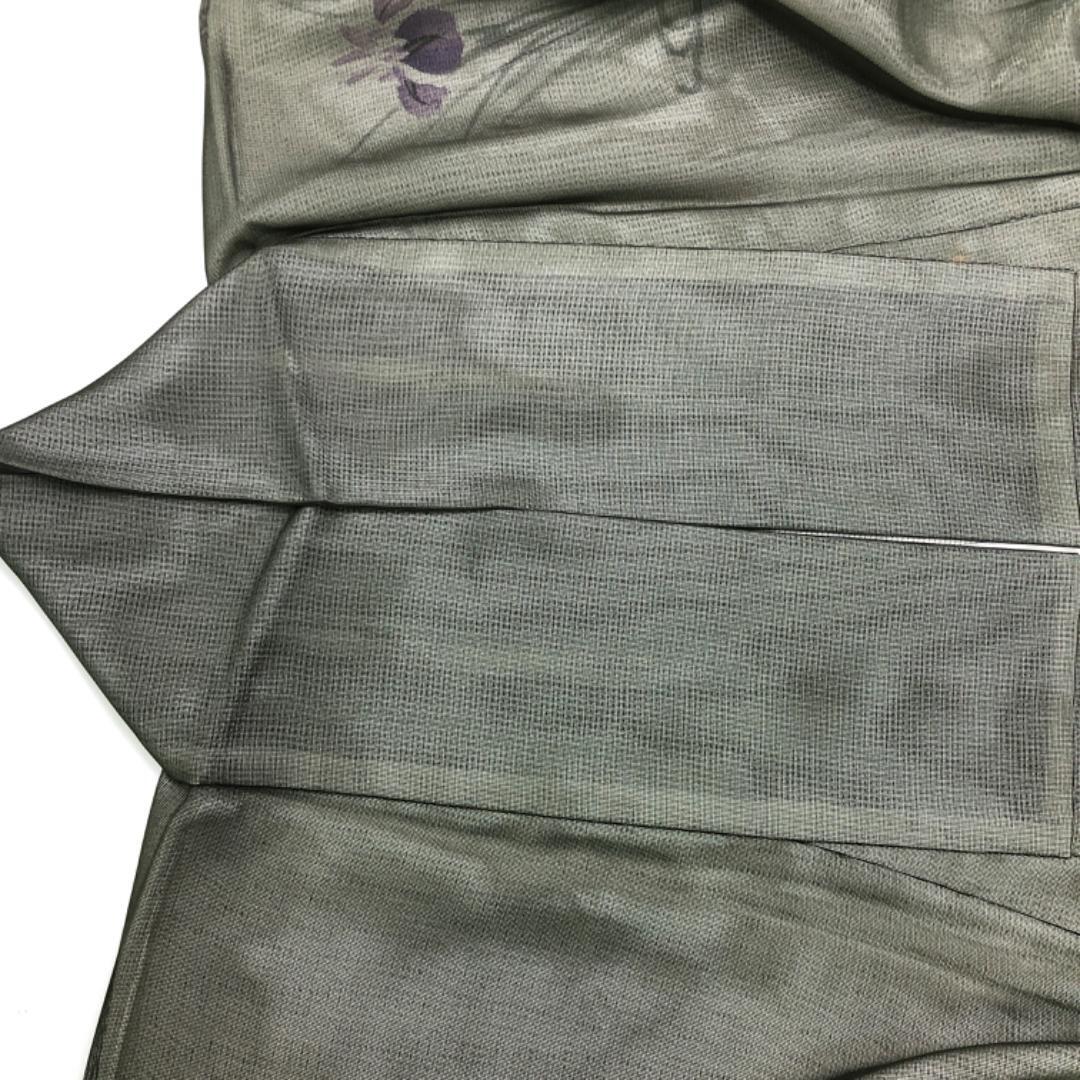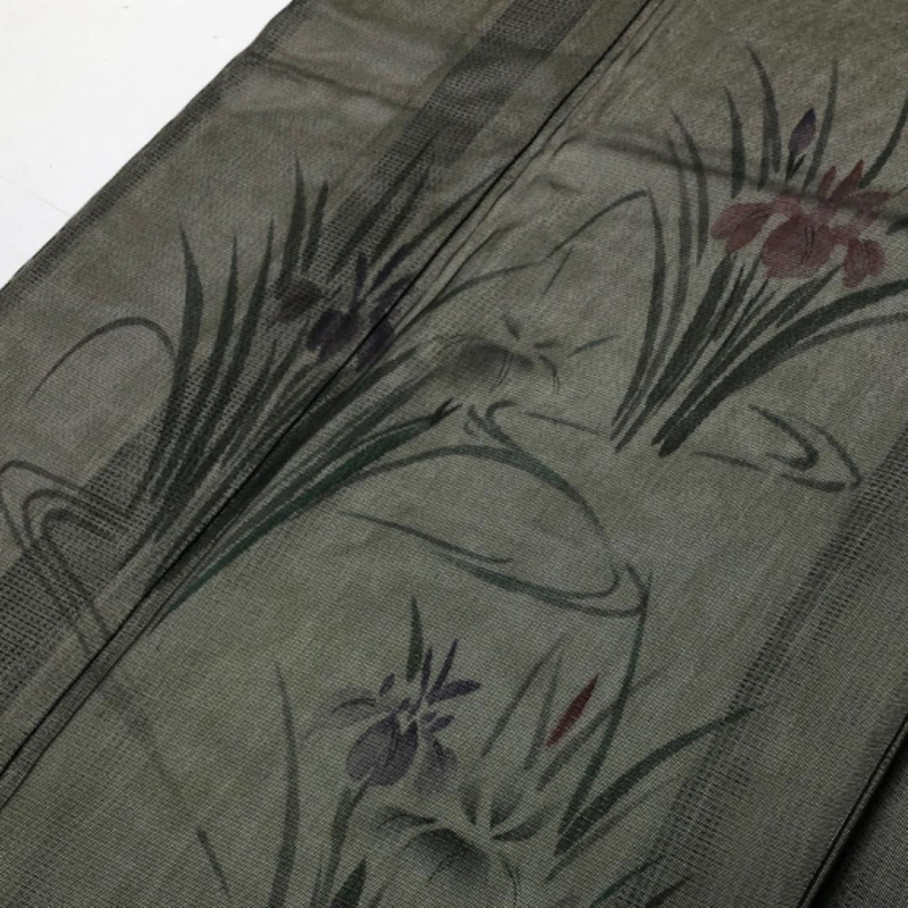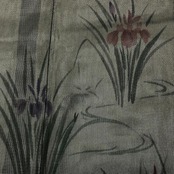 黒橡色のお色味から透けて浮かび上がる流水に菖蒲の柄裄がデザインされた雰囲気の良い素敵なお品でございます。