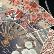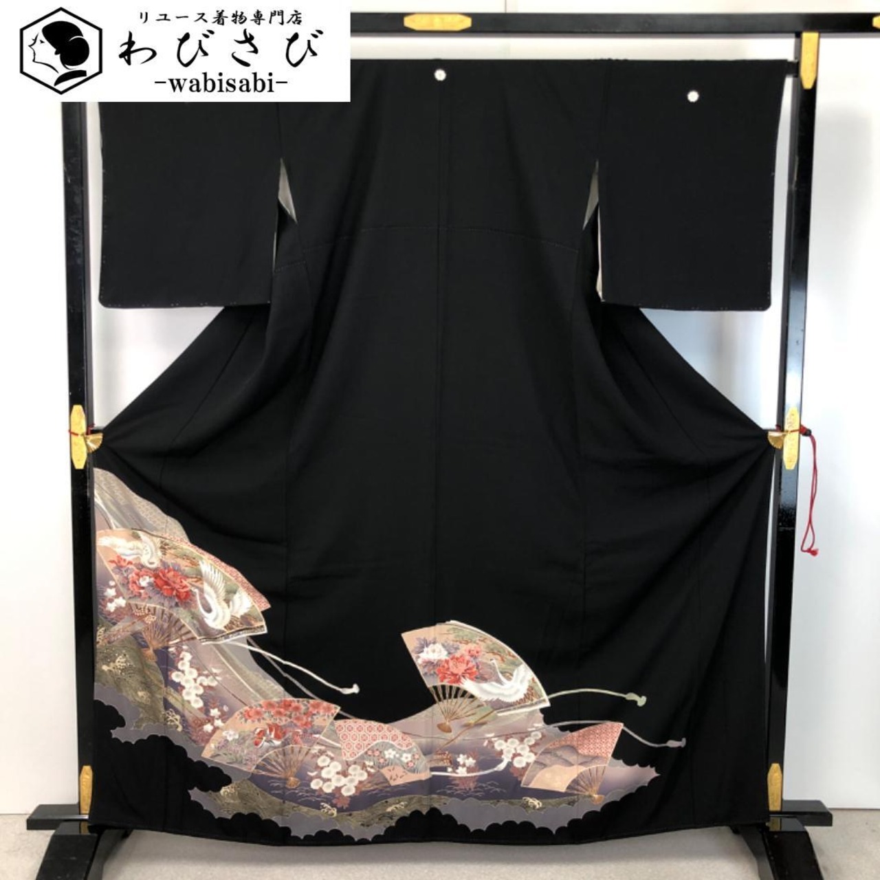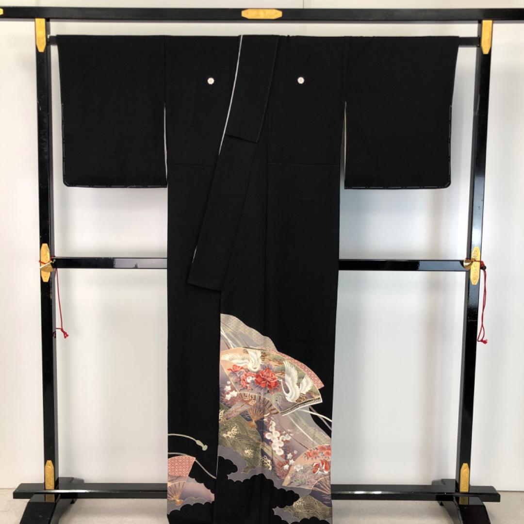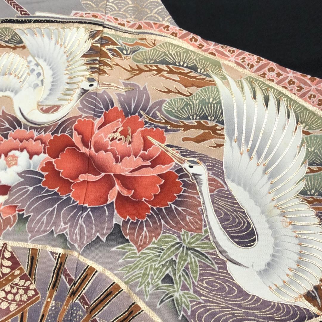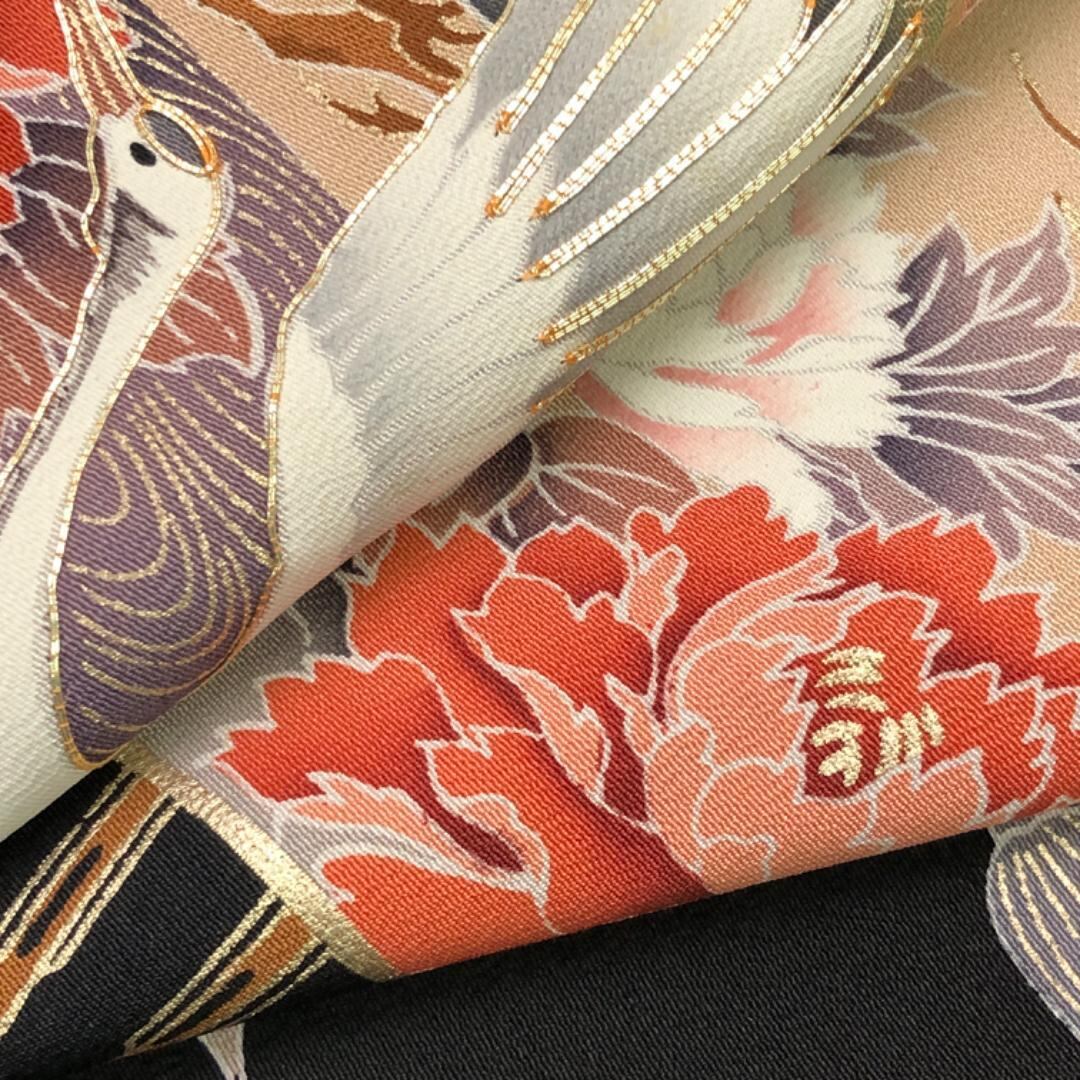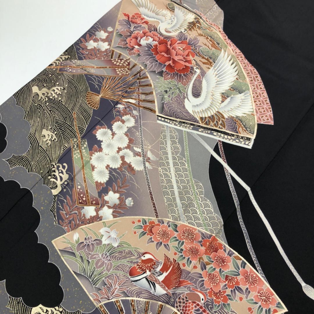 扇子に美しい花模様、鶴、鴛鴦などの華やかな柄裄がデザインされた素敵なお品でございます。
