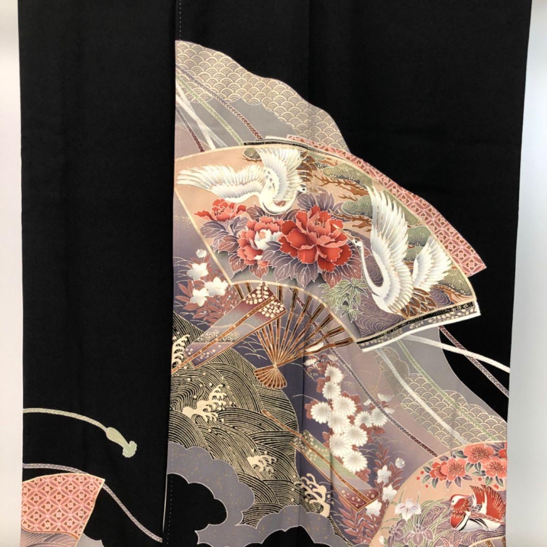 黒留袖 扇子に鶴 鶴 鴛鴦 組紐 金駒刺繍 K-5126 着物 きもの kimono 和服 和装 中古 リサイクル着物 【送料無料】