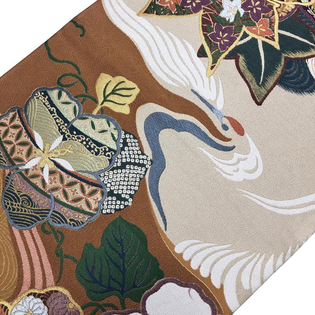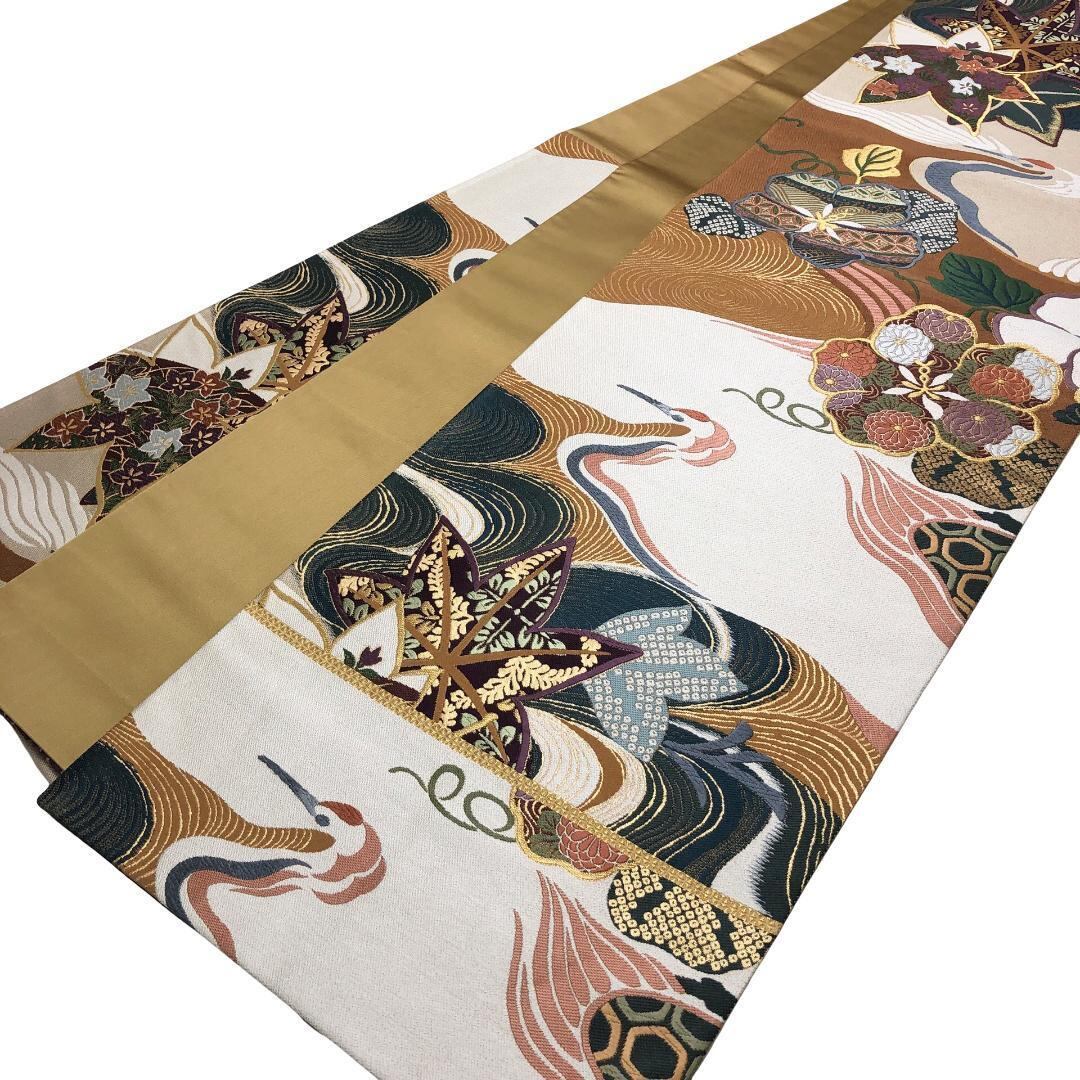 白練色ベースのお色味に鶴、楓、花模様の柄裄がデザインされた雰囲気の良い素敵なお品でございます。