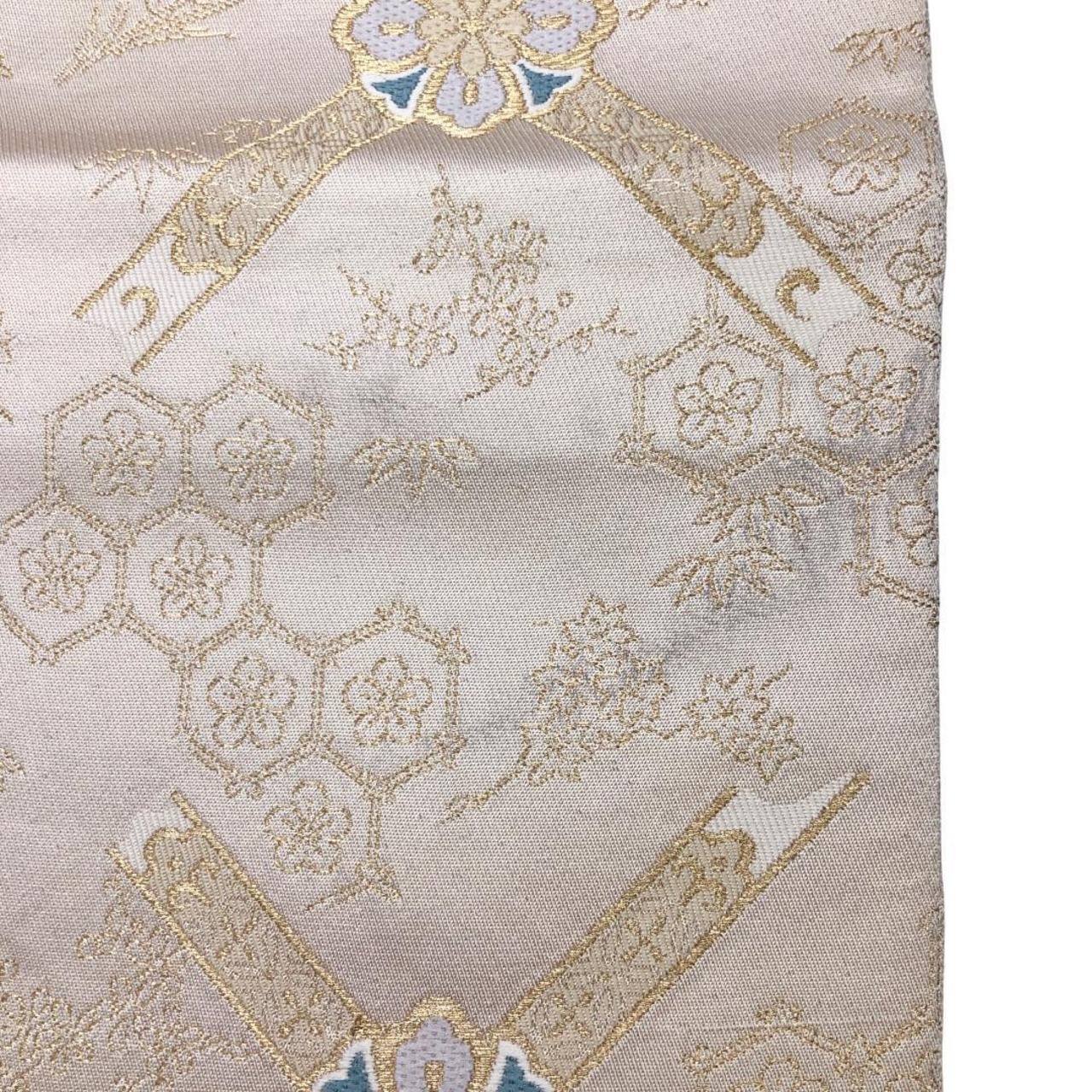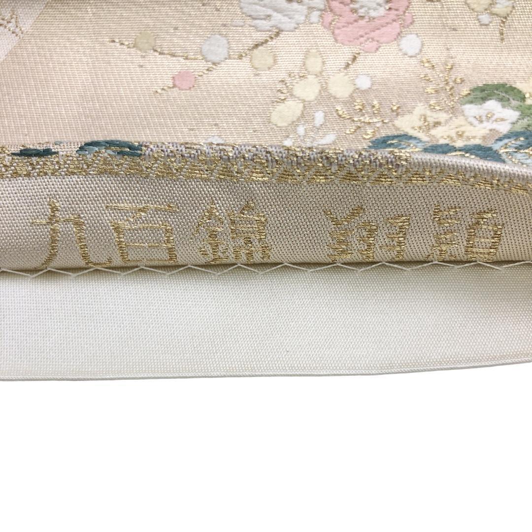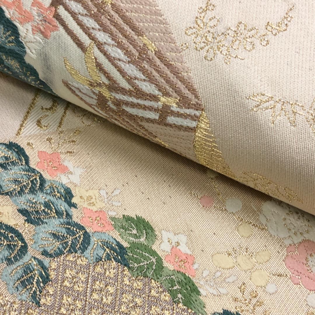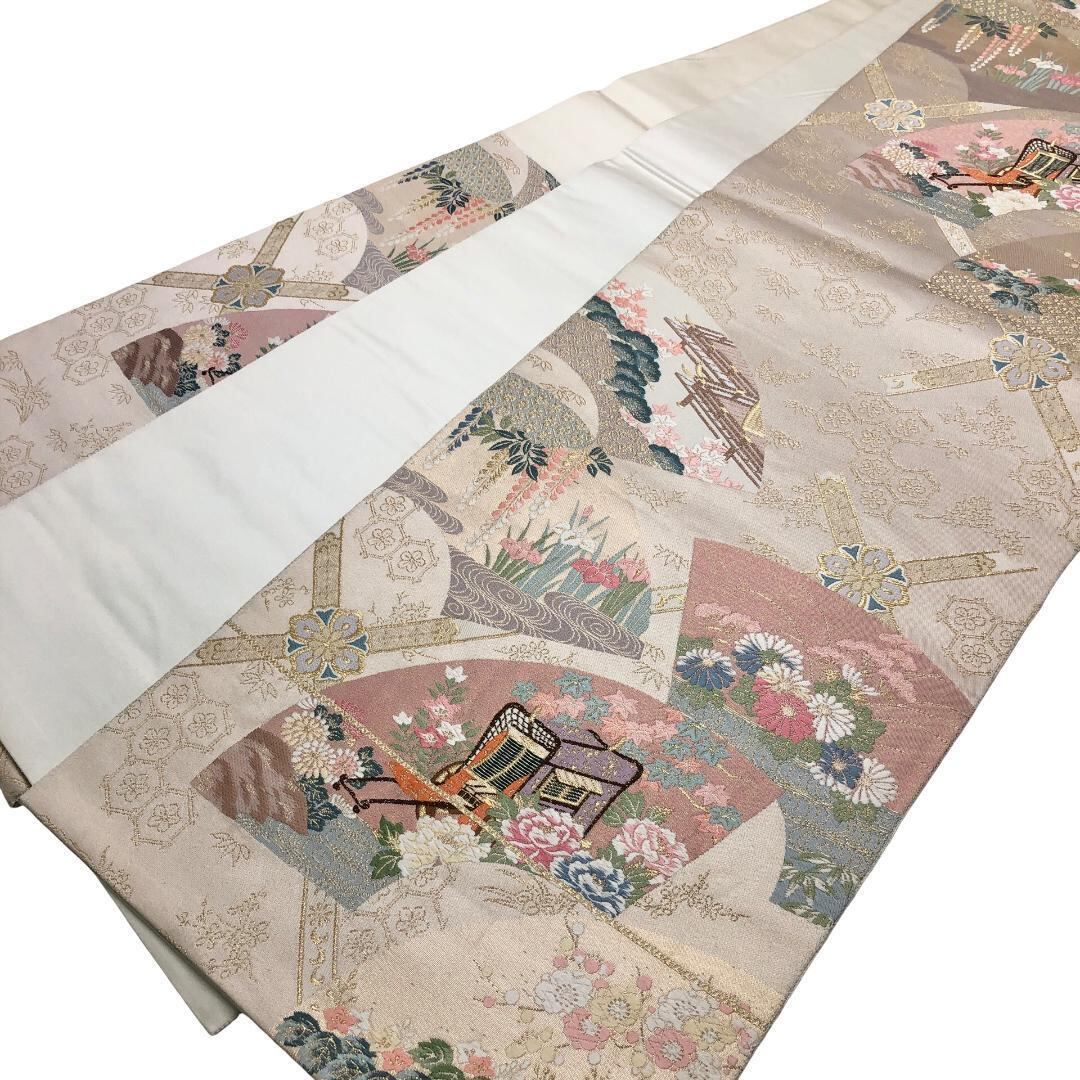 生成色の煌びやかで上品なお色味に地紙、花模様、御所車などの柄裄がデザインされた素敵なお品でございます。