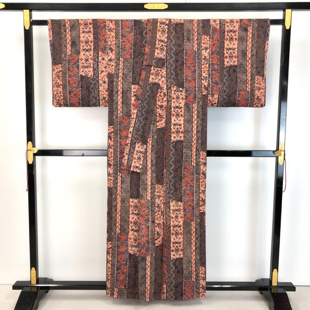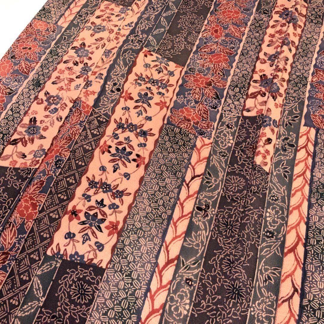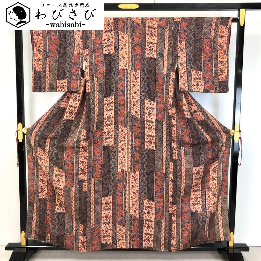 灰紫色ベースのお色味に型染の縦縞に寄せ柄、花柄模様がデザインされた雰囲気の良い素敵な柄裄のお品でございます。