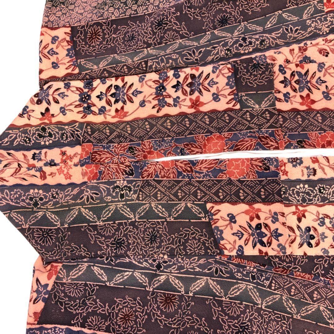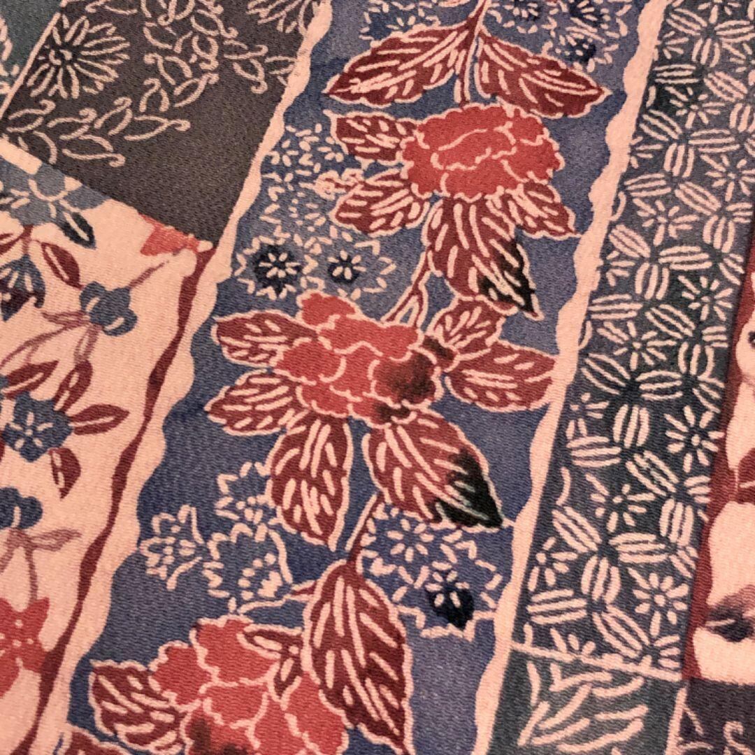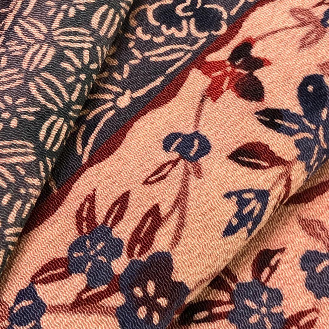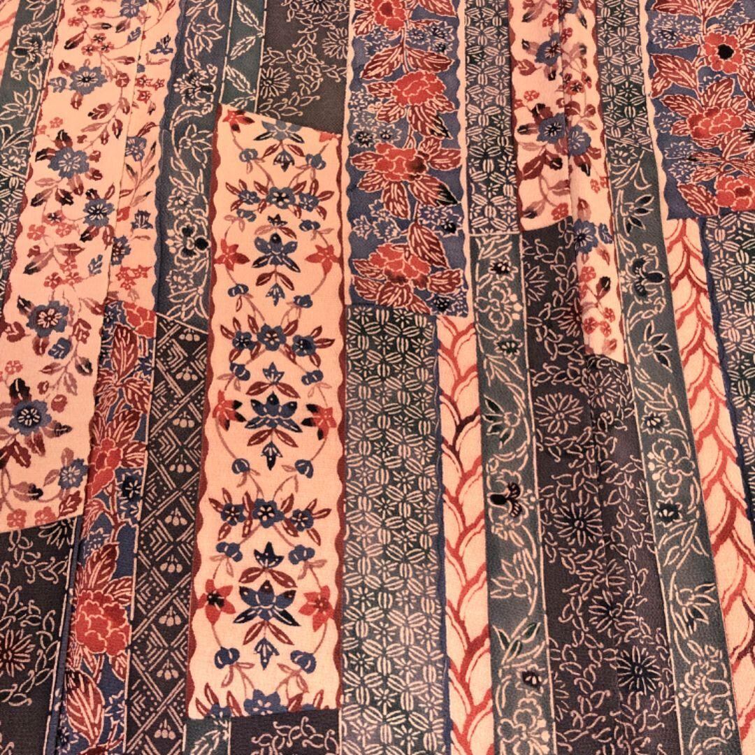 灰紫色ベースのお色味に型染の縦縞に寄せ柄、花柄模様がデザインされた雰囲気の良い素敵な柄裄のお品でございます。