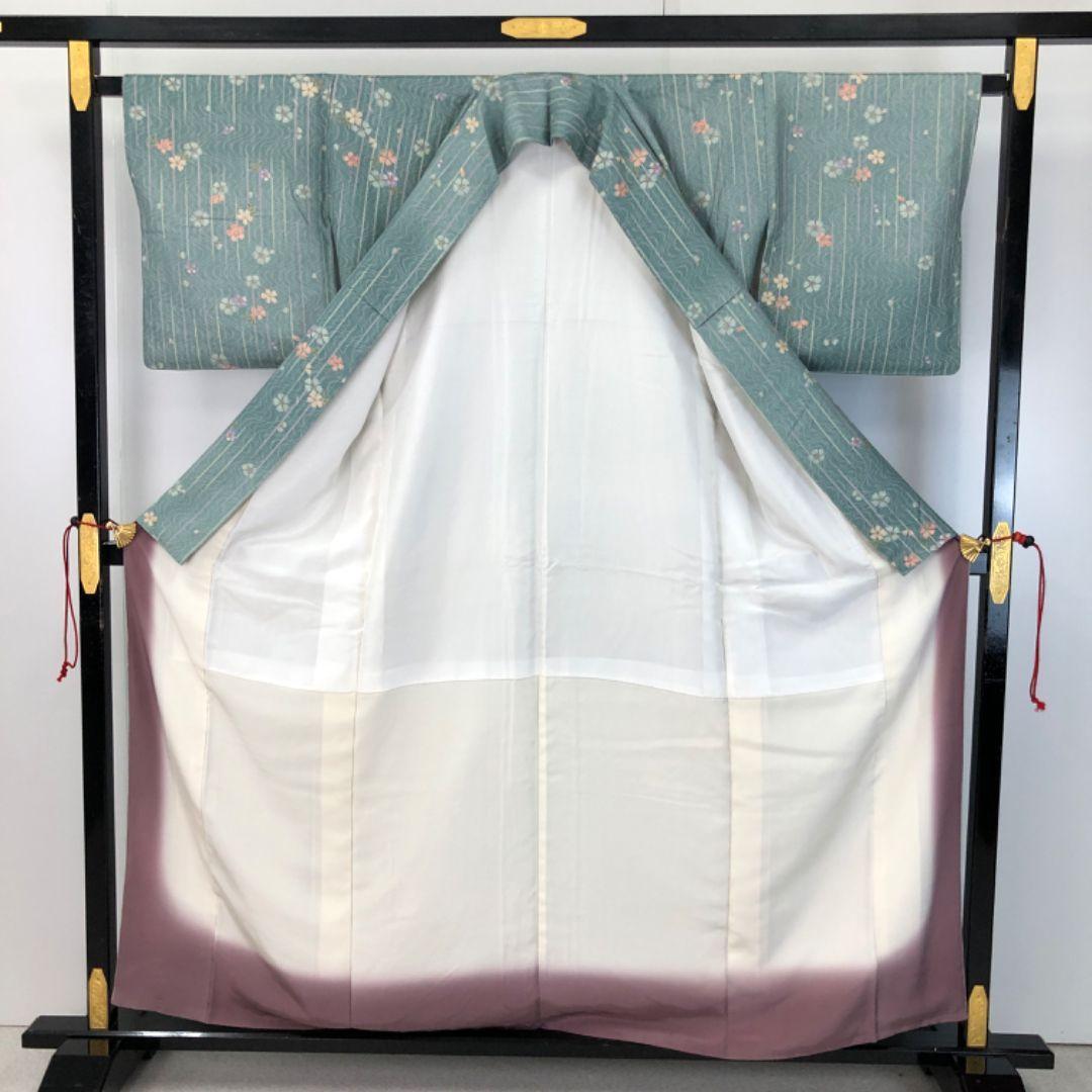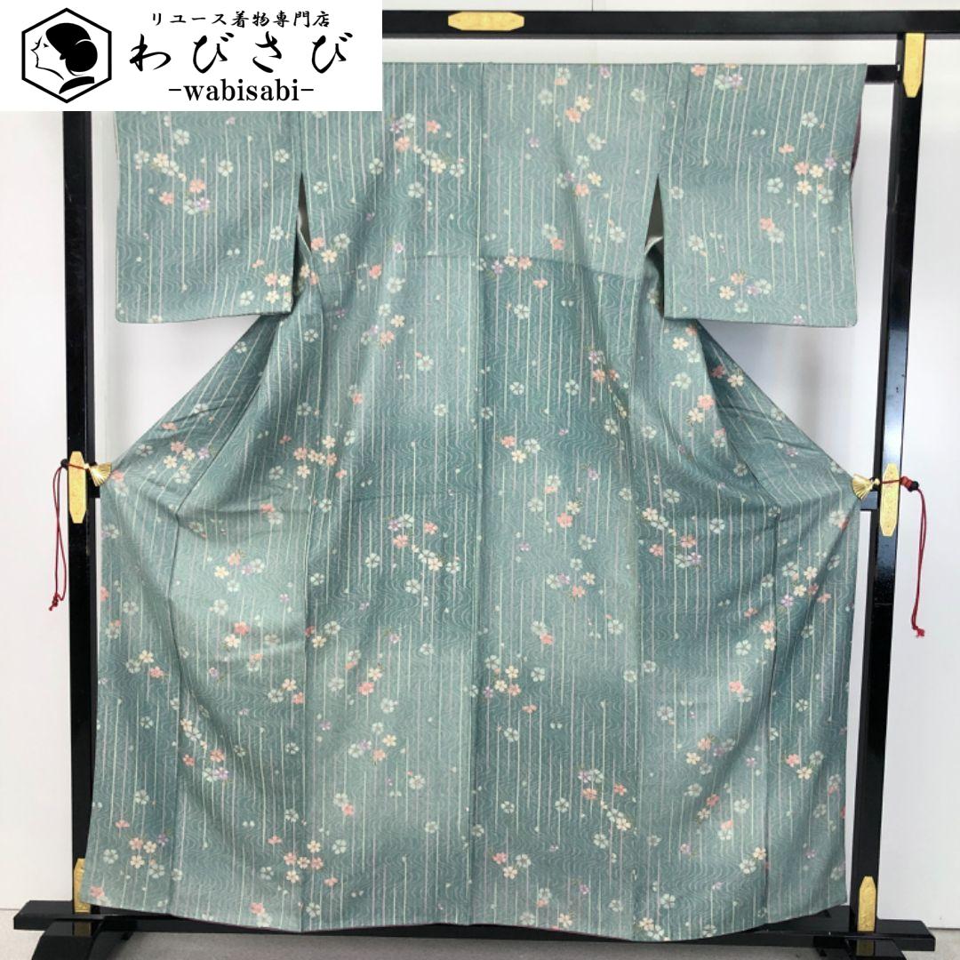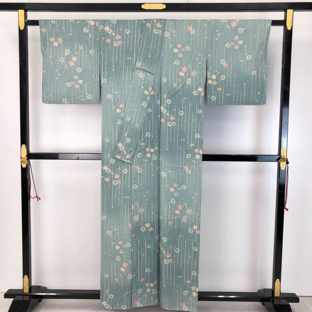 深川鼠色のお色味に縦縞、流水に花模様の柄裄がデザインされた雰囲気の良い素敵なお品でございます。
