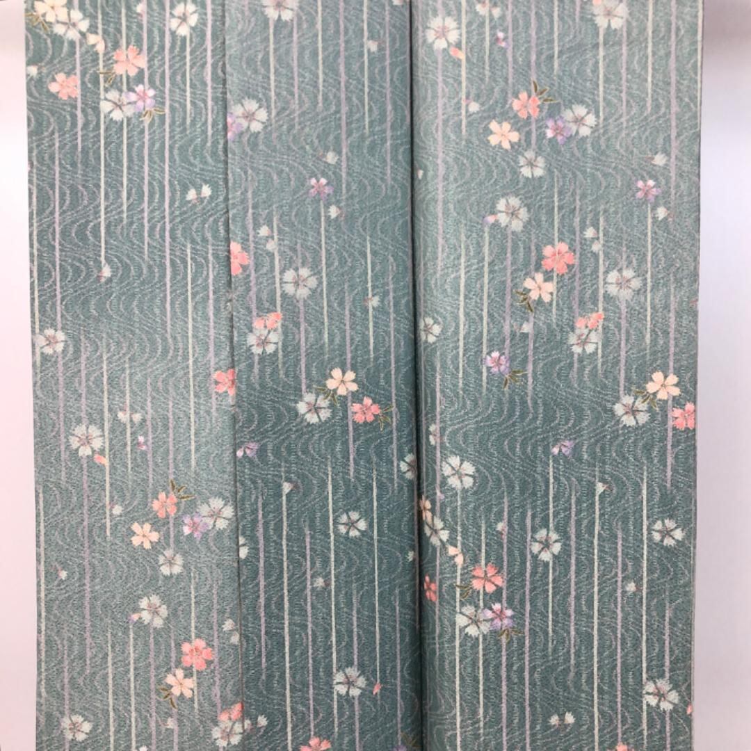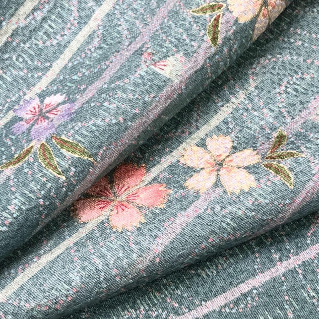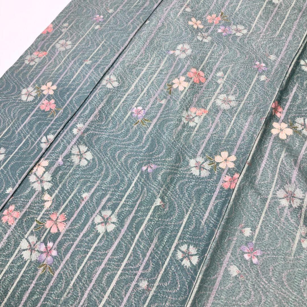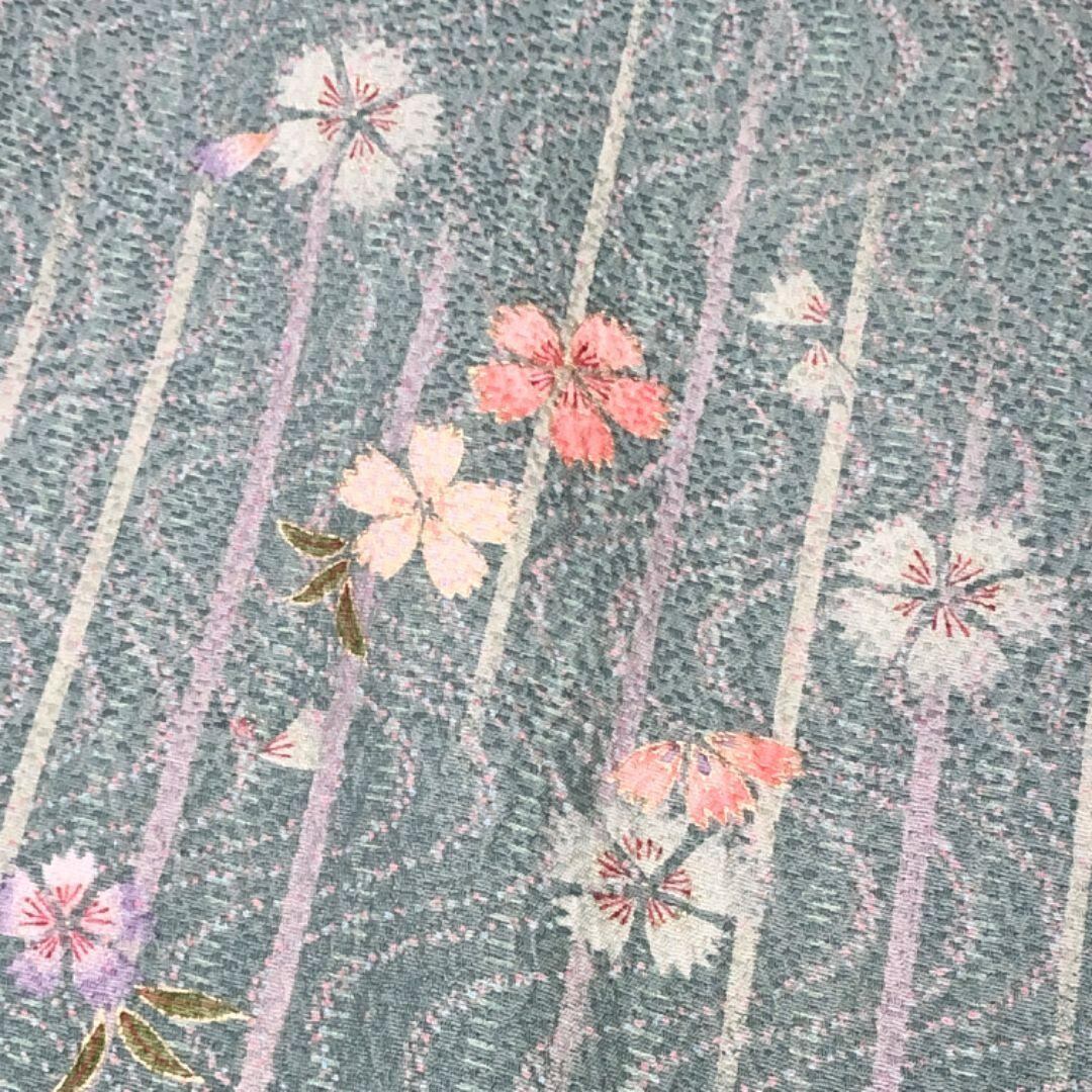 深川鼠色のお色味に縦縞、流水に花模様の柄裄がデザインされた雰囲気の良い素敵なお品でございます。