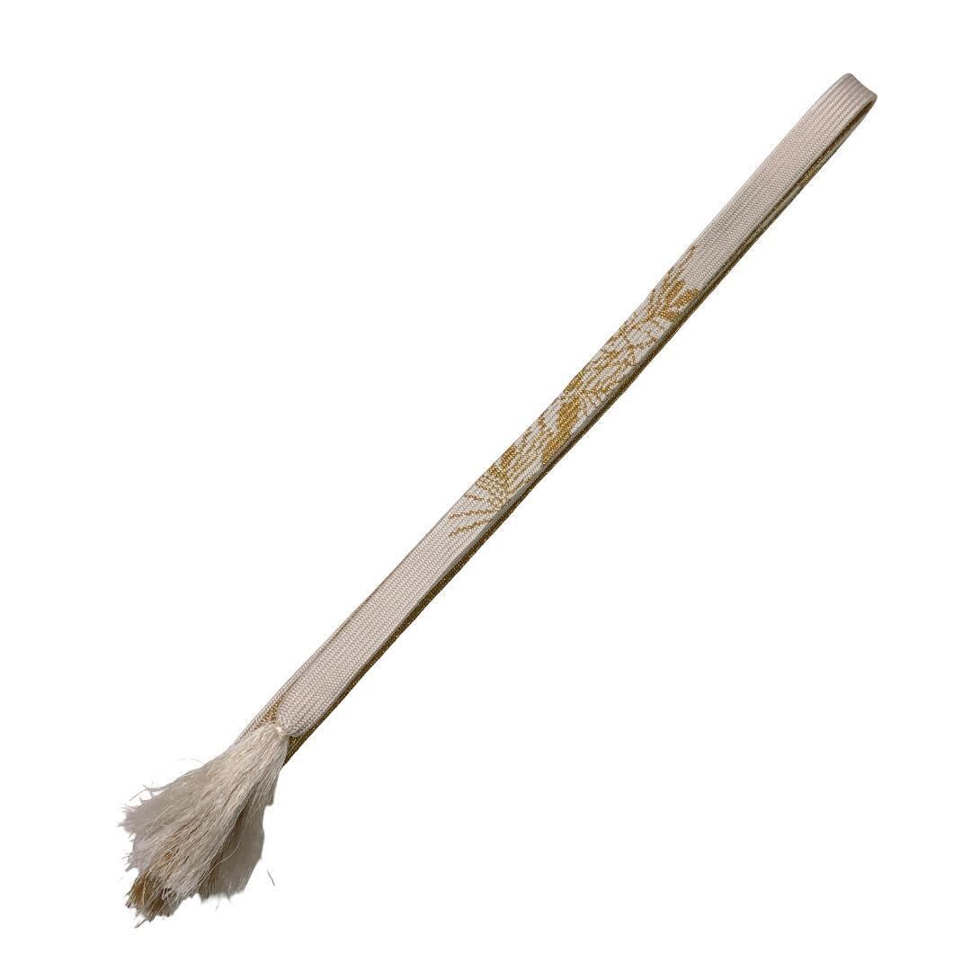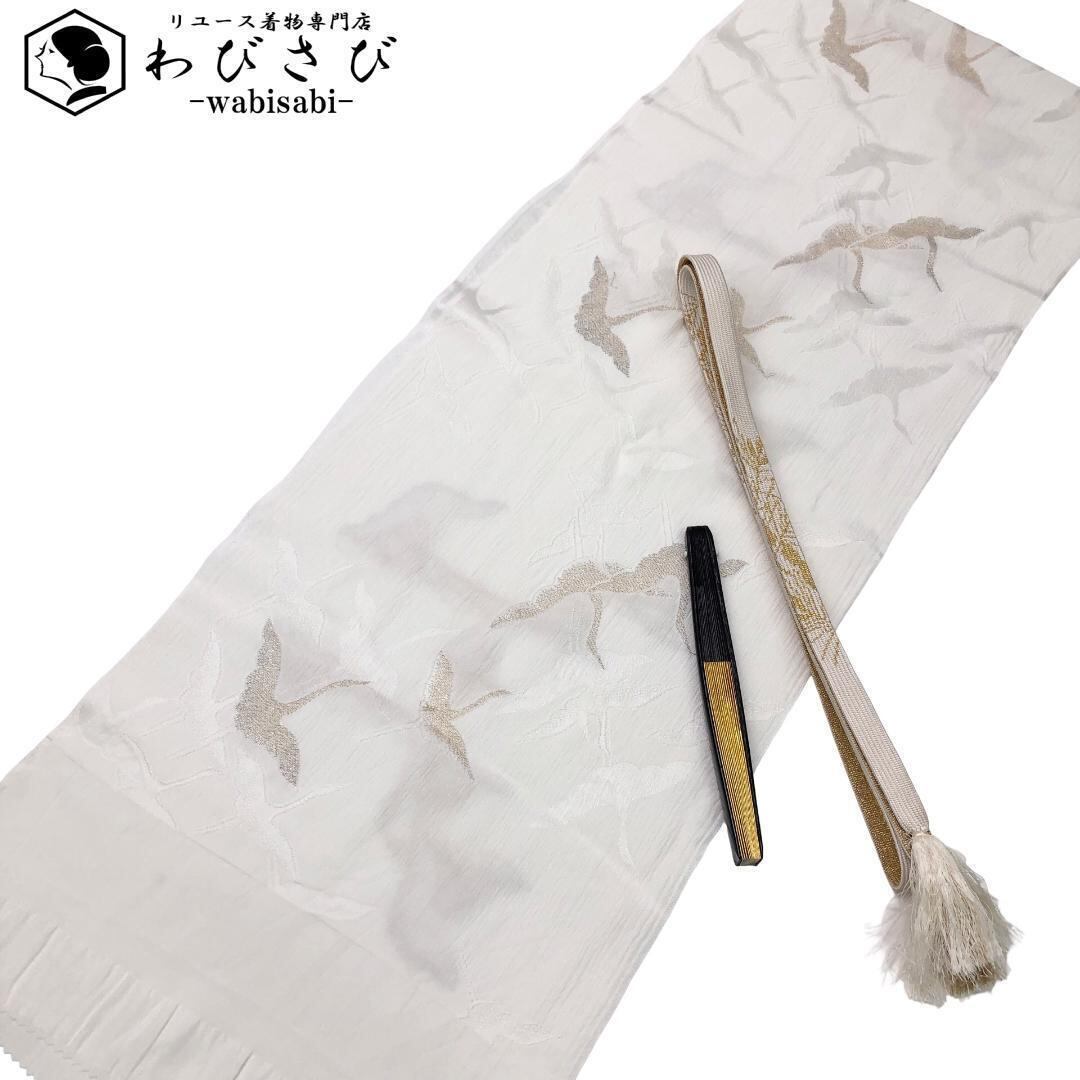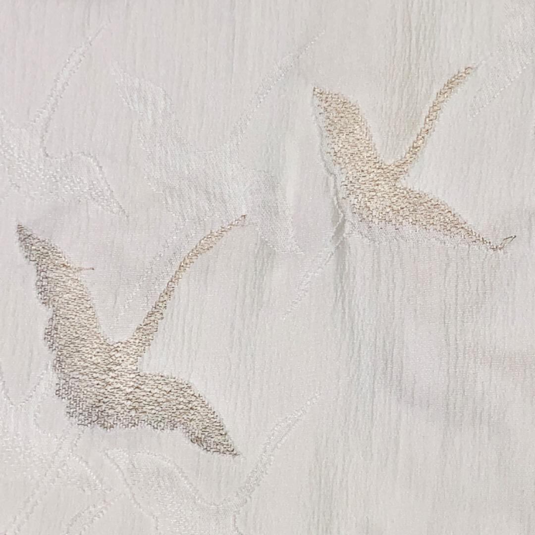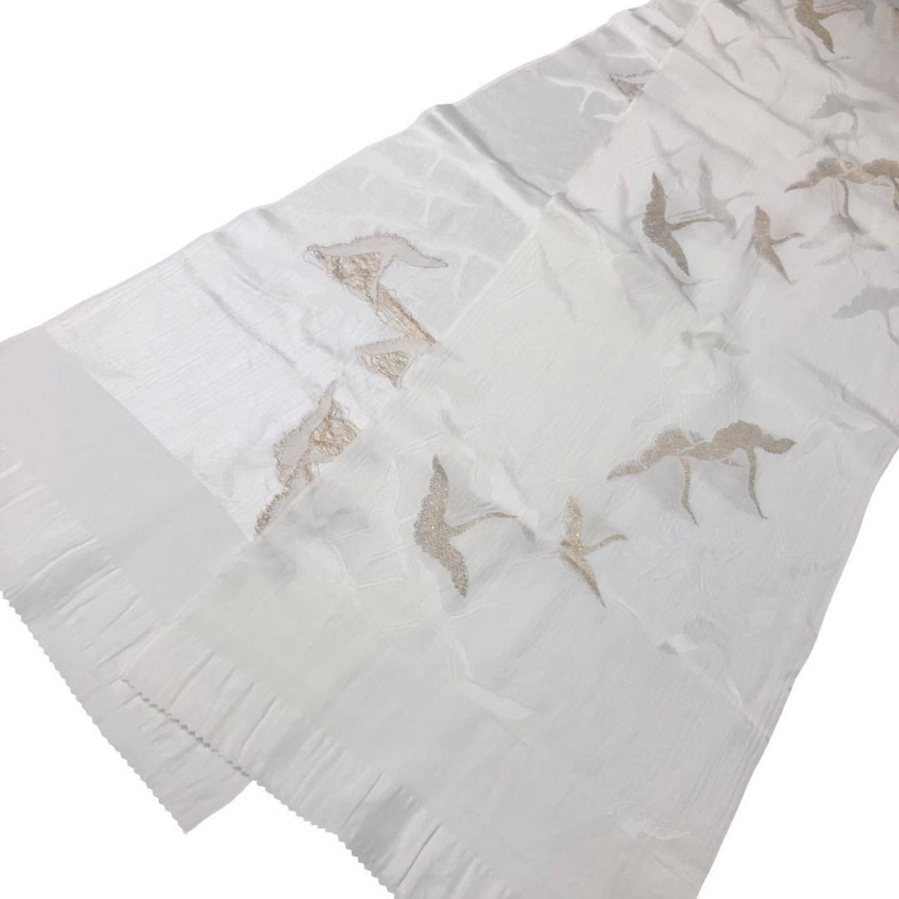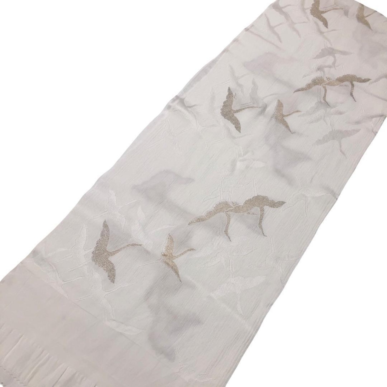 乳白色のお色味に飛翔鶴の柄裄がデザインされた帯揚げ、高麗組の素敵なお品でございます。