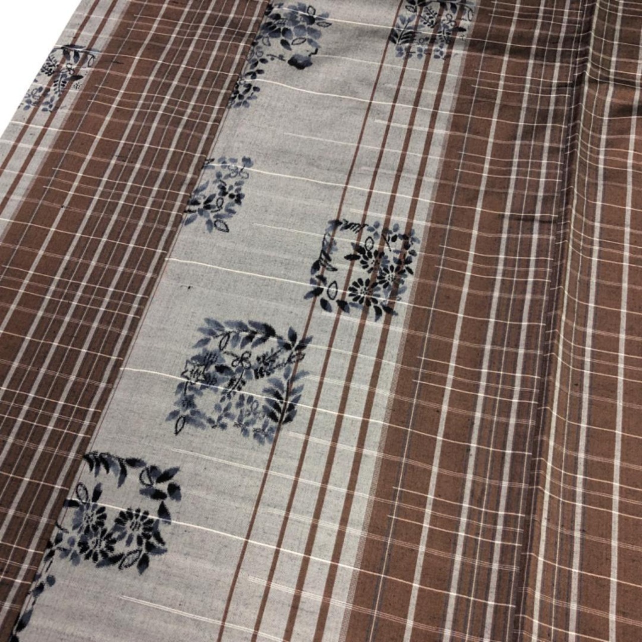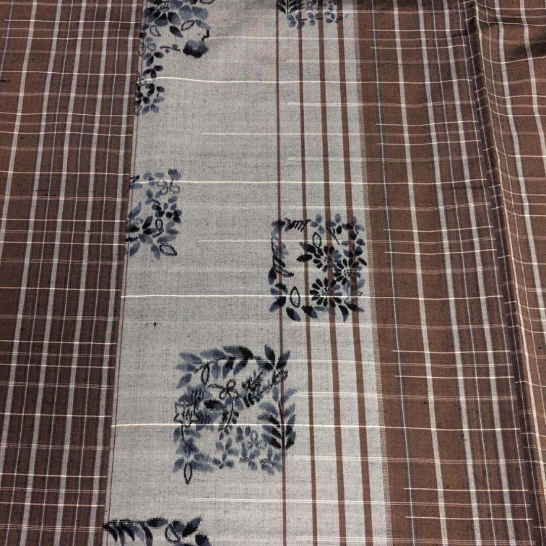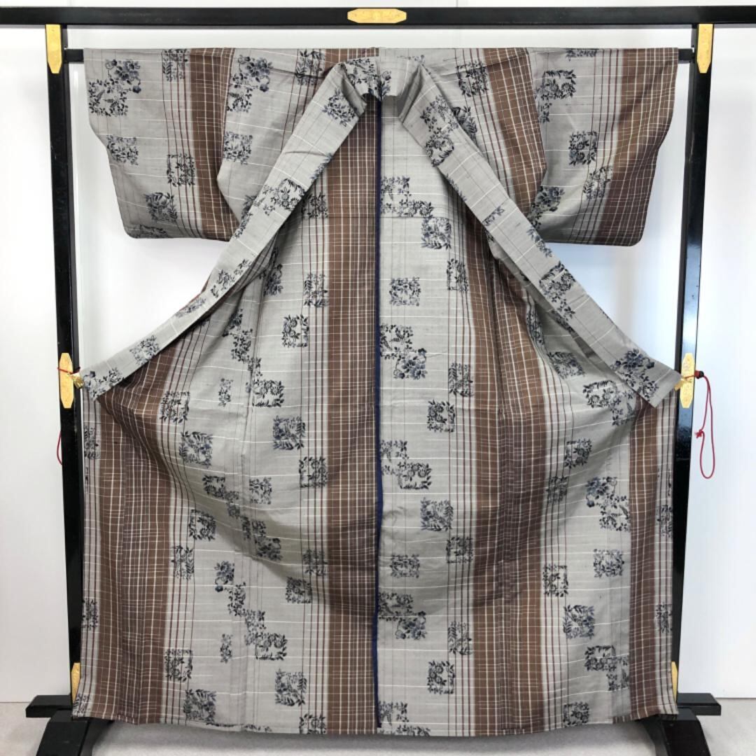 錫色のお色味に格子柄、花柄模様がデザインされた素敵な柄裄のお品でございます。