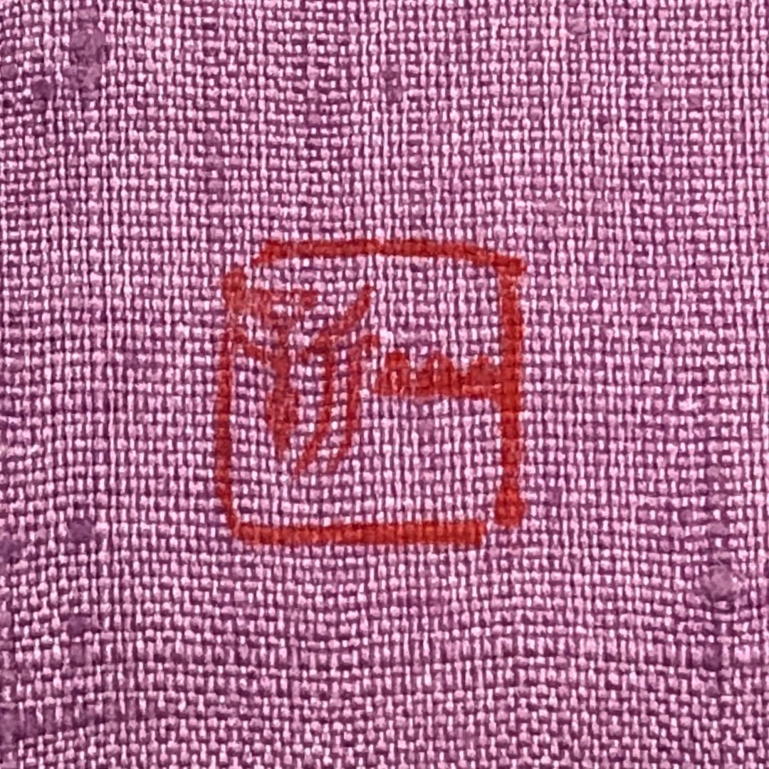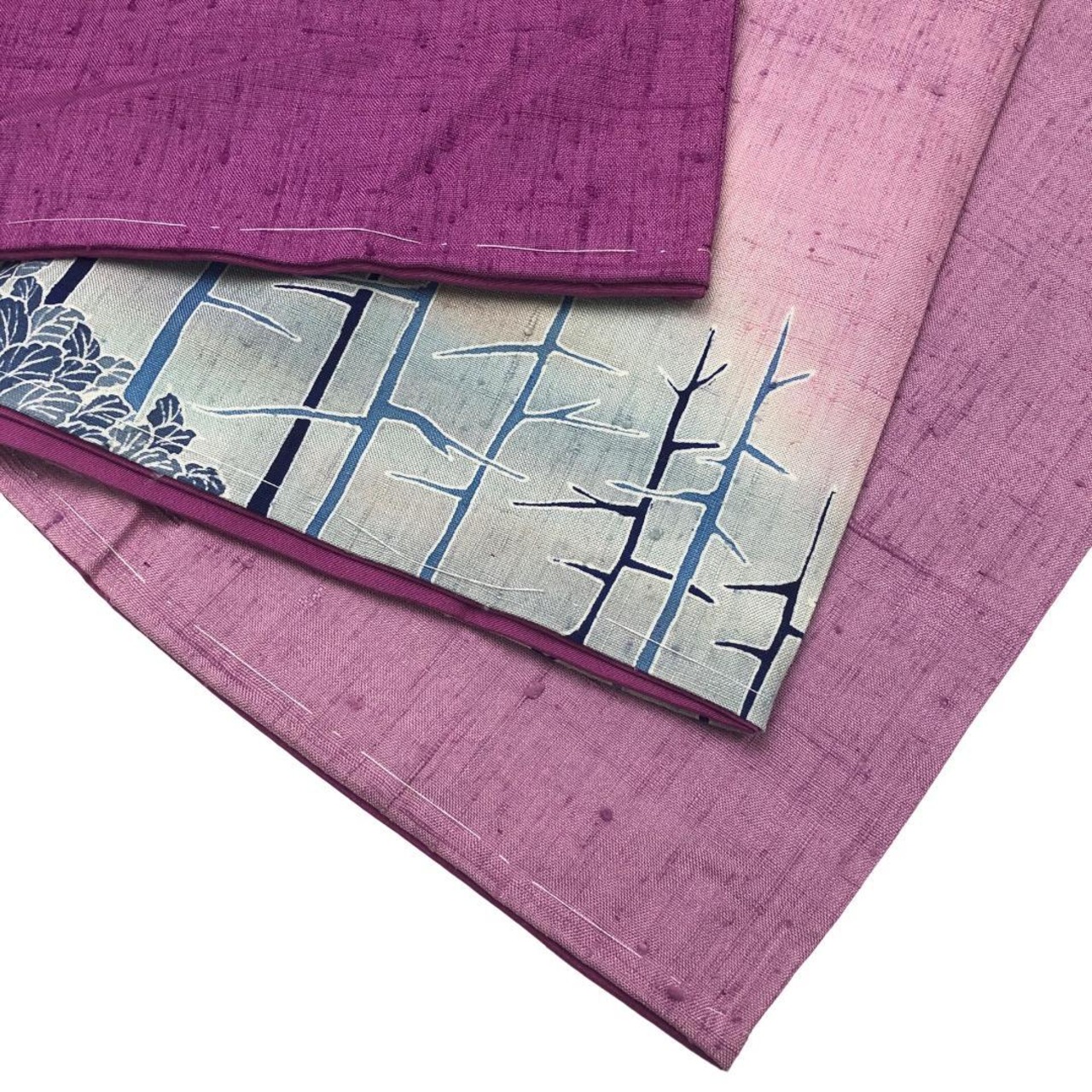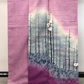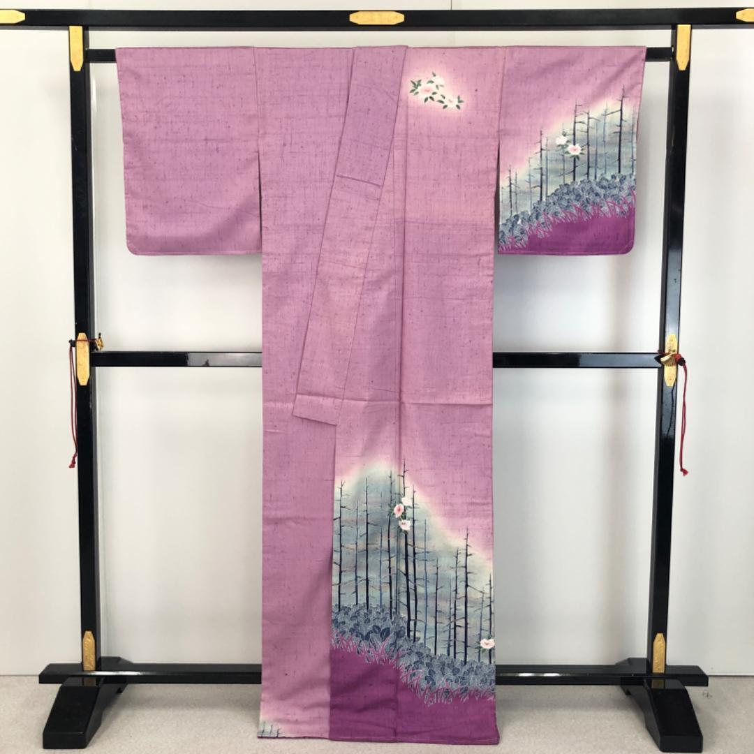 浅紫色ベースのお色味に木々、花模様の手描きの柄裄がデザインされた雰囲気の良い素敵なお品でございます。