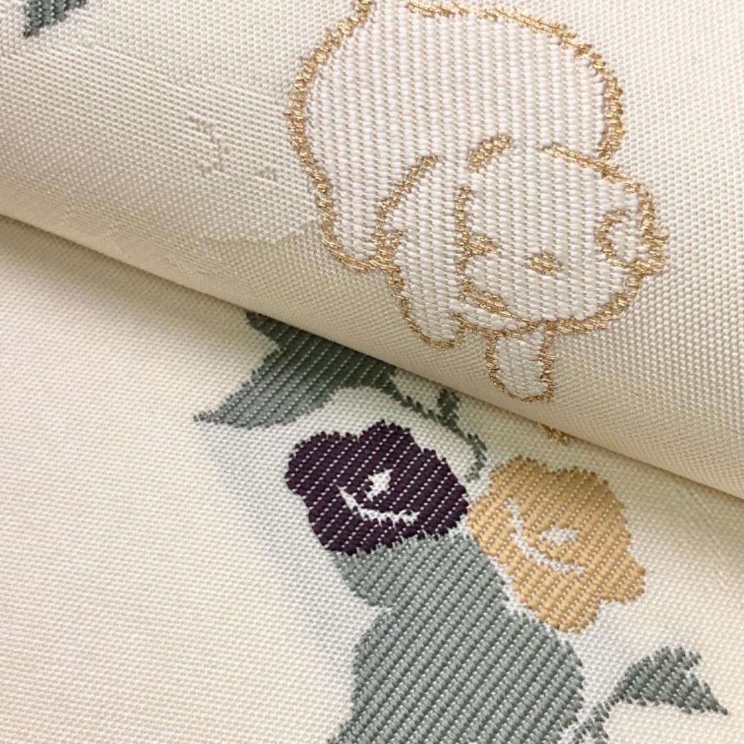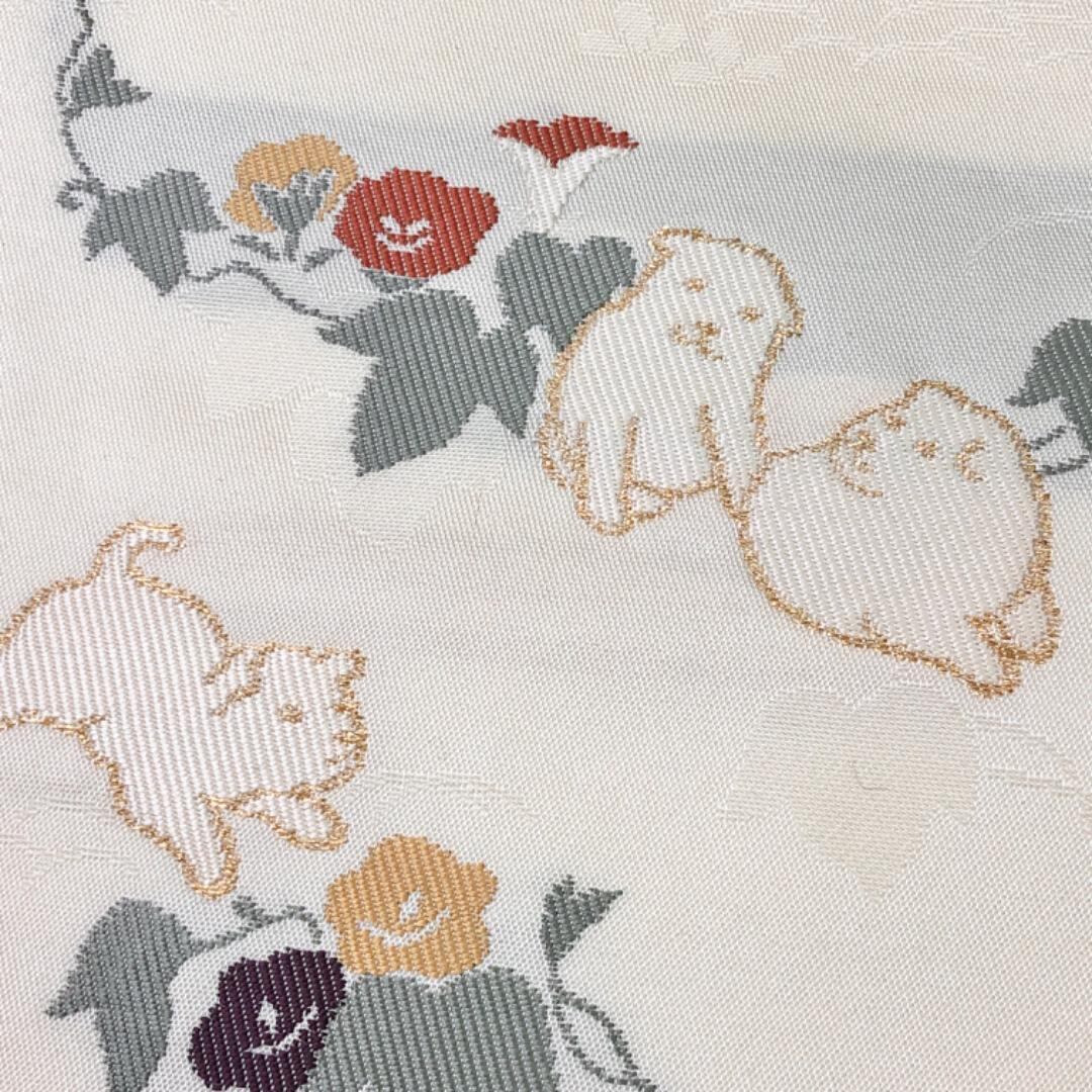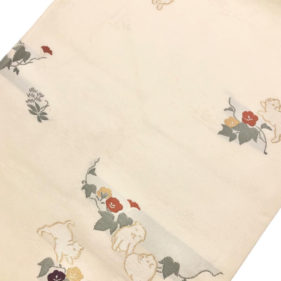 鳥の子色のお色味にかわいい犬に花模様の柄裄がデザインされた素敵なお品でございます。