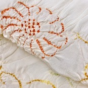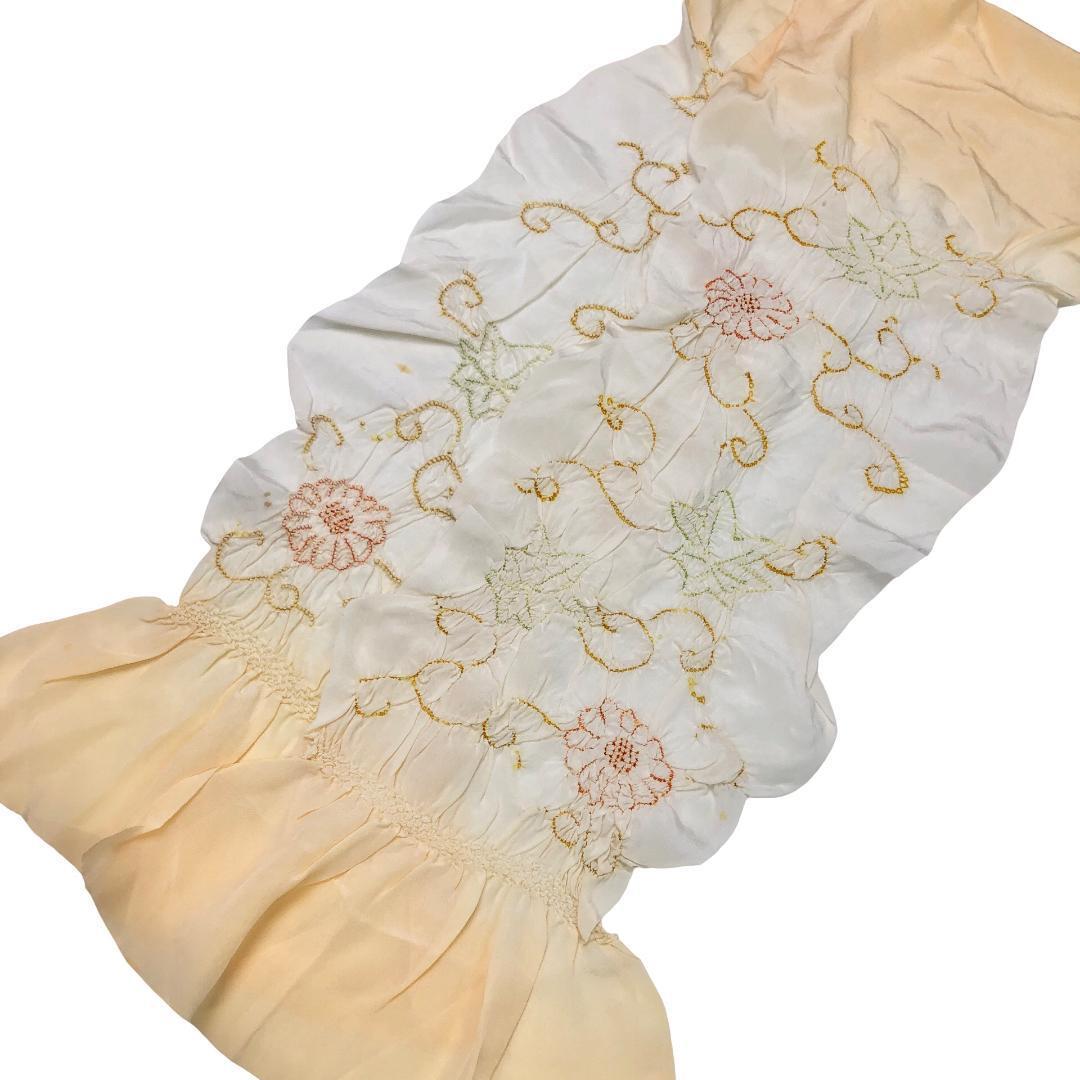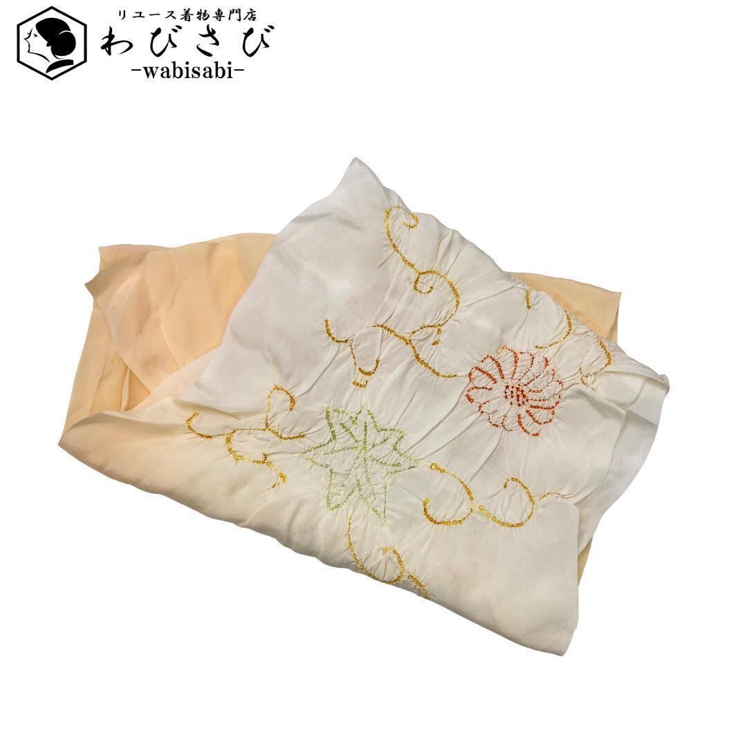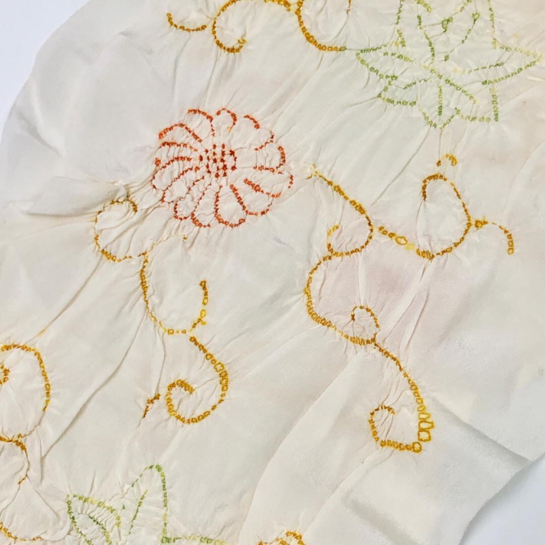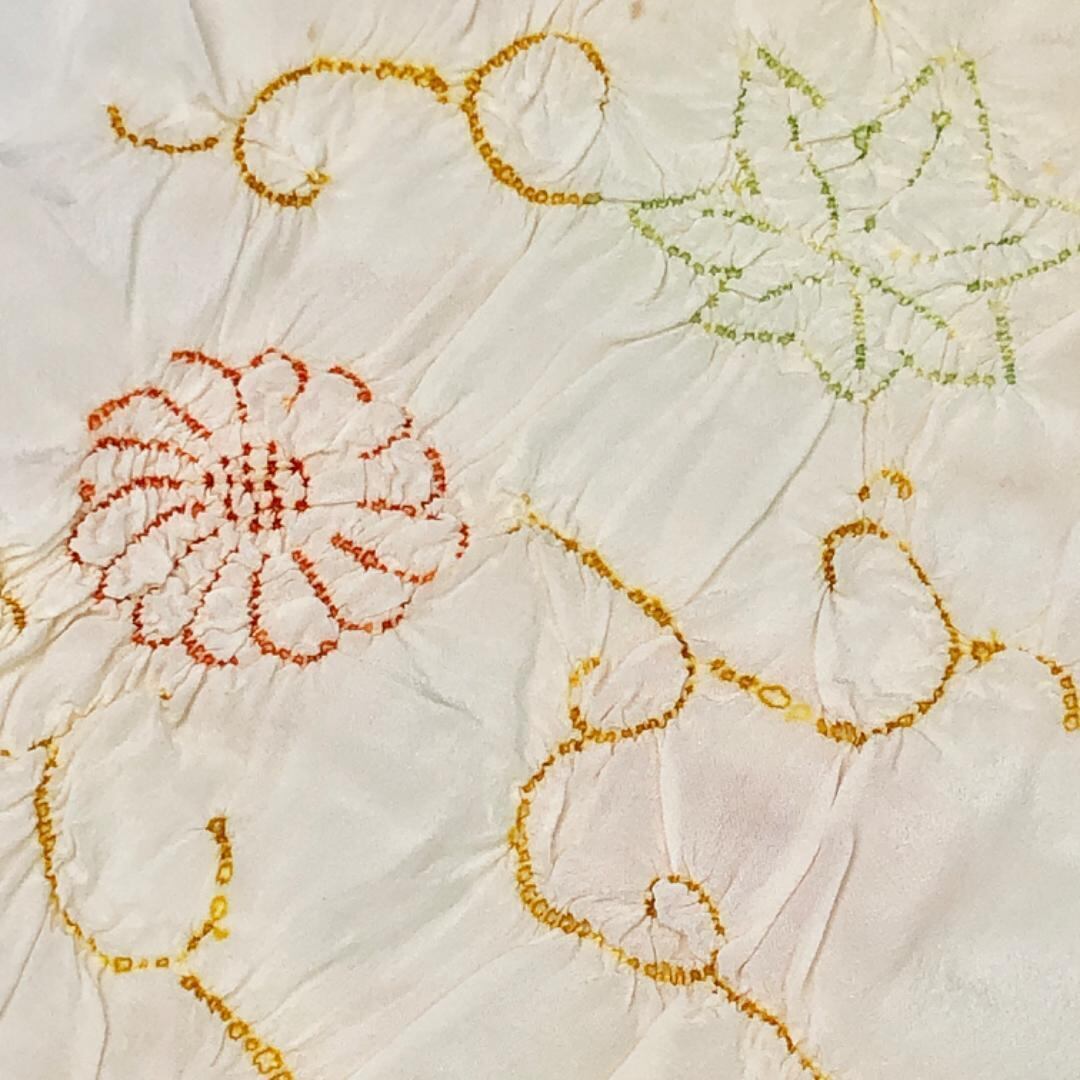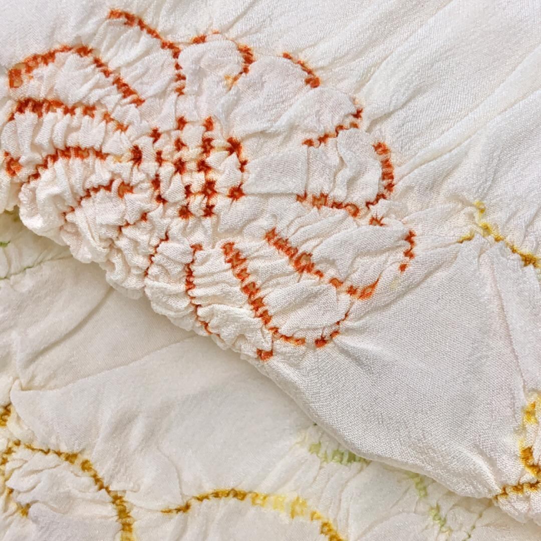 乳白色ベースのグラデーションのお色味に絞りに花模様の柄裄がデザインされた素敵なお品でございます。