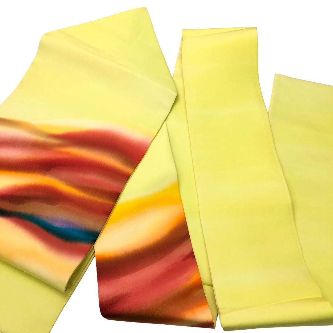 檸檬色の塩瀬に色使いの印象的な暈し模様がデザインされた素敵なお品でございます。