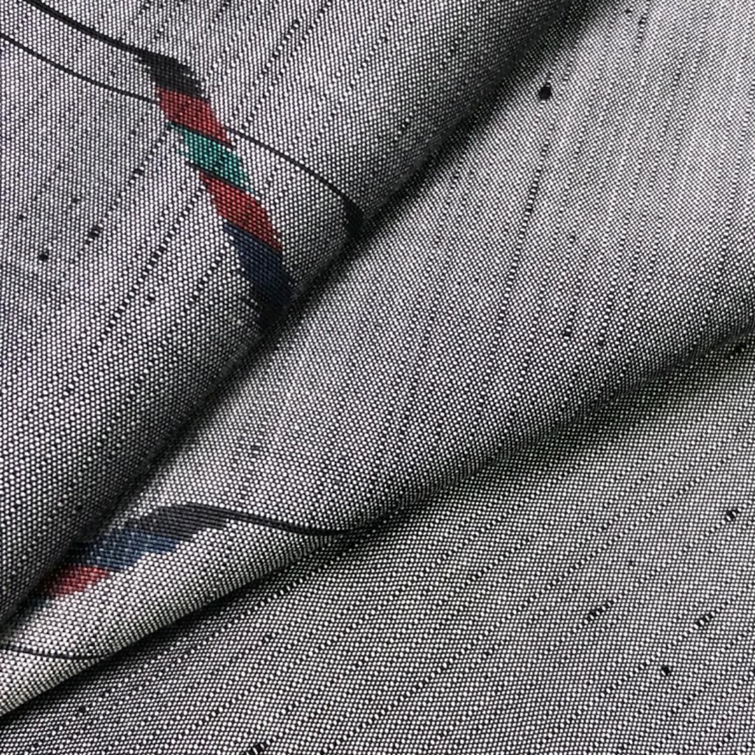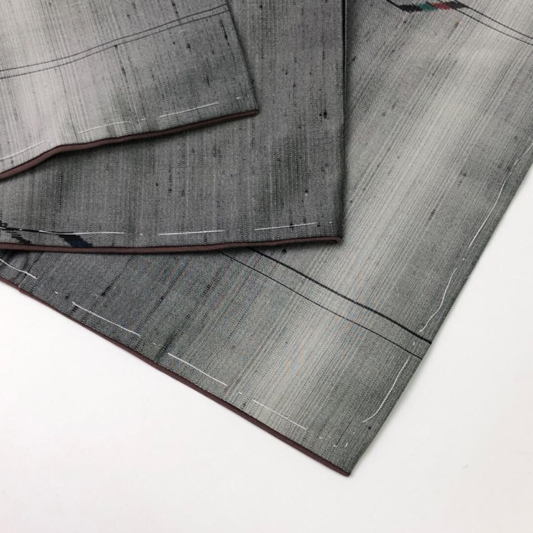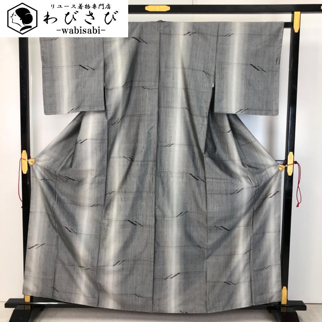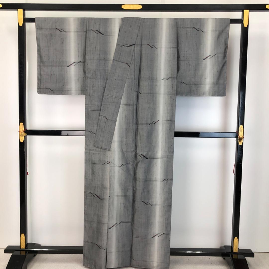 灰色ベースの縦縞のグラデーションに抽象模様の柄裄がデザインされた雰囲気の良い素敵なお品でございます。