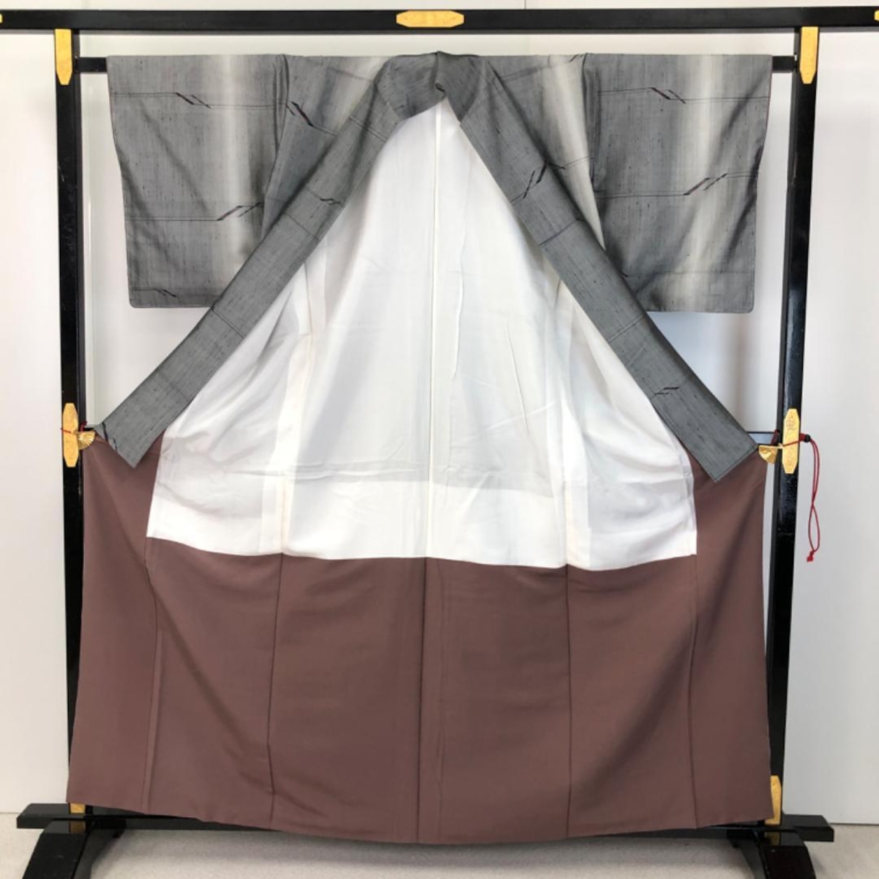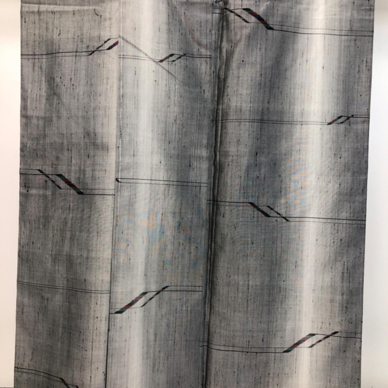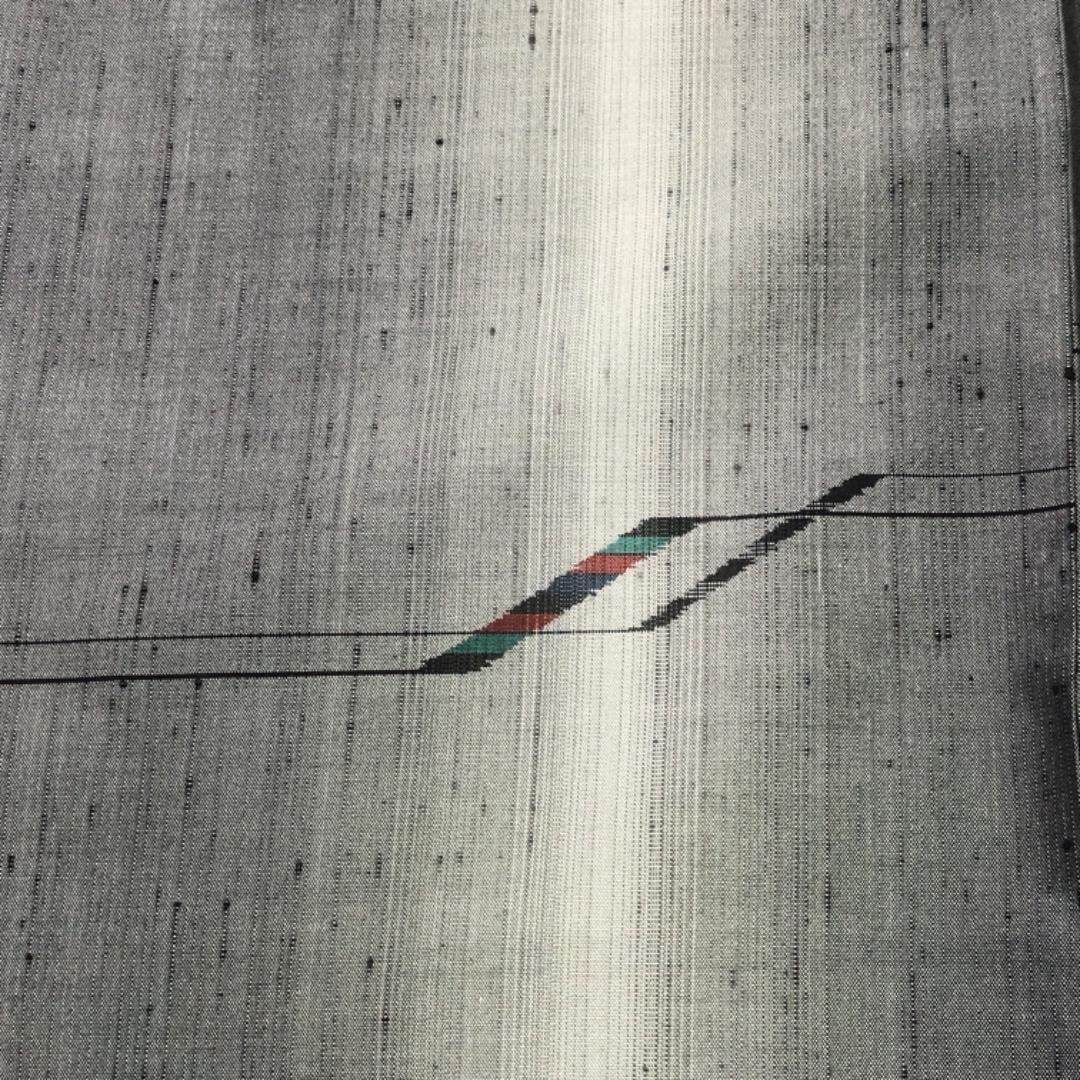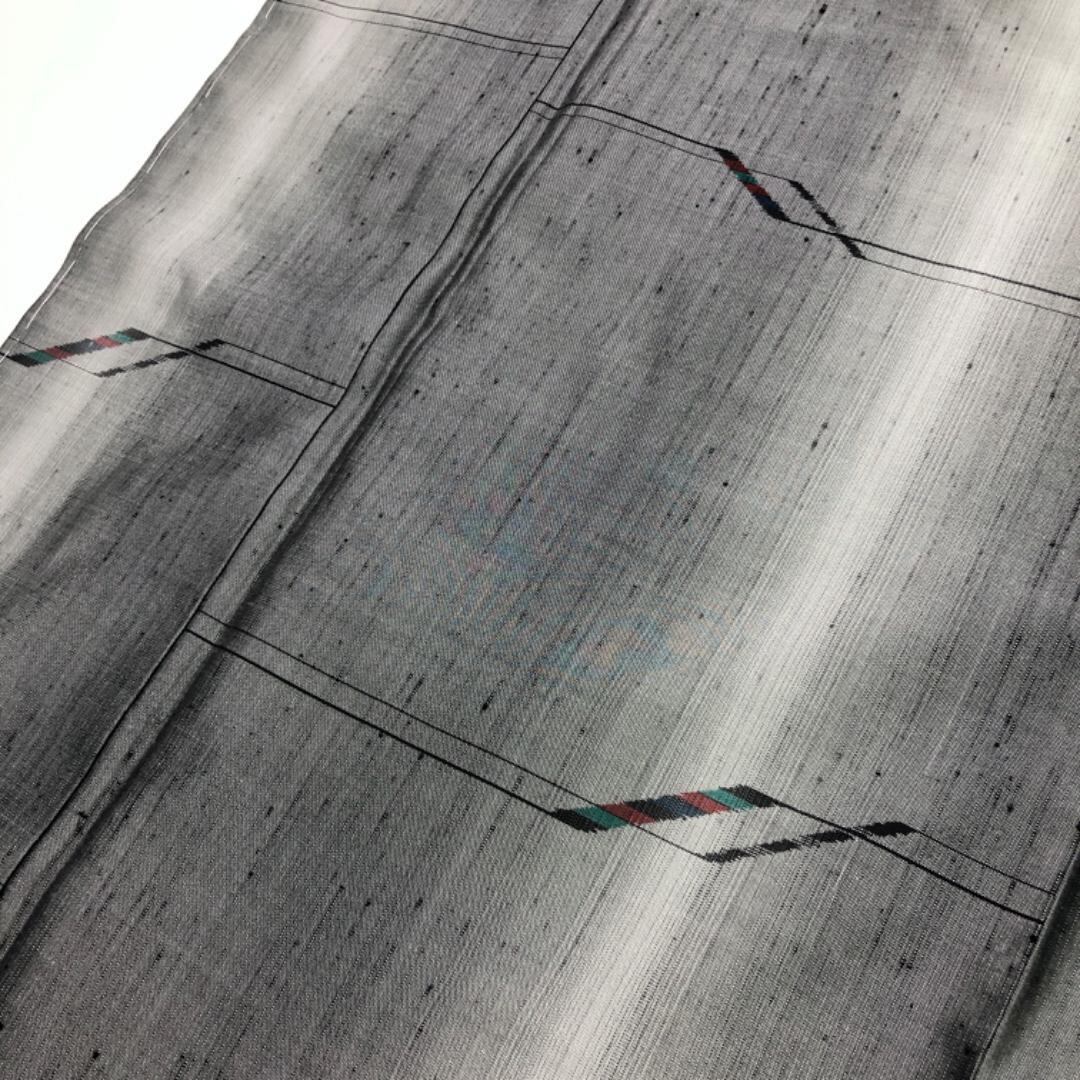 灰色ベースの縦縞のグラデーションに抽象模様の柄裄がデザインされた雰囲気の良い素敵なお品でございます。