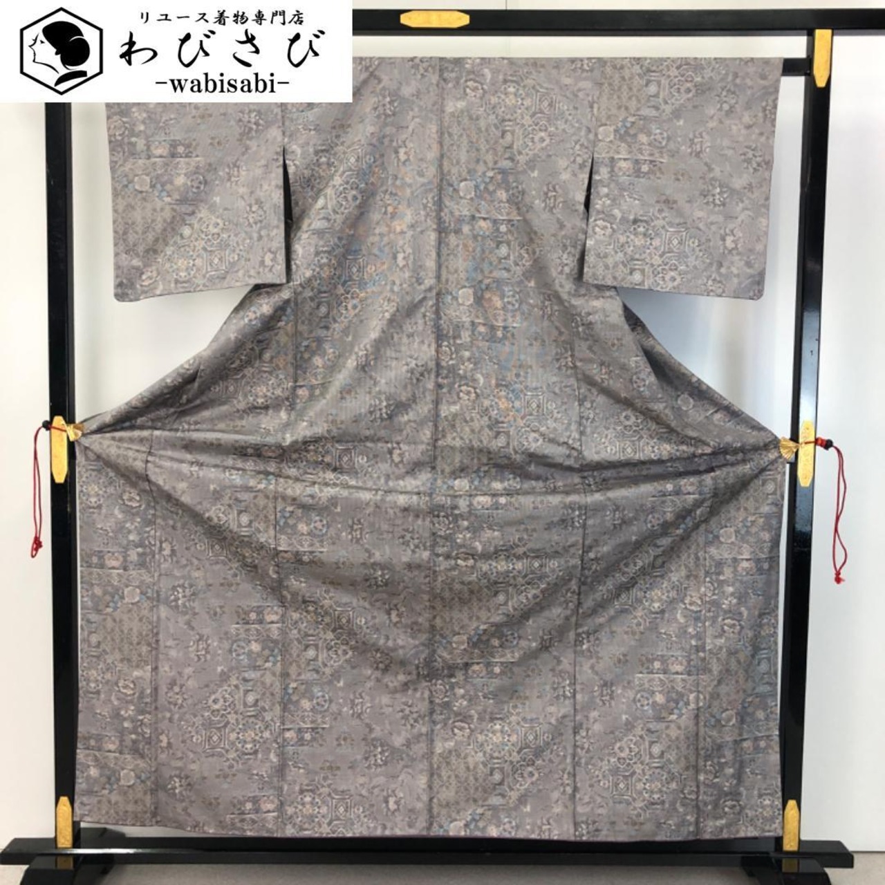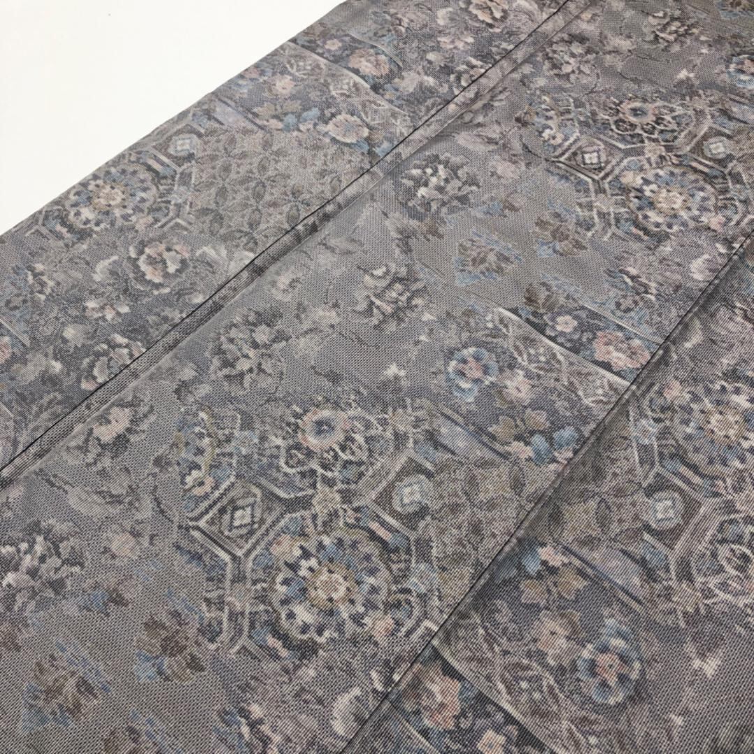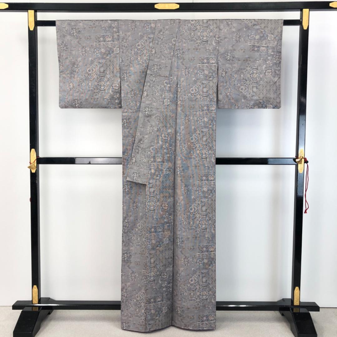 燻銀色ベースのお色味に蜀江紋様、花模様の柄裄がデザインされた素敵なお品でございます。