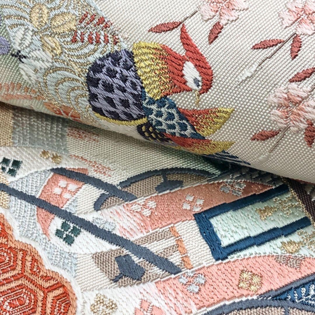 袋帯 綴れ 雪輪 鴛鴦 御所車 生成色 金糸 O-5408 着物 きもの kimono 和服 和装 中古 リサイクル着物 【送料無料】