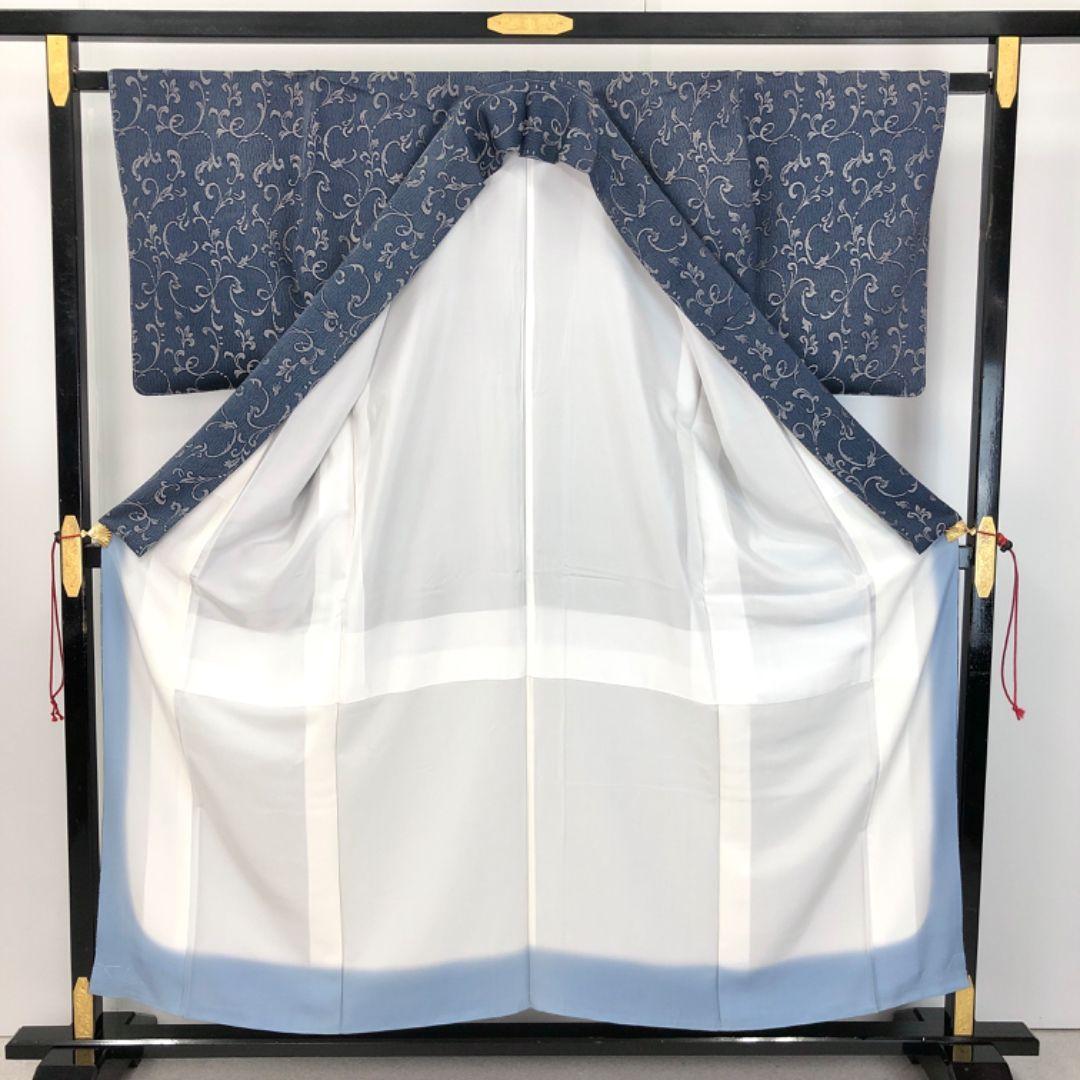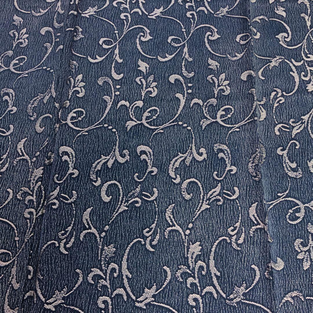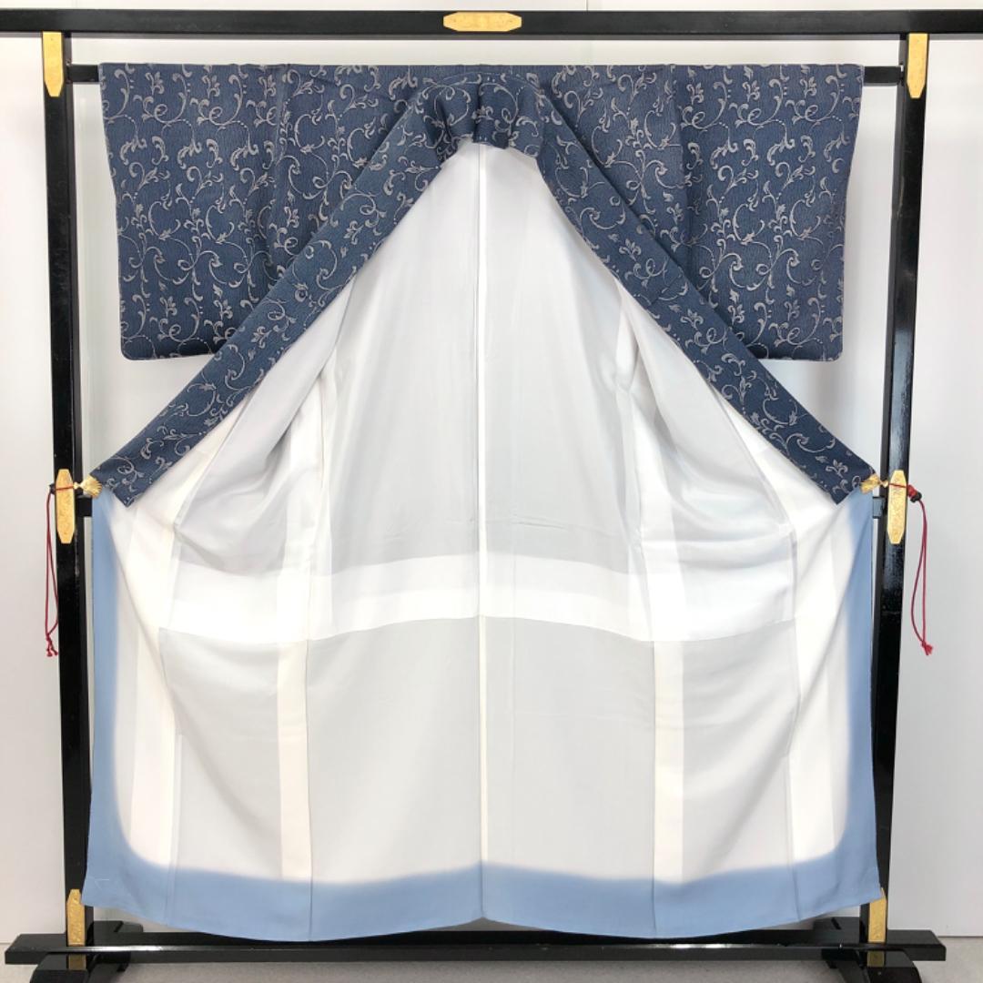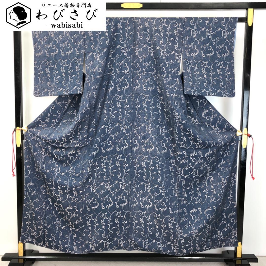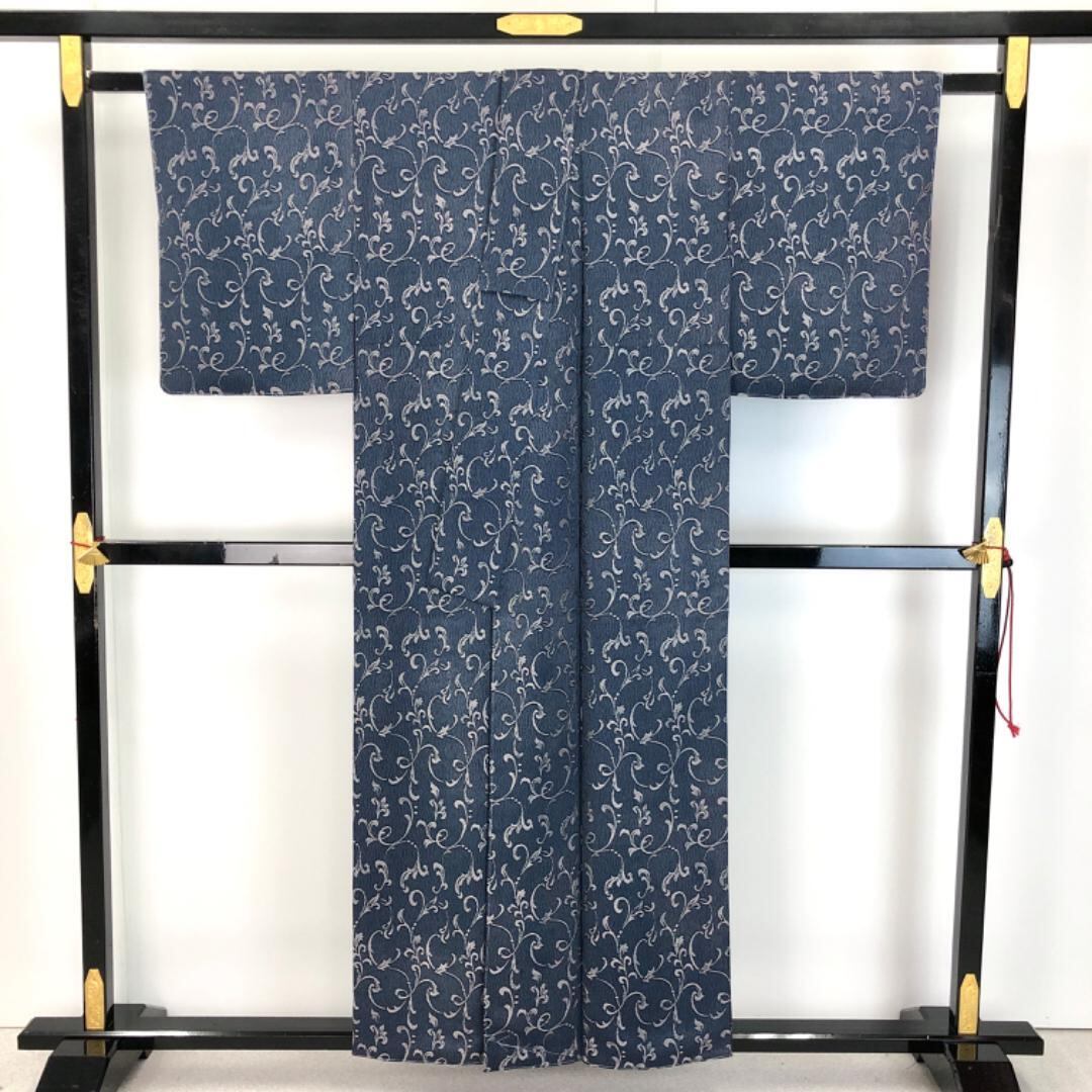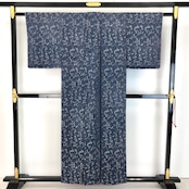 紺藍色のお色味に花唐草模様がデザインされた素敵な柄裄のお品でございます。