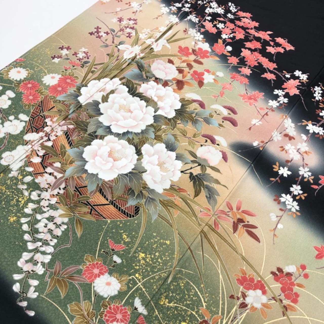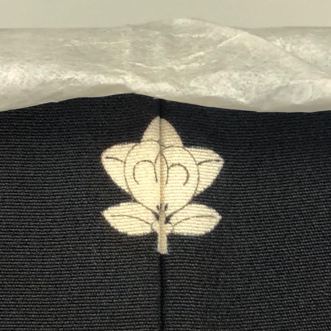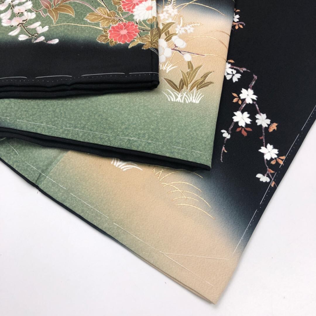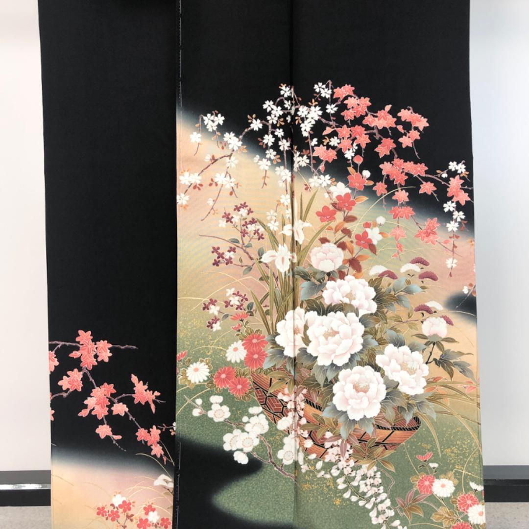 黒色のお色味に四季の花模様の柄裄がデザインされた素敵なお品でございます。