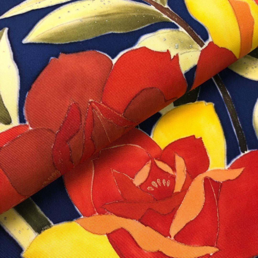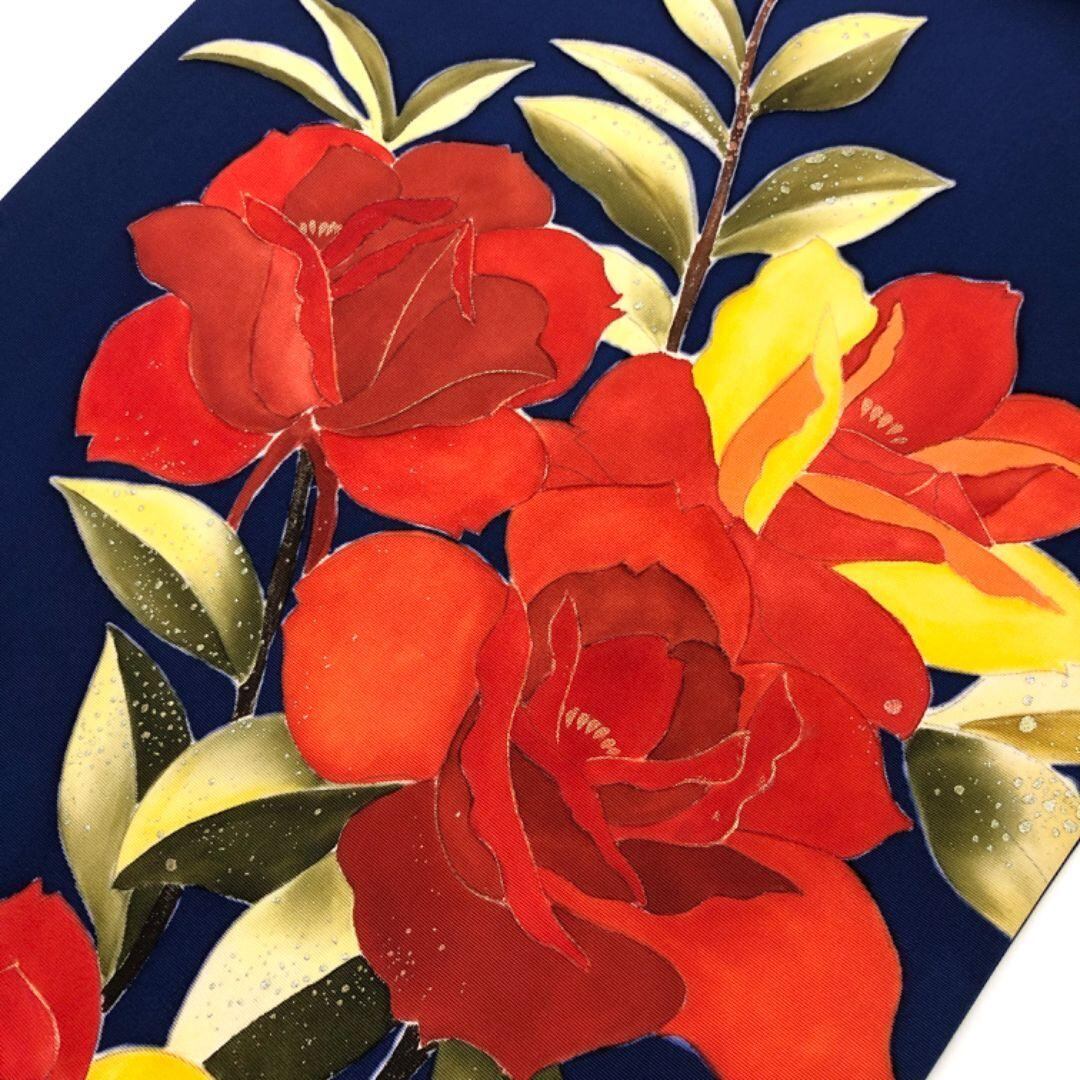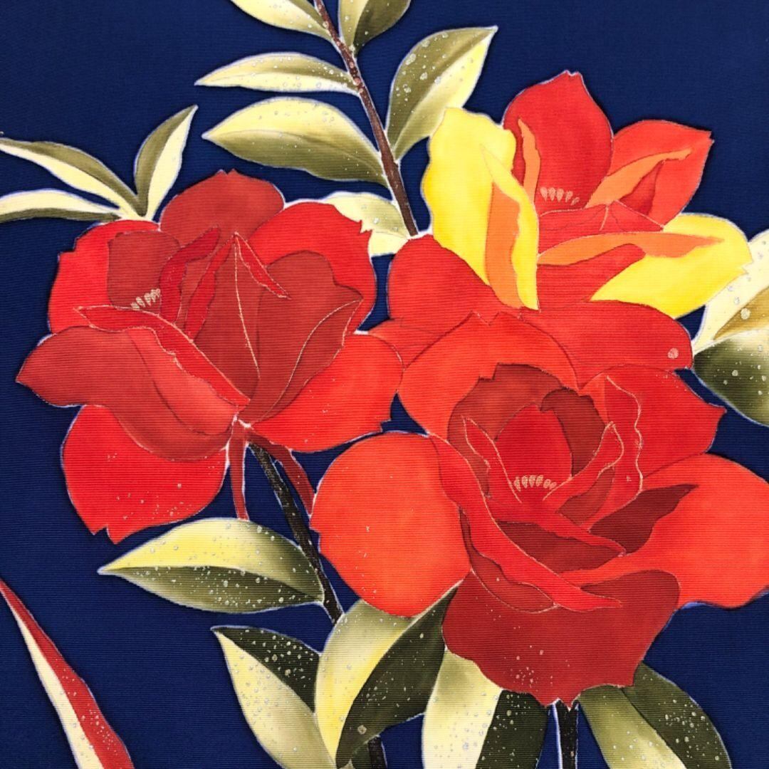 鉄葡萄色の雰囲気の良いお色味に手描きの鮮やかな花模様がデザインされた素敵なお品でございます。