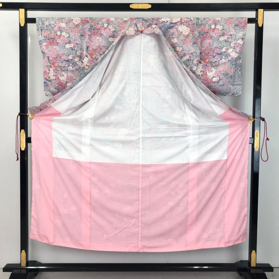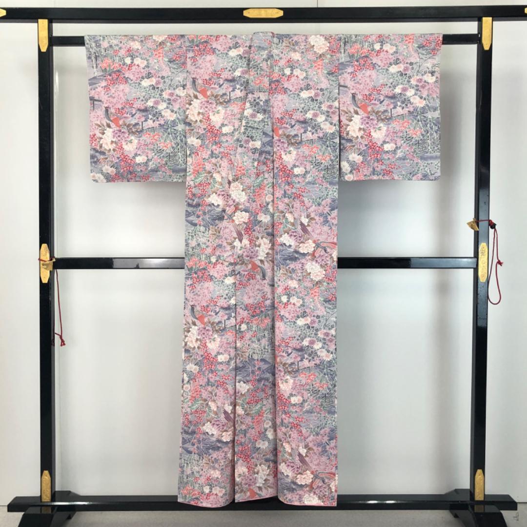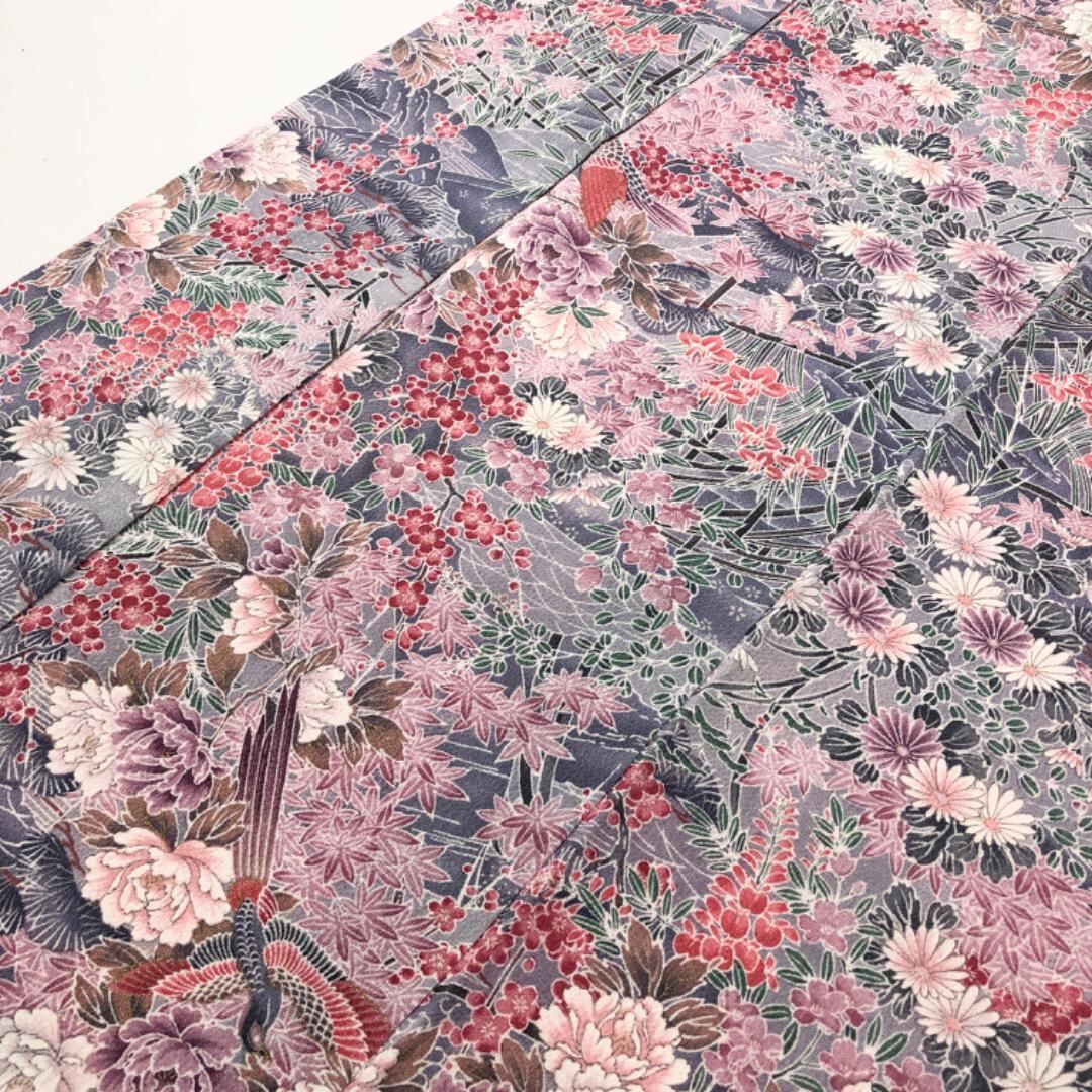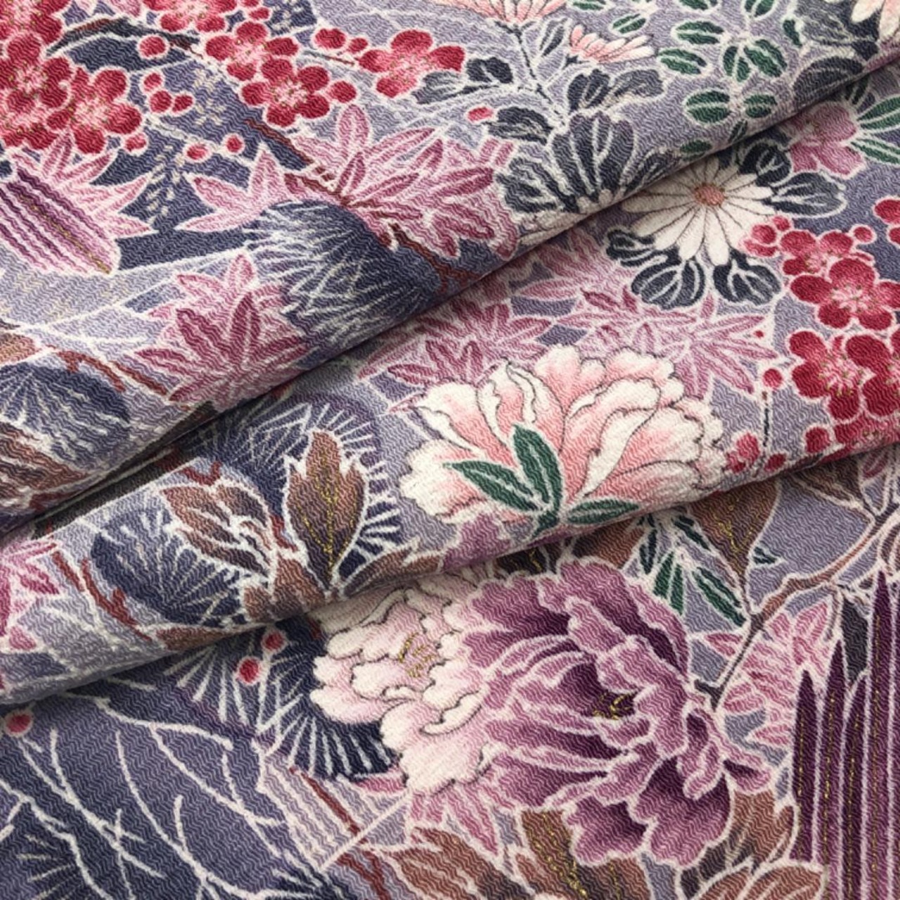 薄藤色ベースのお色味の縮緬に四季の花模様がデザインされた華やかな柄行の素敵なお品でございます。