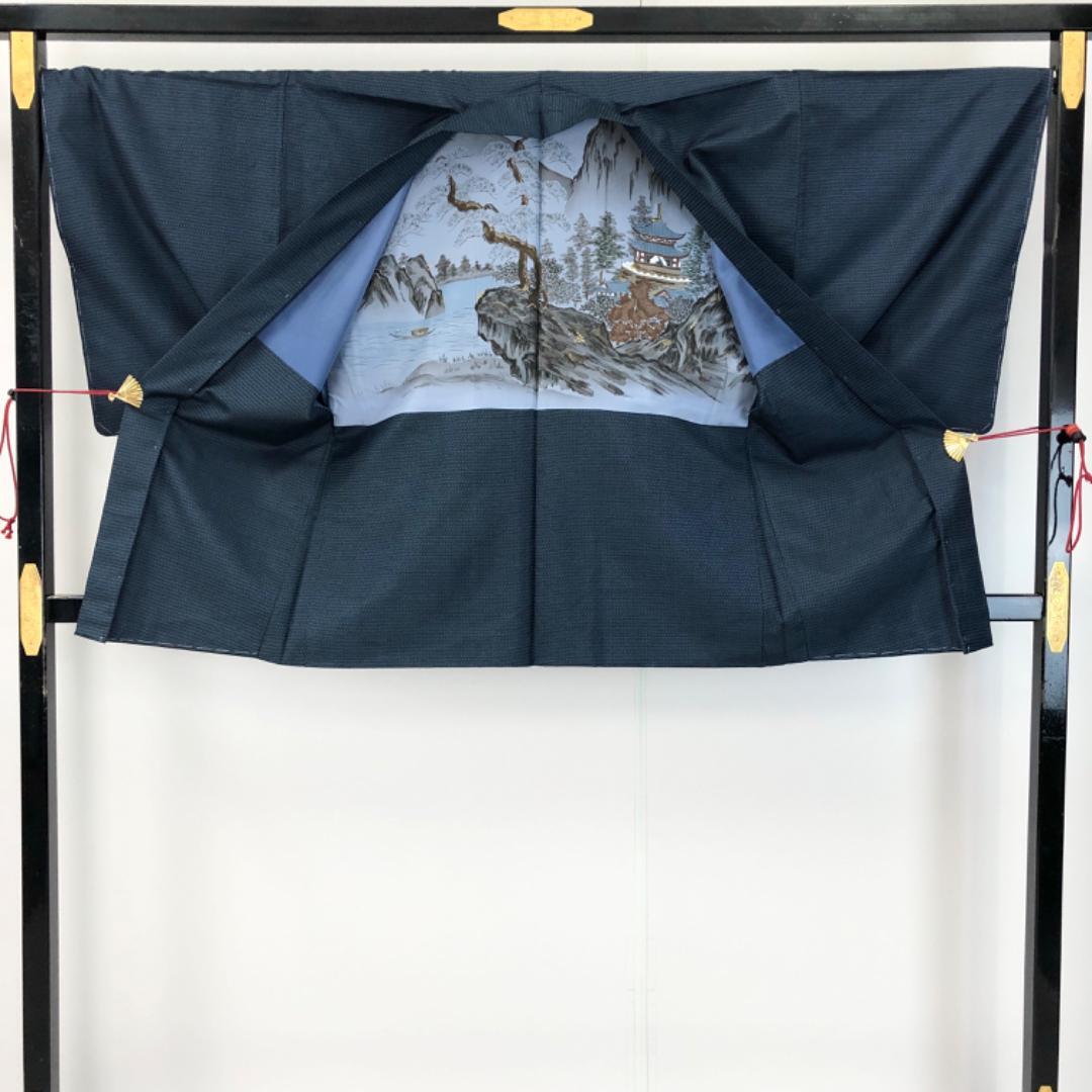 藍泥染の素敵なお色味に亀甲模様、羽裏には龍、虎の柄行がデザインされた素敵なお品でございます。