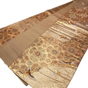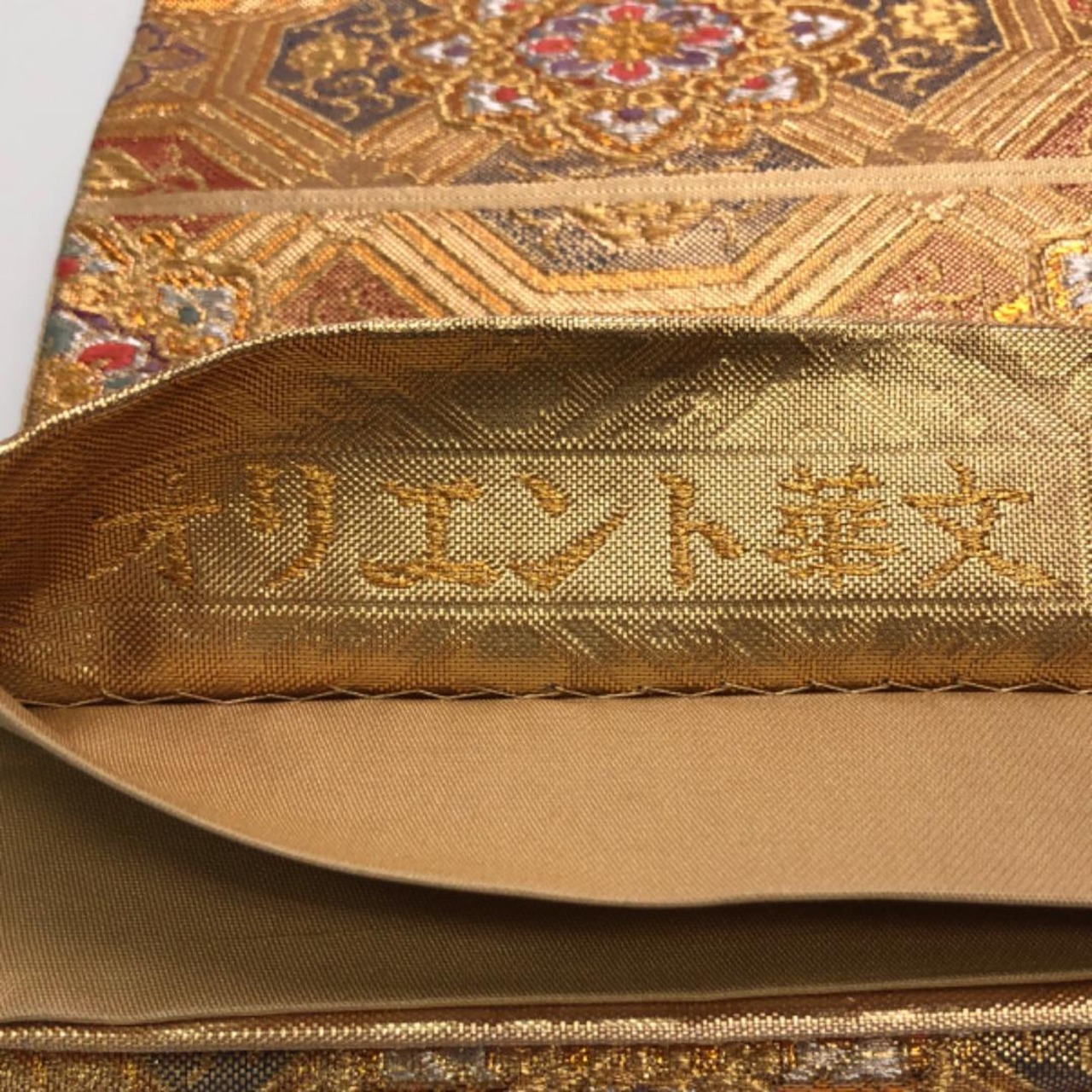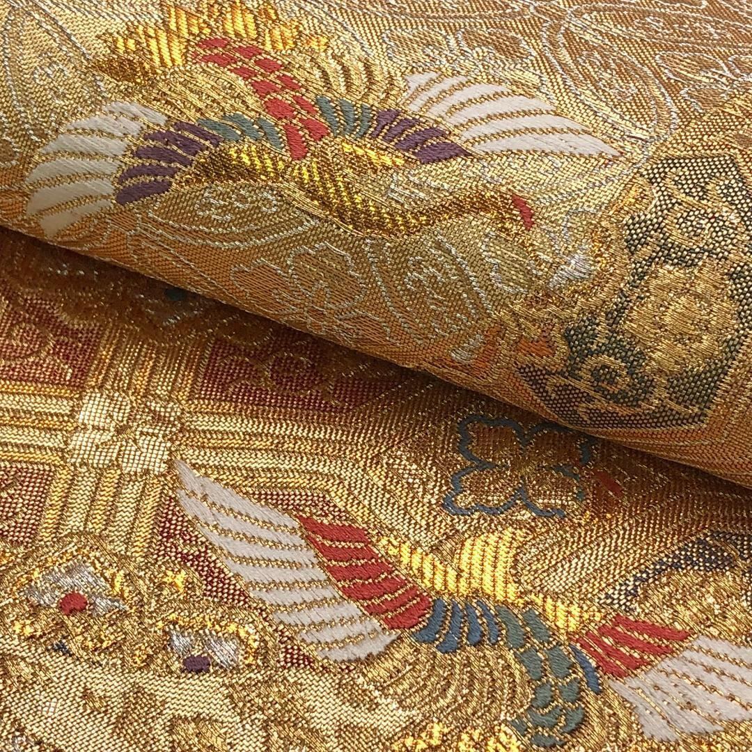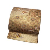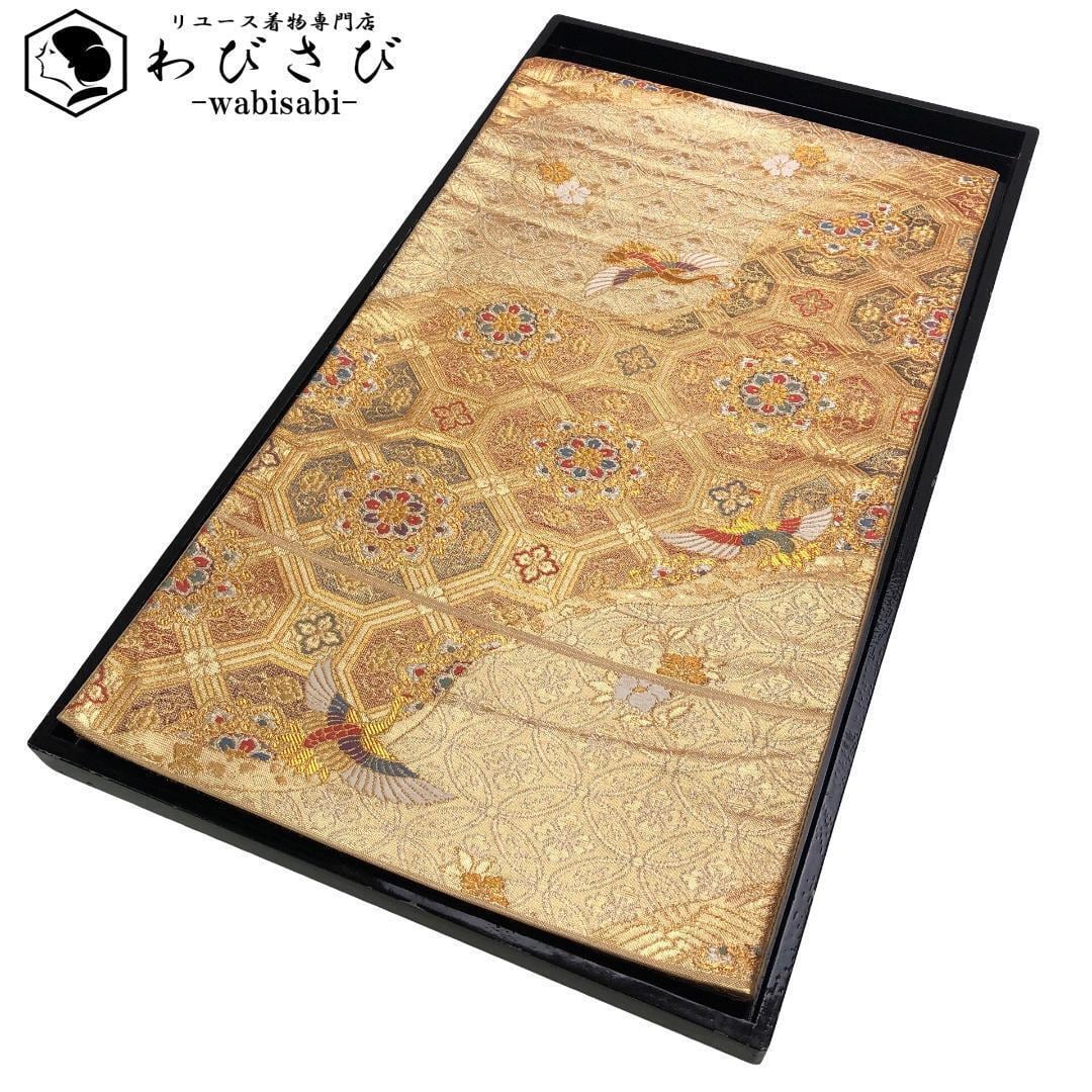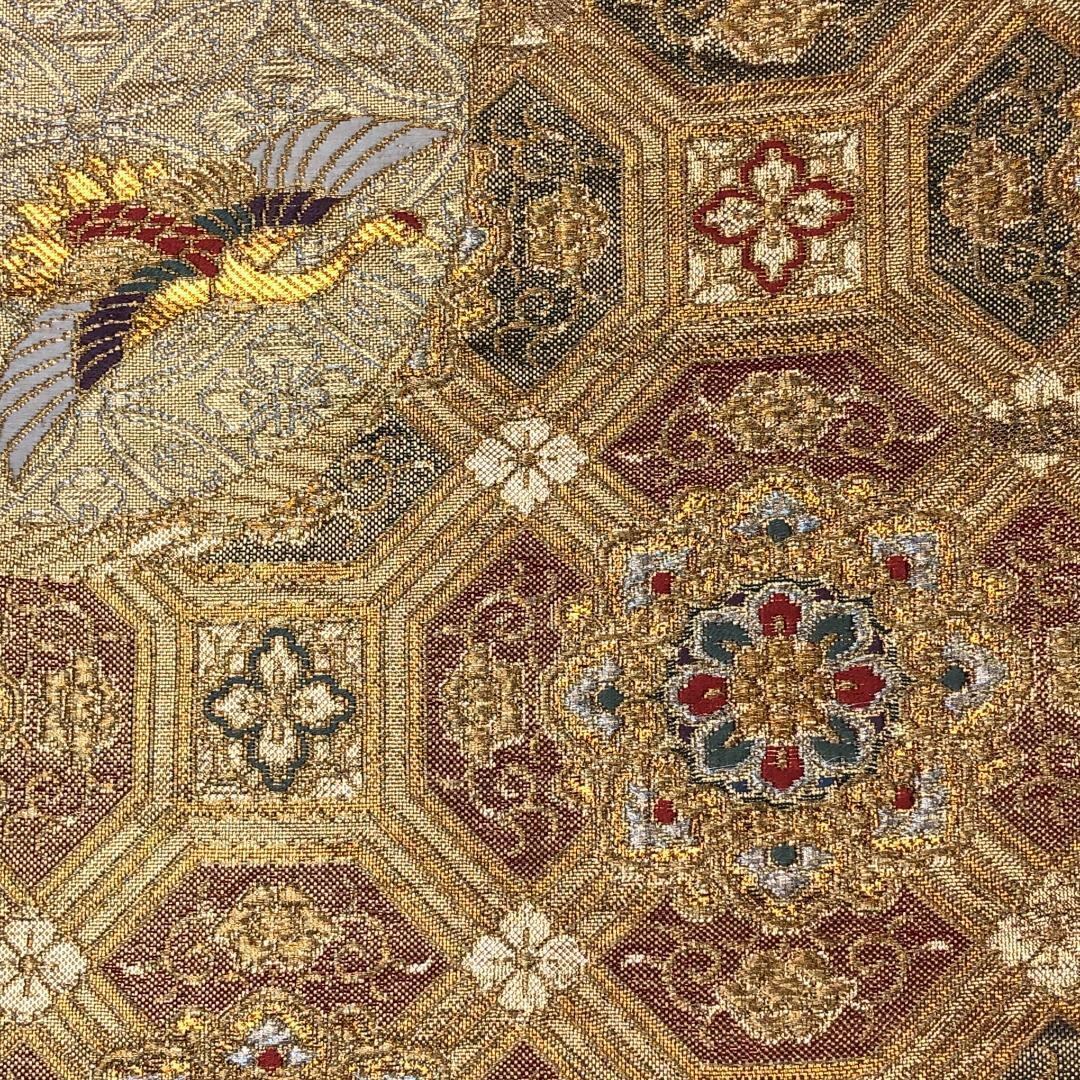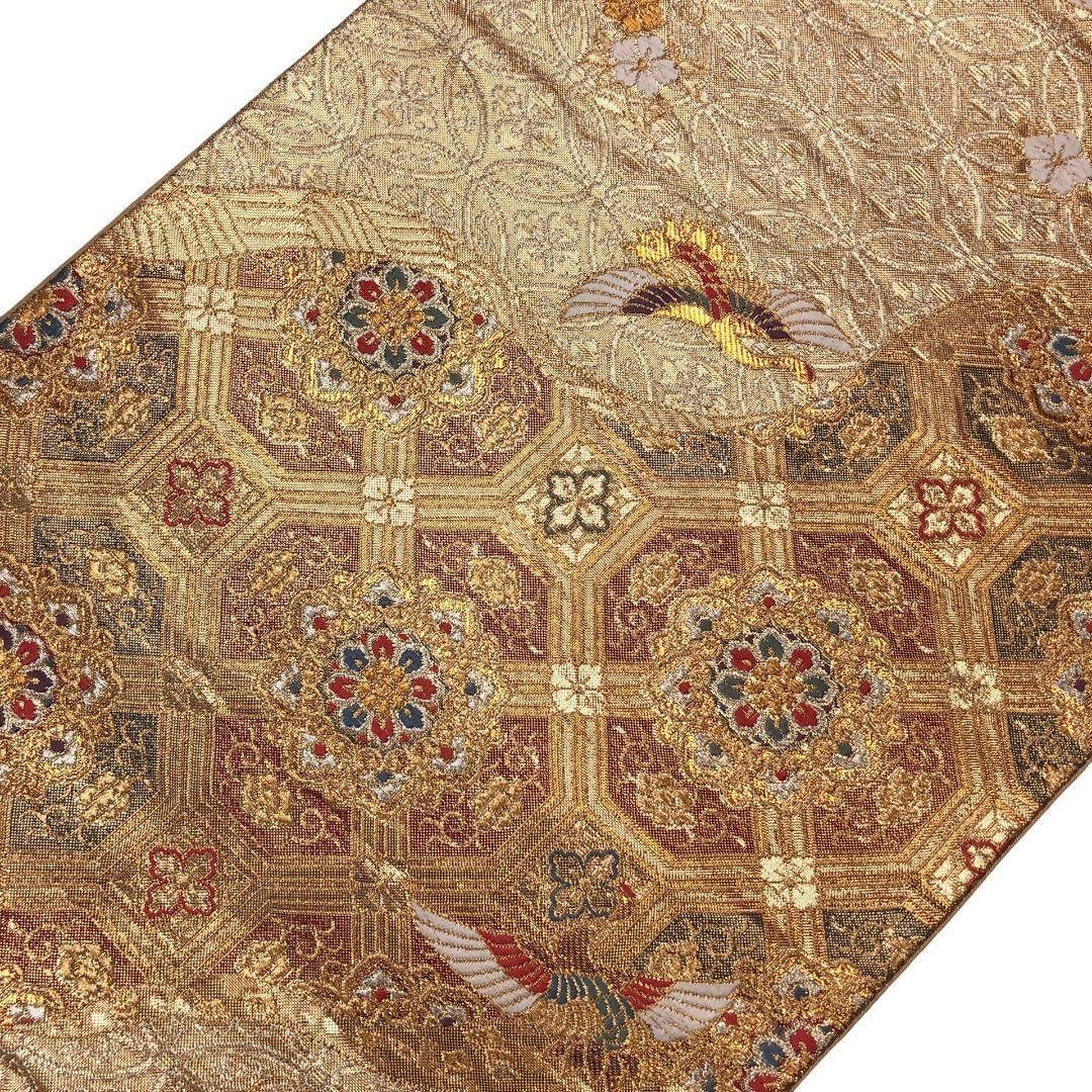 金色ベースの煌びやかなお色味に美しい華柄模様、七宝模様、鶴などがデザインされた素敵なお品でございます。