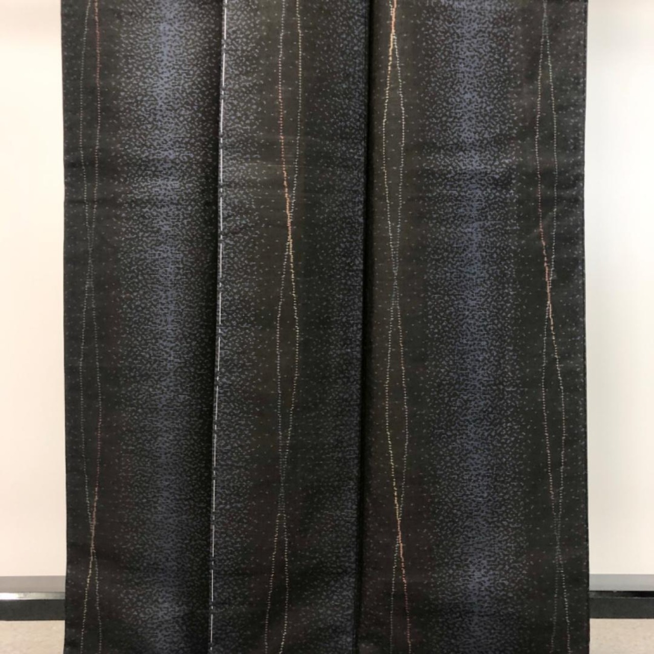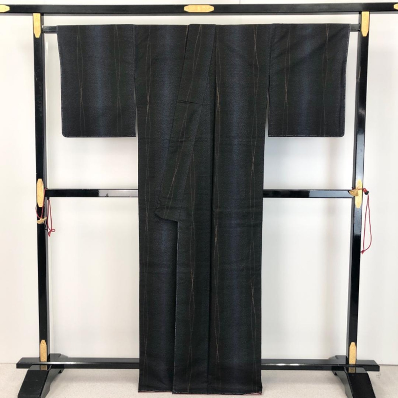 黒色ベースのお色味にモダンな縦縞模様の柄裄がデザインされた素敵なお品でございます。
